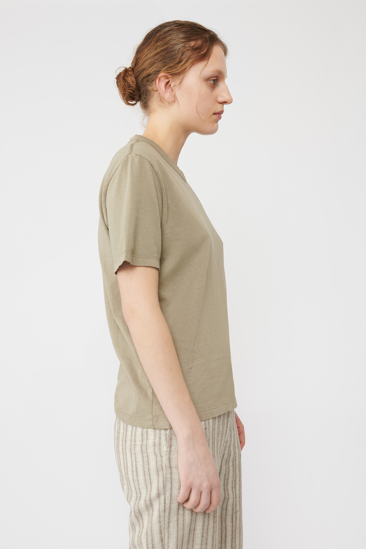 Our Square T-Shirt in Mud Army Jersey. Produced in a soft Portuguese cotton jersey, the womens Square T-Shirt has a relaxed, boxy fit and a v-neck bound collar.