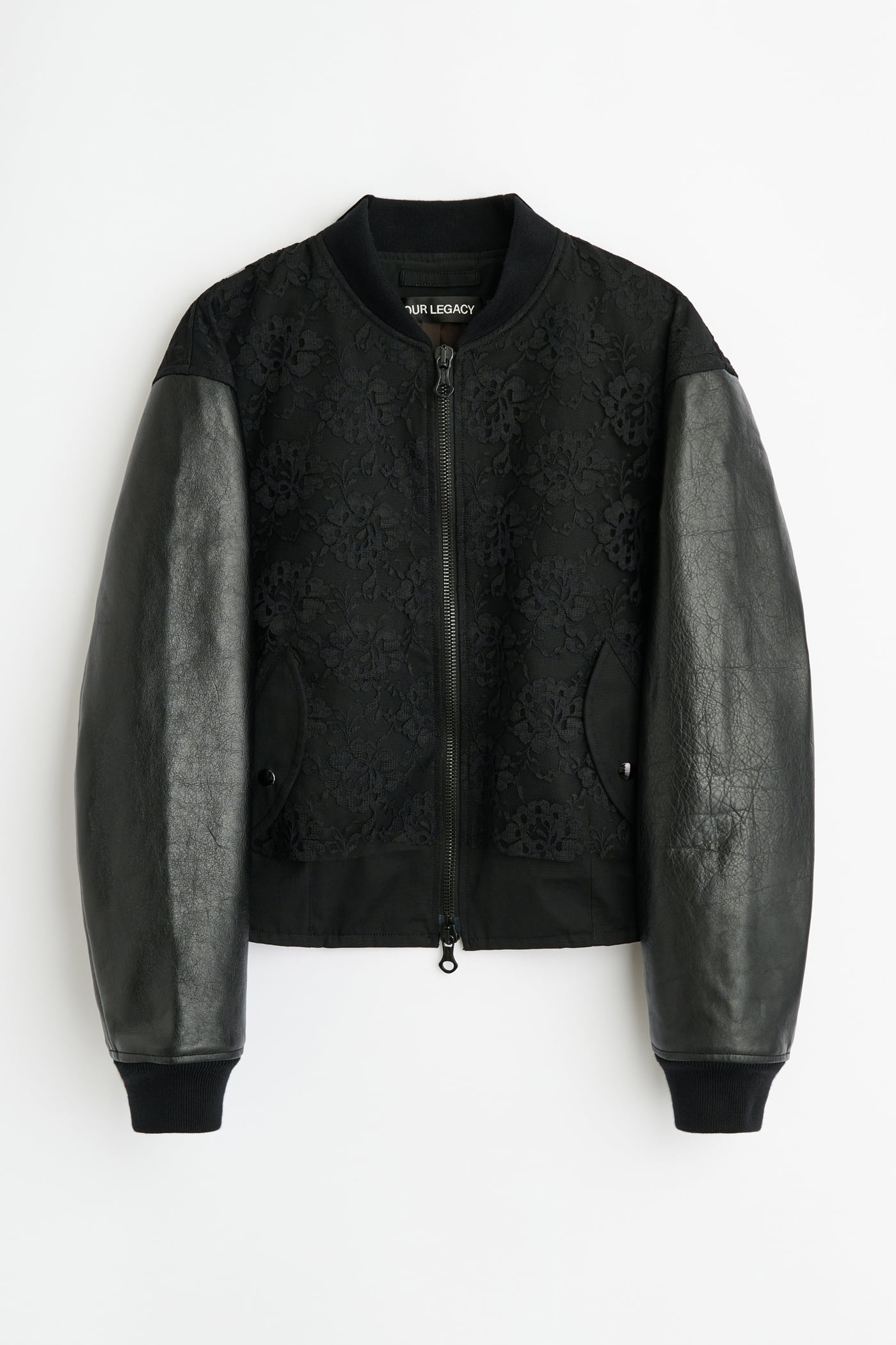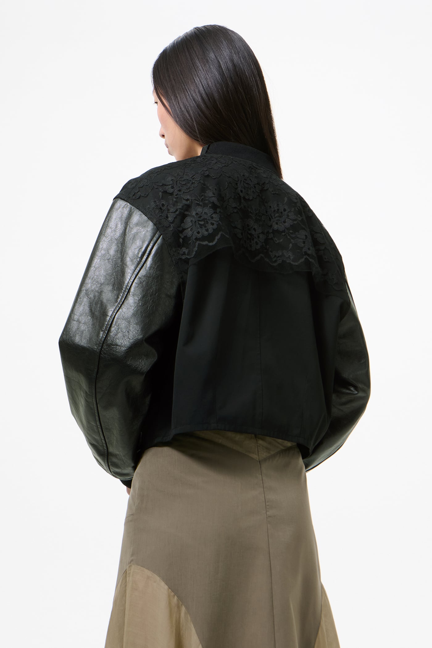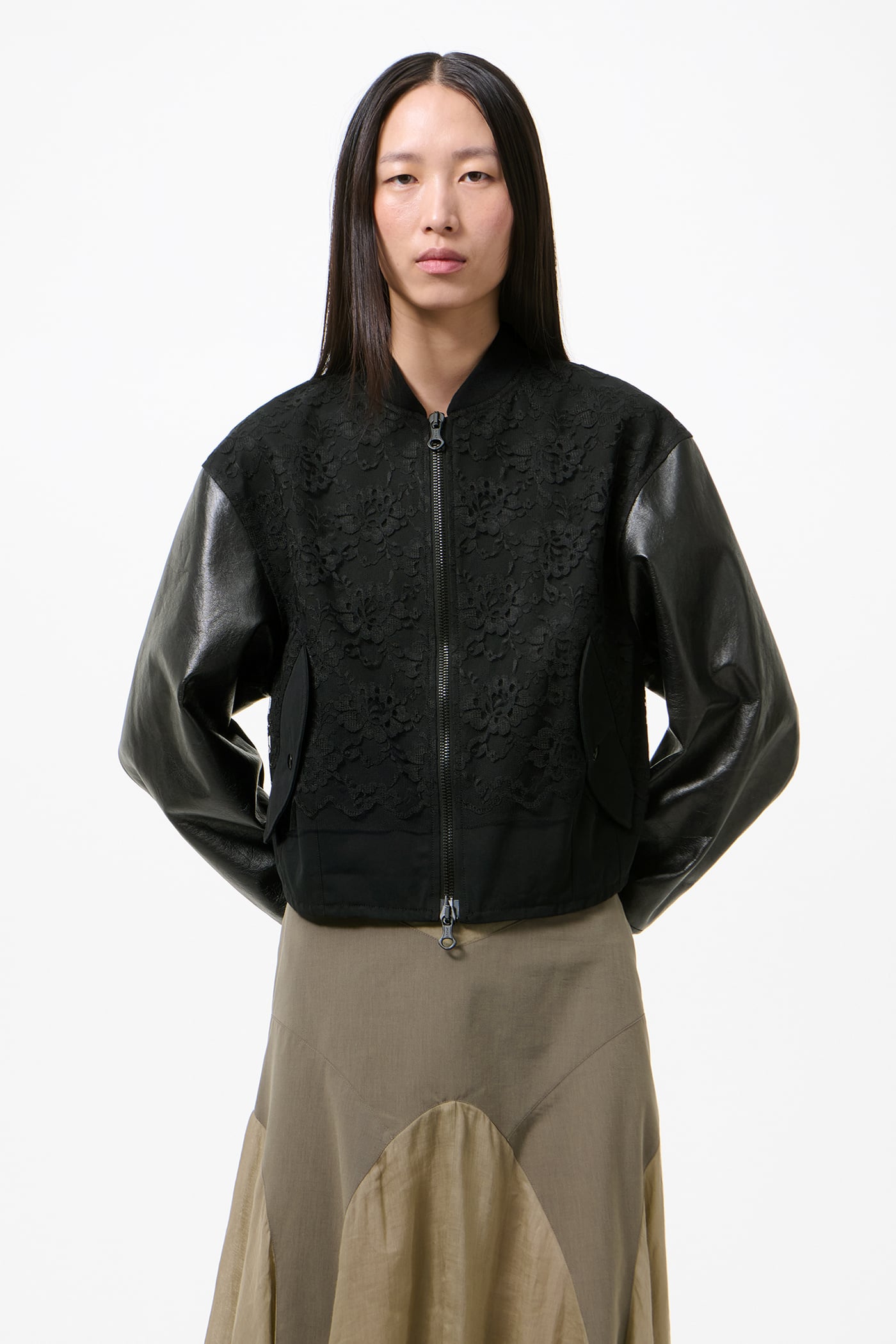 Our Stage Bomber in Studio Black Micro Canvas. Produced in Italian cotton micro canvas, this premium micro canvas is defined by its dense, fine weave, offering a natural hand with a durable, structured feel. The Stage Bomber has a shaped silhouette finishing at the high hip and features lace panels at the front and back, a darted hem in place of a classic rib, leather sleeves, ribbed sleeve cuffs and a ribbed neck trim with belt loops for styling with a scarf. Fully lined, it is cut with a slightly shorter back and longer front, and includes shaped pocket flaps referencing classic bombers.