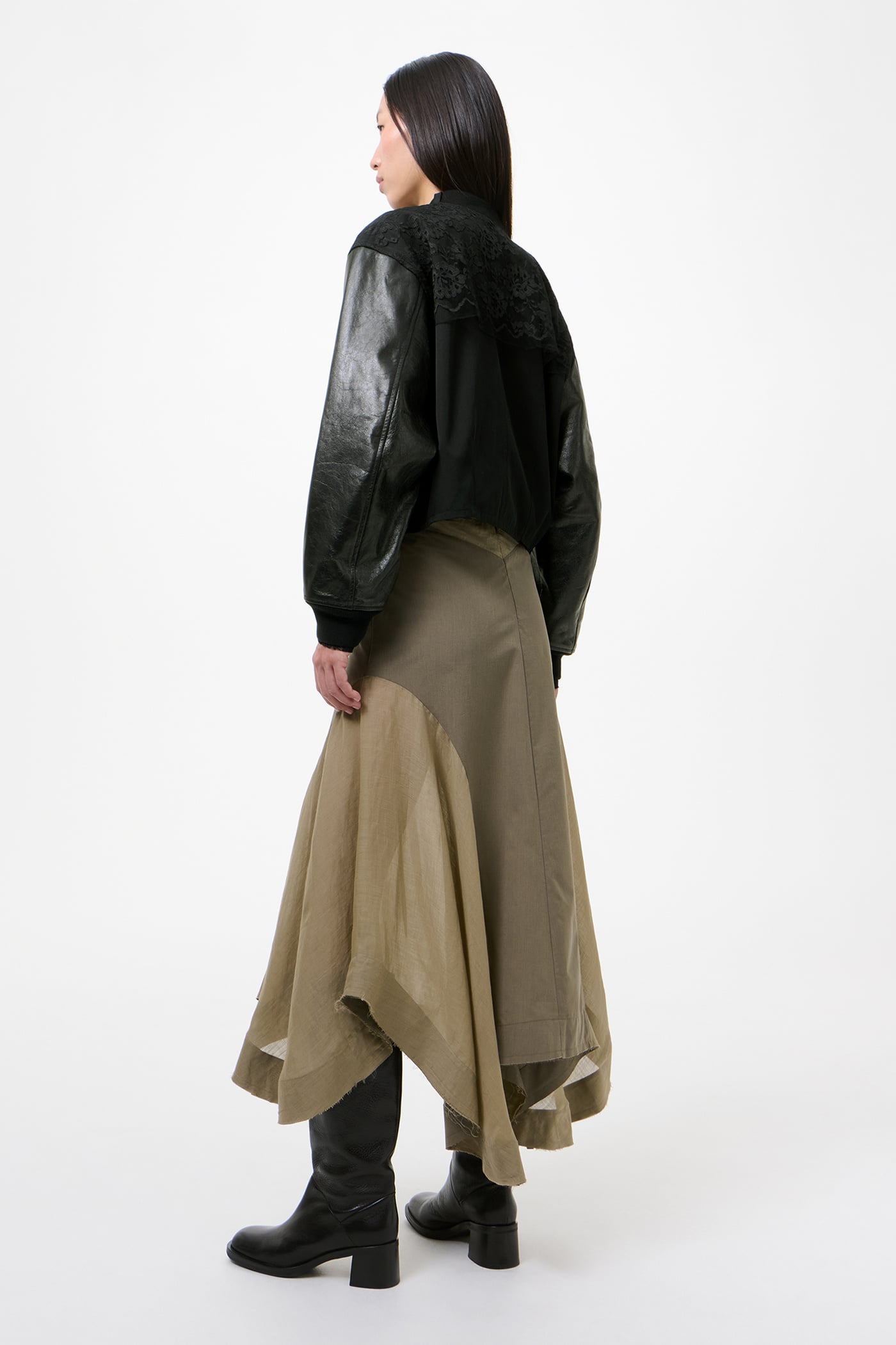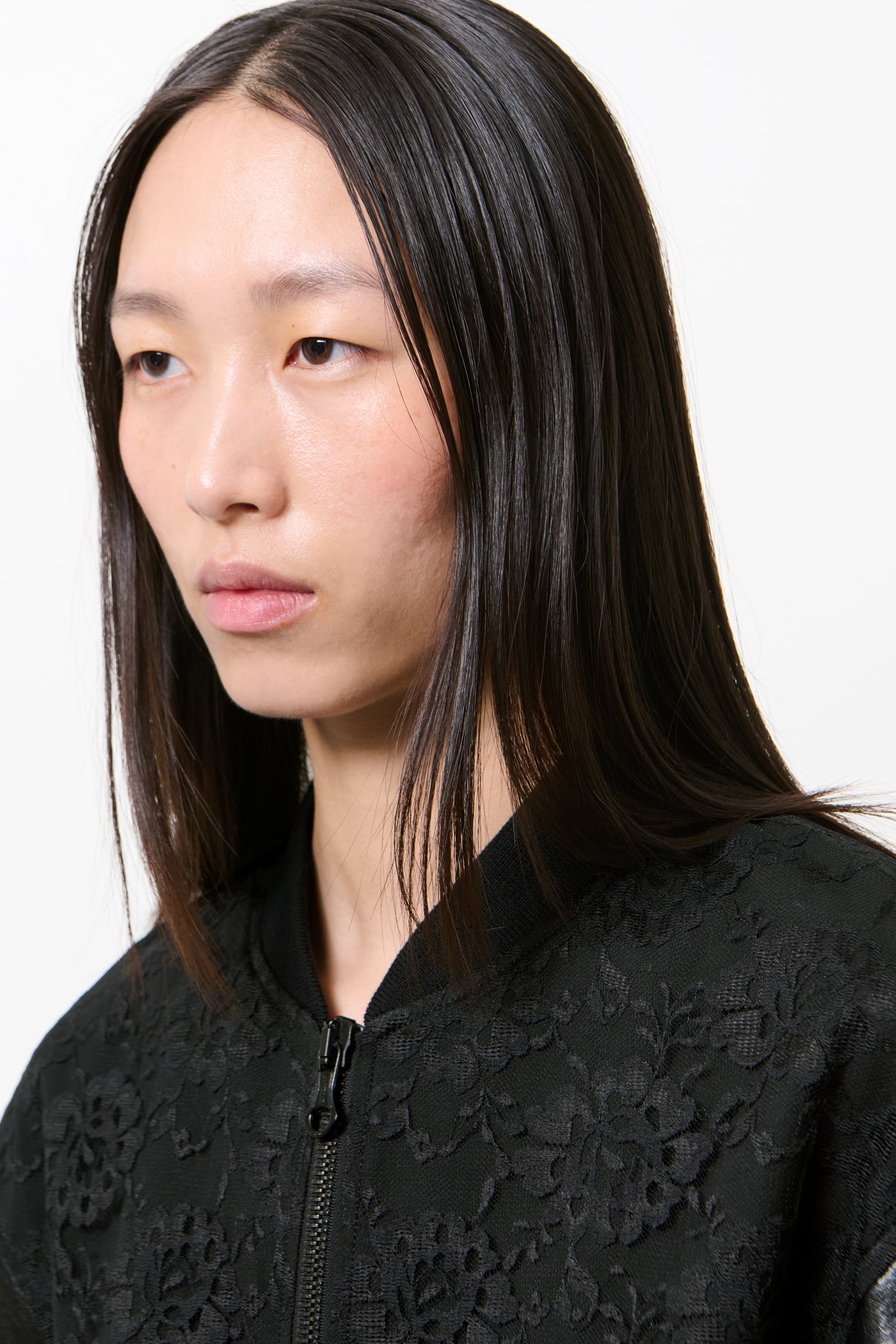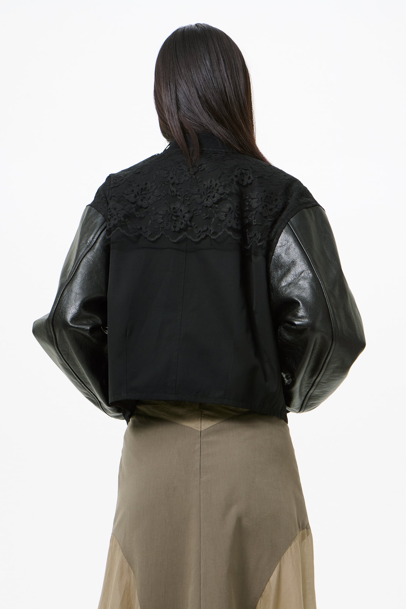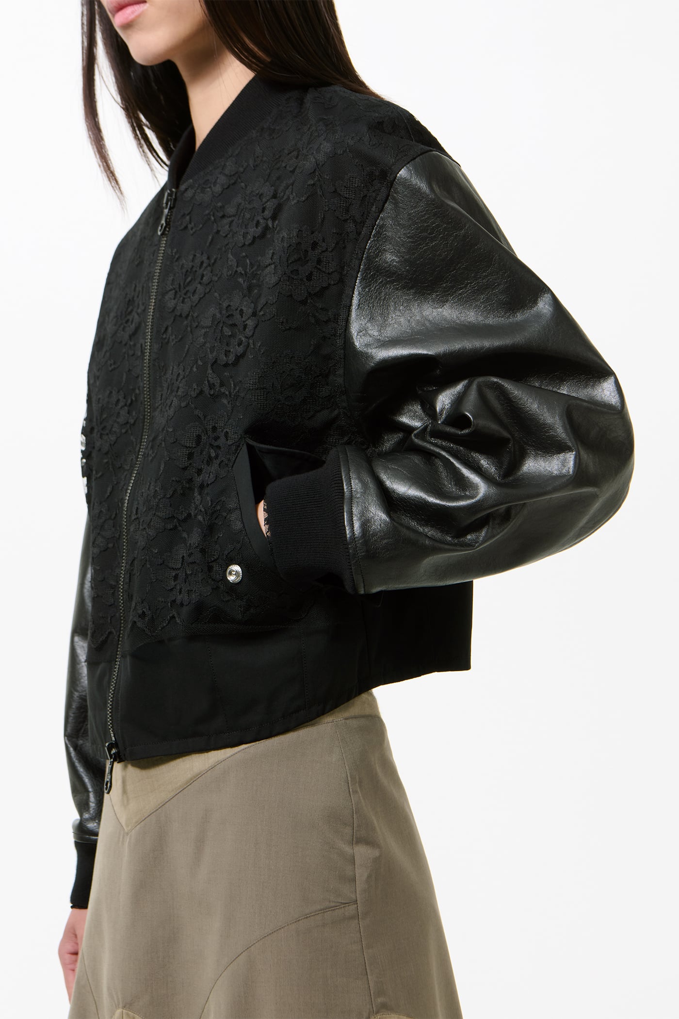 Our Stage Bomber in Studio Black Micro Canvas. Produced in Italian cotton micro canvas, this premium micro canvas is defined by its dense, fine weave, offering a natural hand with a durable, structured feel. The Stage Bomber has a shaped silhouette finishing at the high hip and features lace panels at the front and back, a darted hem in place of a classic rib, leather sleeves, ribbed sleeve cuffs and a ribbed neck trim with belt loops for styling with a scarf. Fully lined, it is cut with a slightly shorter back and longer front, and includes shaped pocket flaps referencing classic bombers.