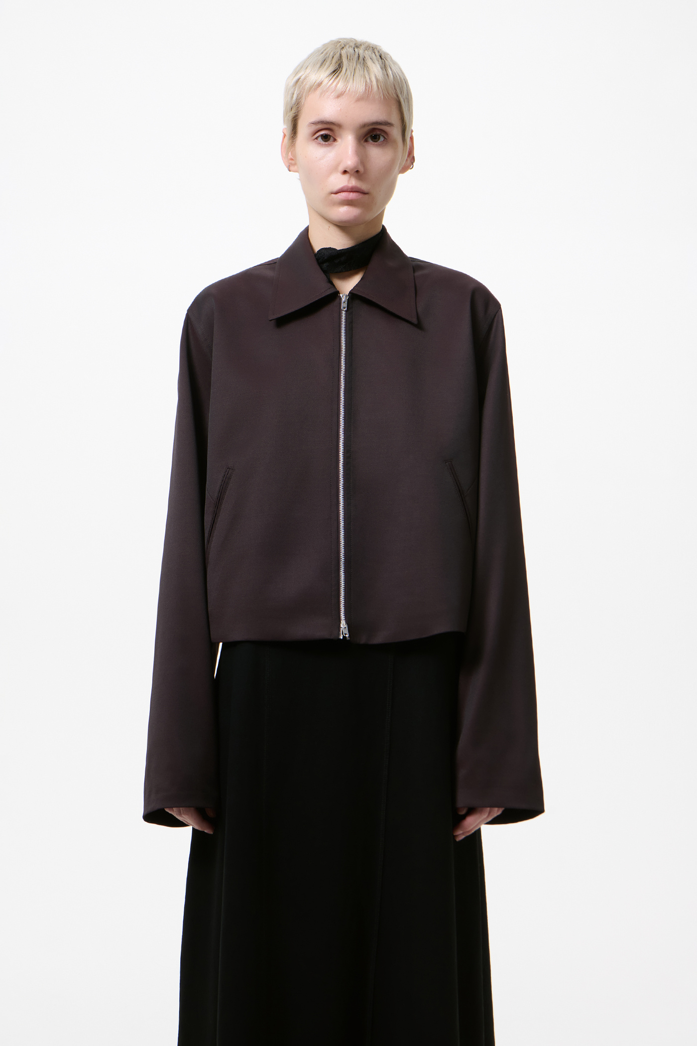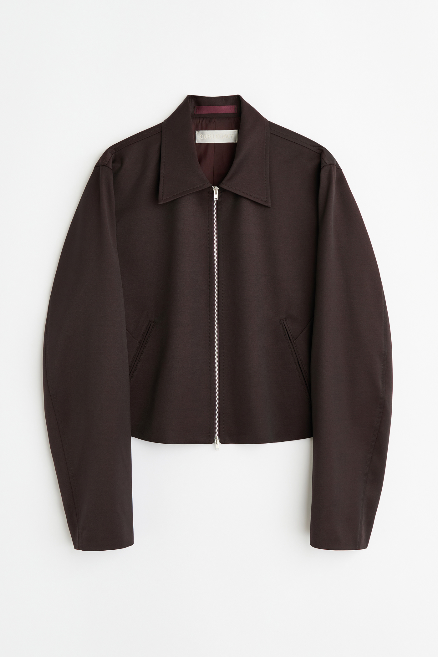 Our Statue Jacket in Crushed Grape Formflex Weave. Produced in an Italian fabric combining polyester, virgin wool, and elastane, the Statue Jacket has a boxy and slightly cropped fit and features a full lining, a RiRi two-way zip, jet pockets with darts for slight shaping, and a shaped hem detail with the back shorter than the front.