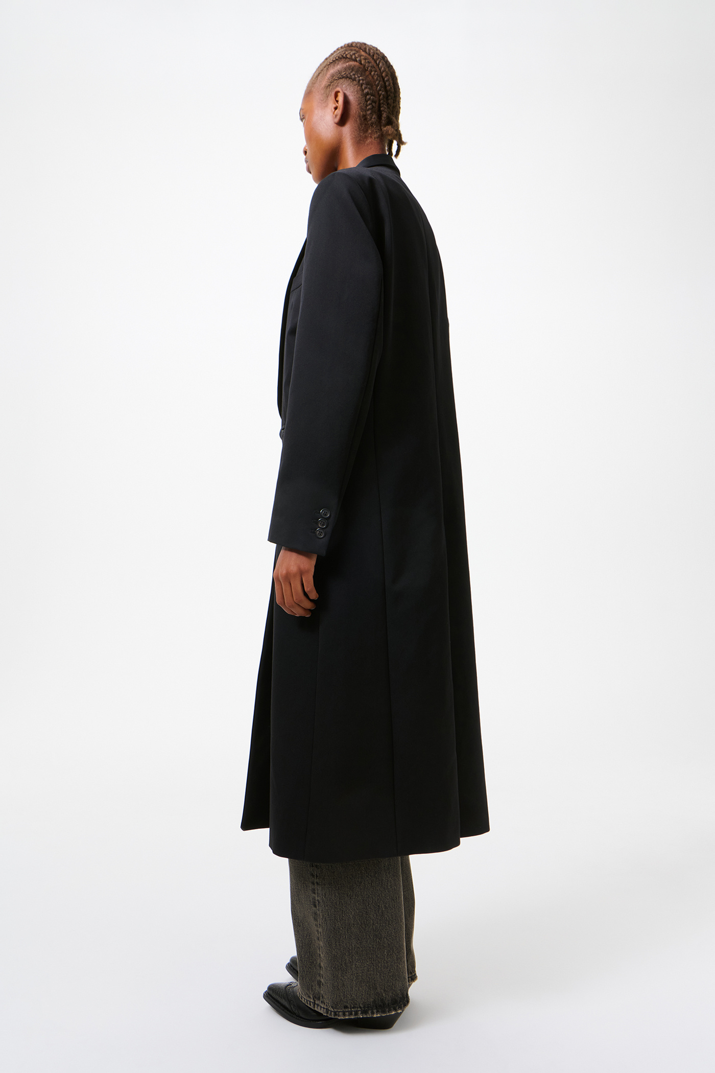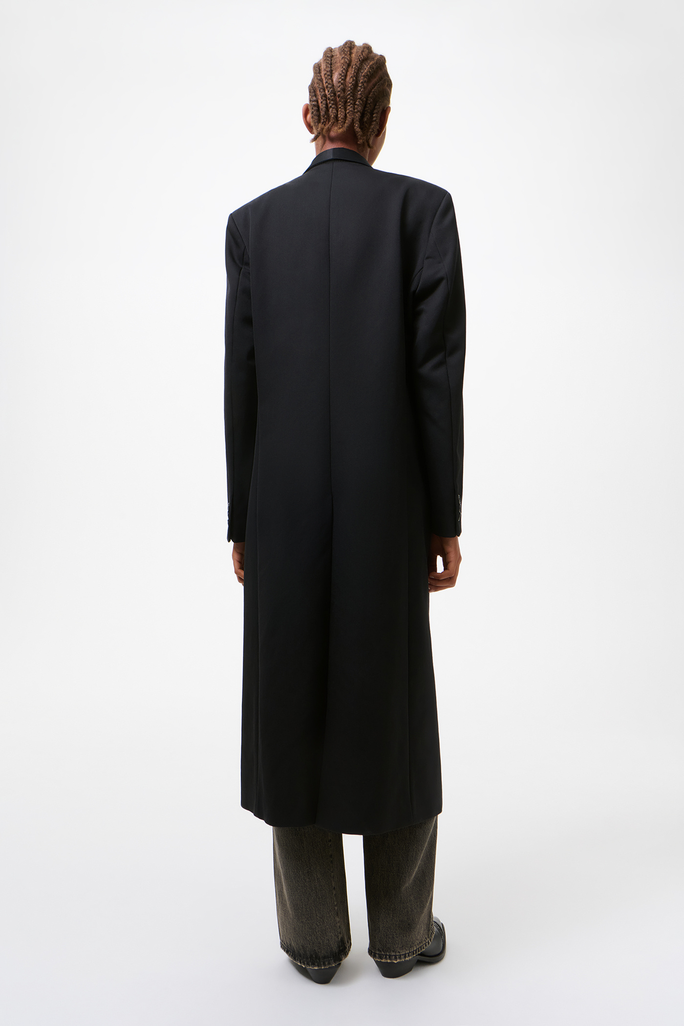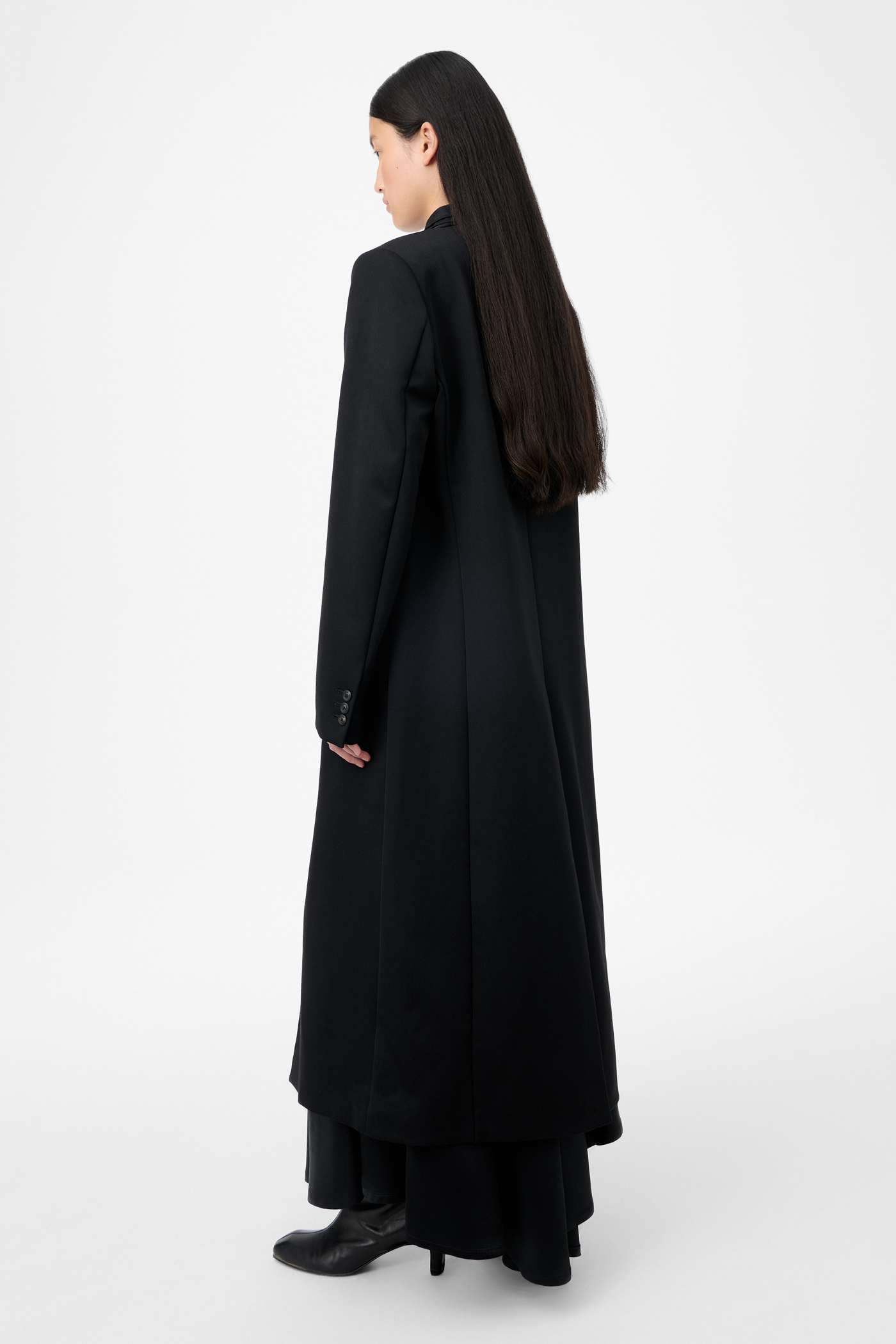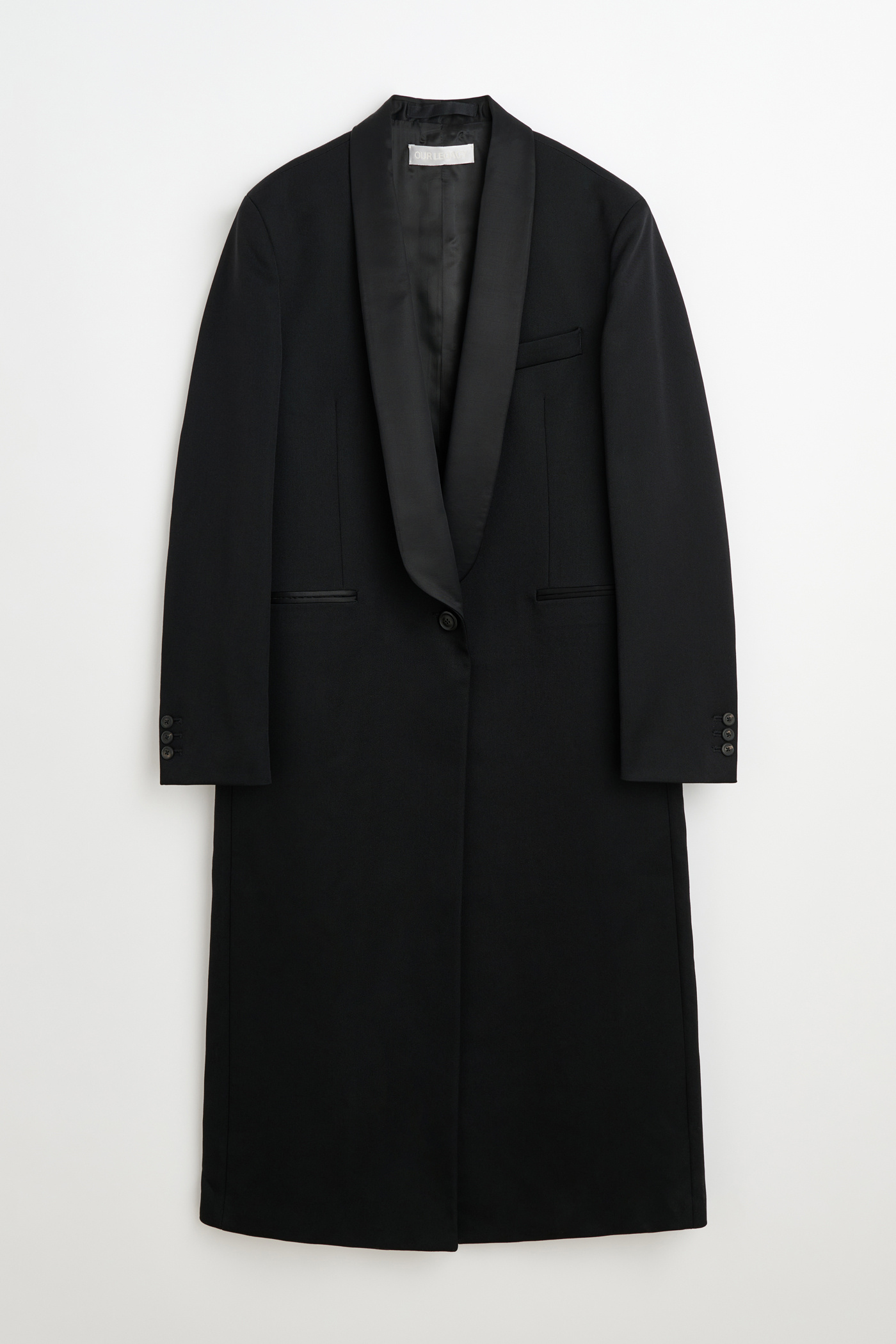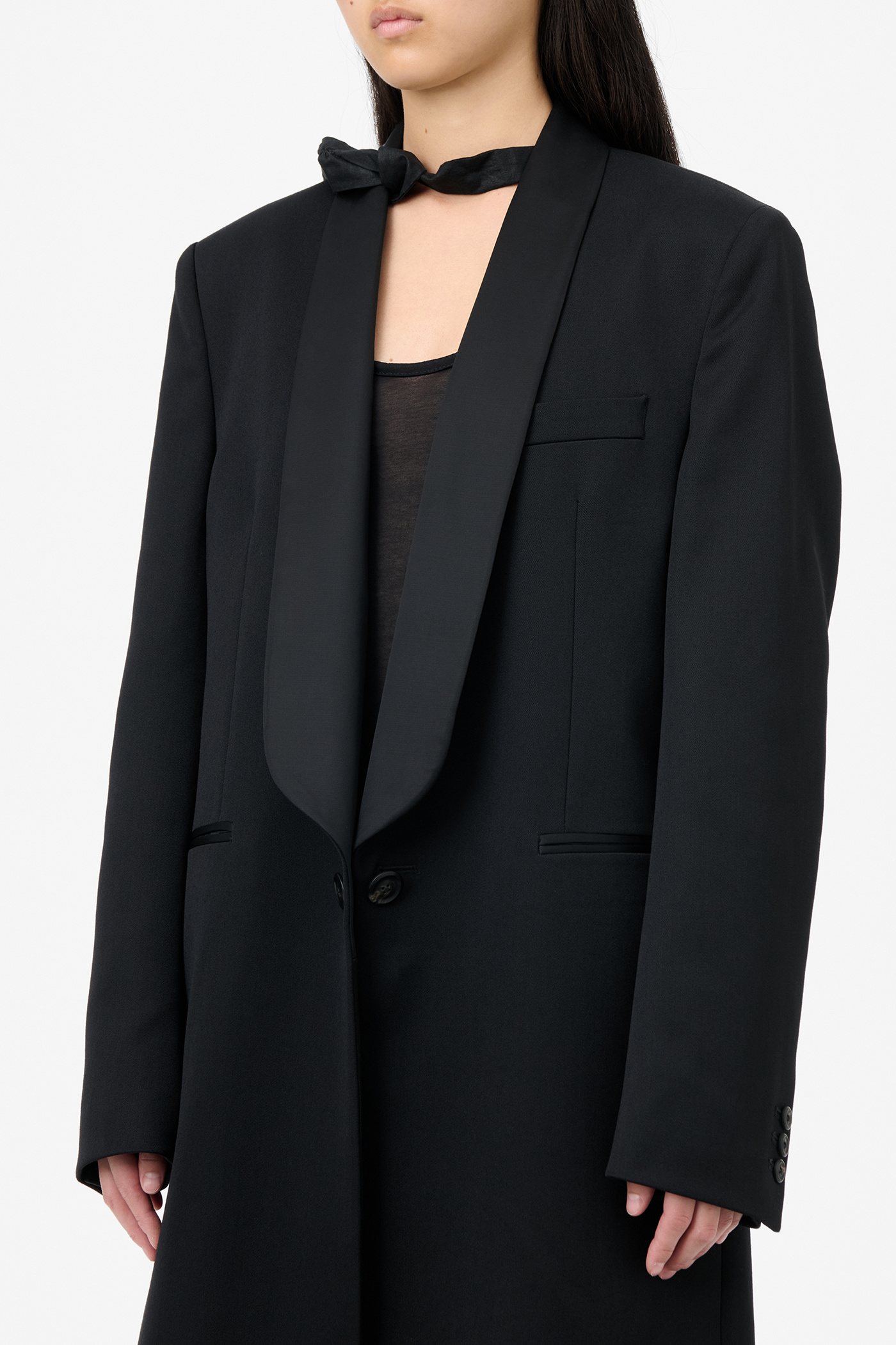 Our Supper Coat in Onyx Black Tech Sateen. Produced in Italian polyamide fabric and wool with water repellent finish, the women's Supper Coat has an oversized, longer fit with a slight cinch at the waist and features a single breasted design, tuxedo shawl lapel, padded shoulders, horn buttons, full lining, link button fastening, jet pockets and a single back vent.