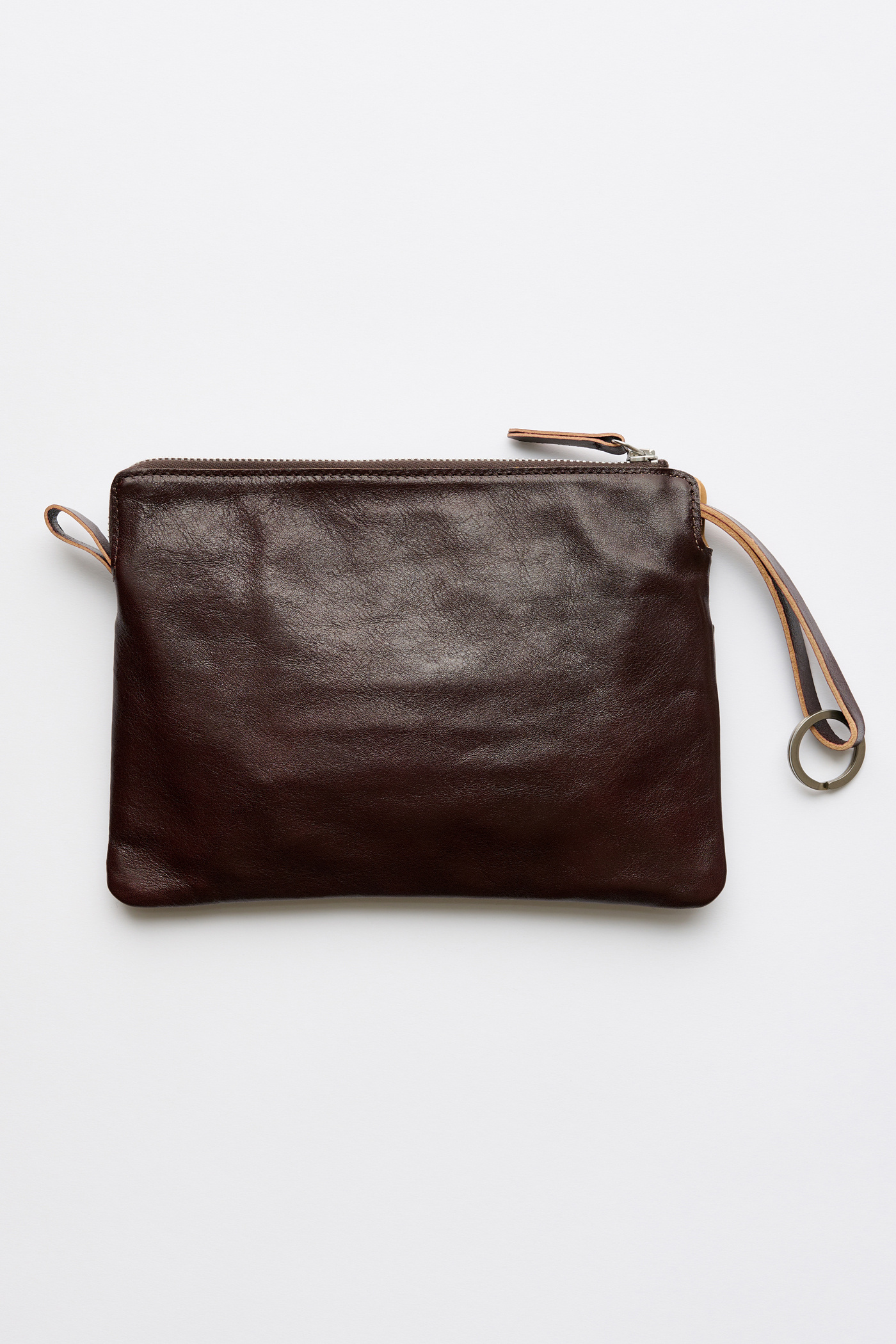 Our Supporter Organizer in Deep Abyss Red Leather. Produced in Italian calf leather, the Supporter Organizer is a small clutch style bag and features a zip closure, an external side pocket, an internal card holder, a metal Our Legacy rivet and a leather wrist strap with an engraved W ring.