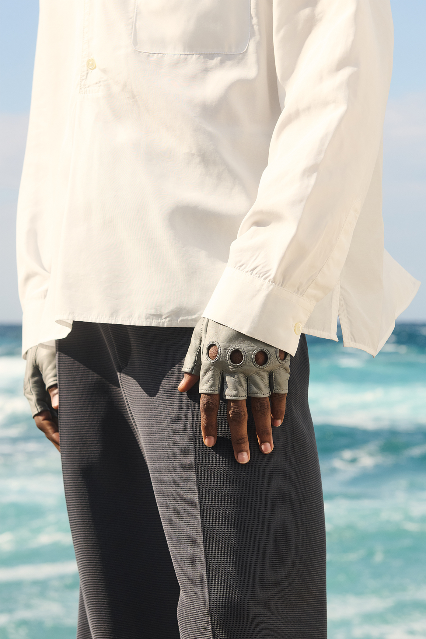 Our Taglio Glove in Sgroppino Leather. Produced in premium Italian lamb leather, these fingerless gloves feature practical cut-off fingers, ventilation holes for knuckles, a secure strap with snap button closure, and an elasticated hem for a comfortable fit. The gloves are subtly accented with embossed Emporio Armani logos.