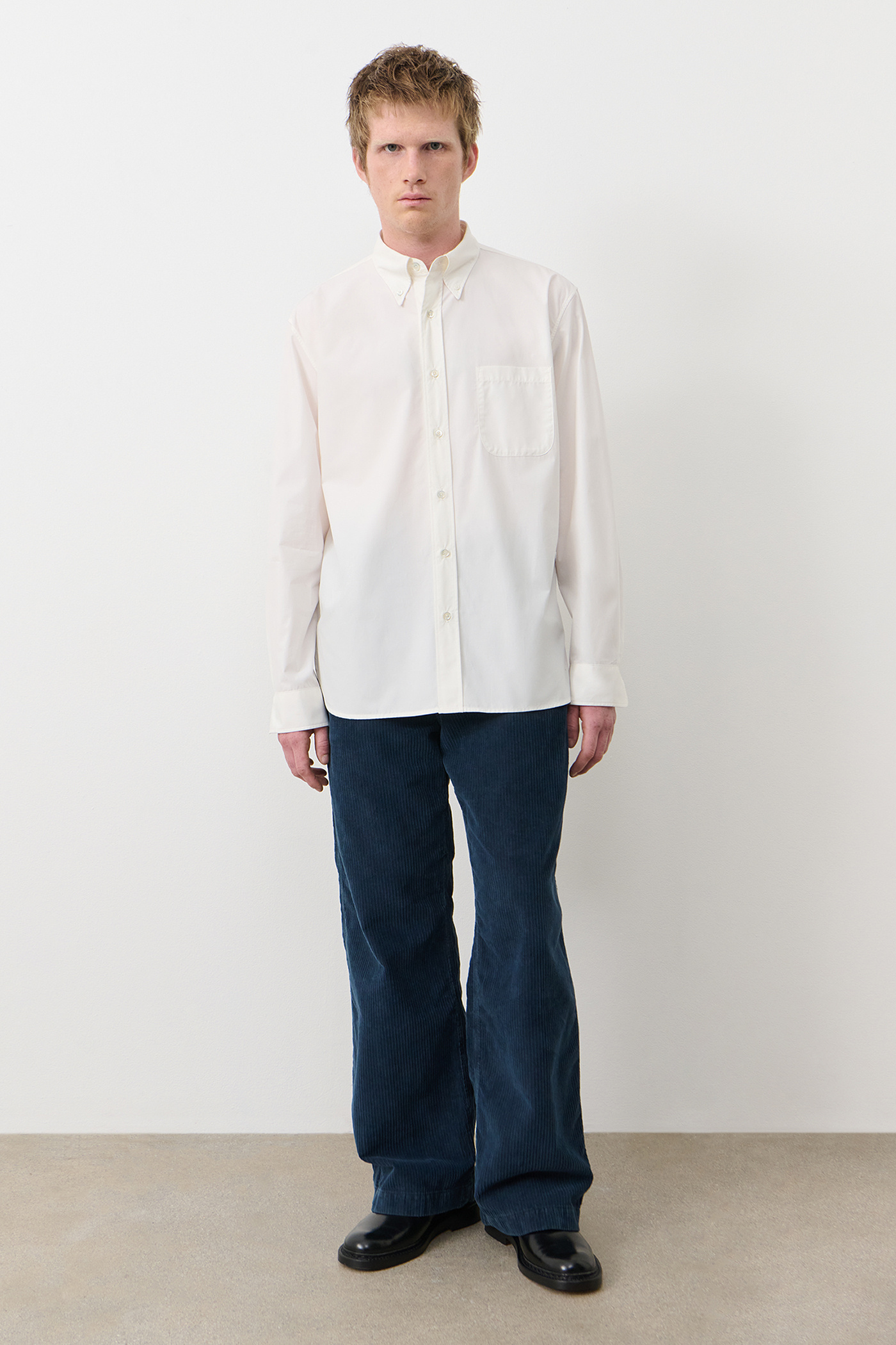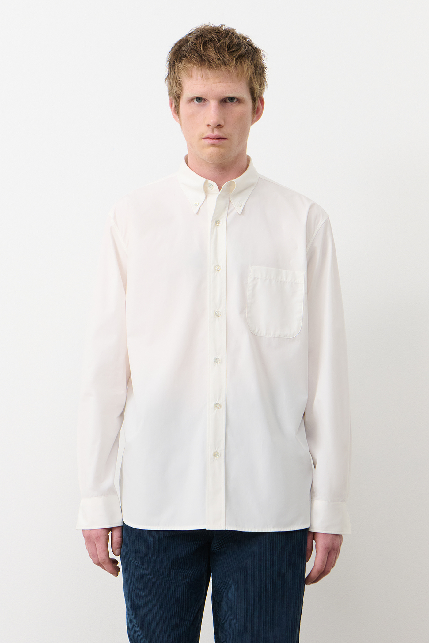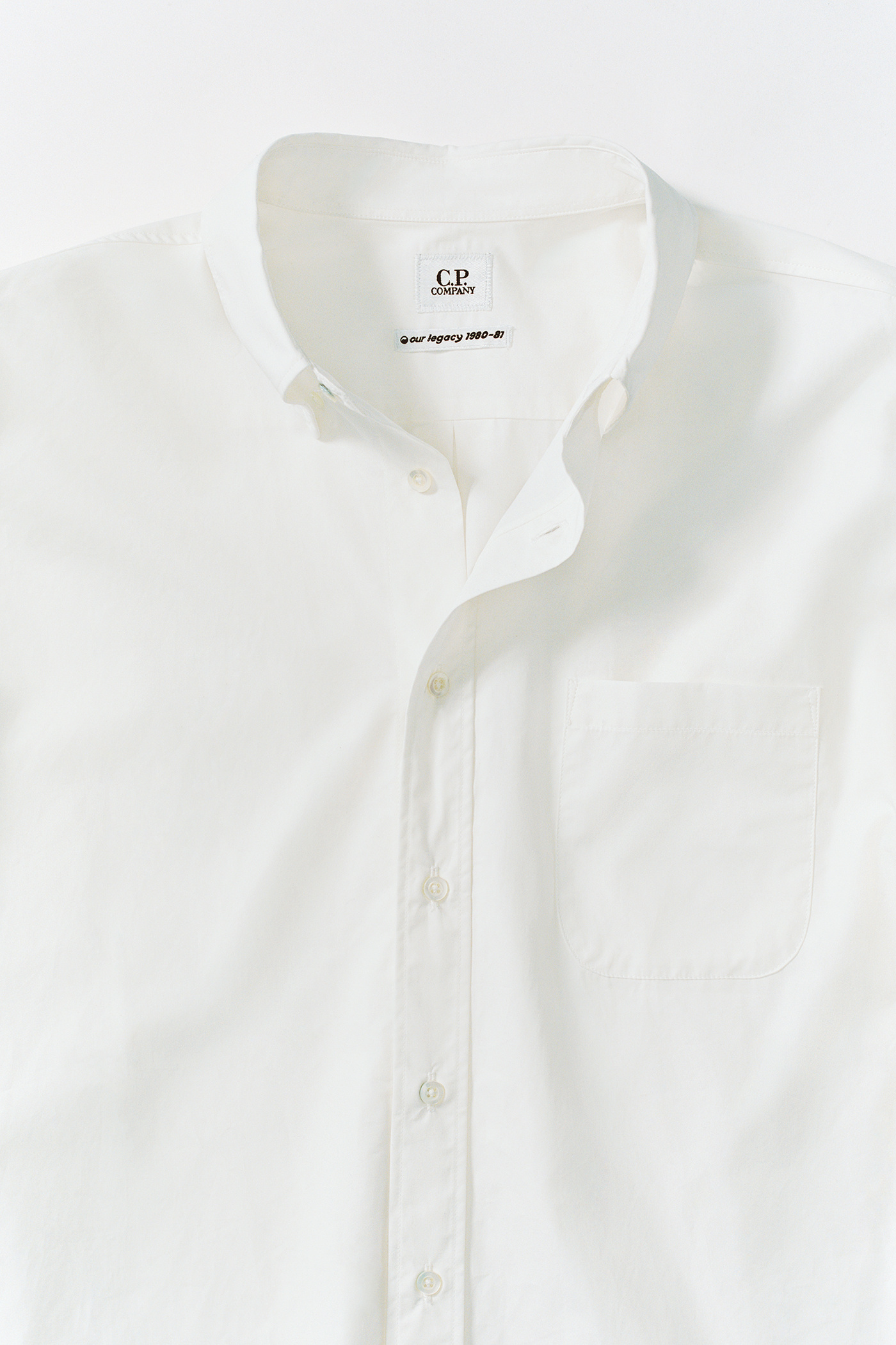 Tailored Shirt in Gauze White. Tailored shirt crafted from Italian cotton poplin for the collaboration between Our Legacy Work Shop and C.P. Company. Designed through research in the C.P. Company archive, Tailored Shirt is referencing a signature archival collar with a rear collar point from the Massimo Osti-era translated to a classic Our Legacy shirting fit. Features a button-down collar, rear collar button, mother of pearl buttons, chest pocket and adjustable button cuffs. Regular fit.