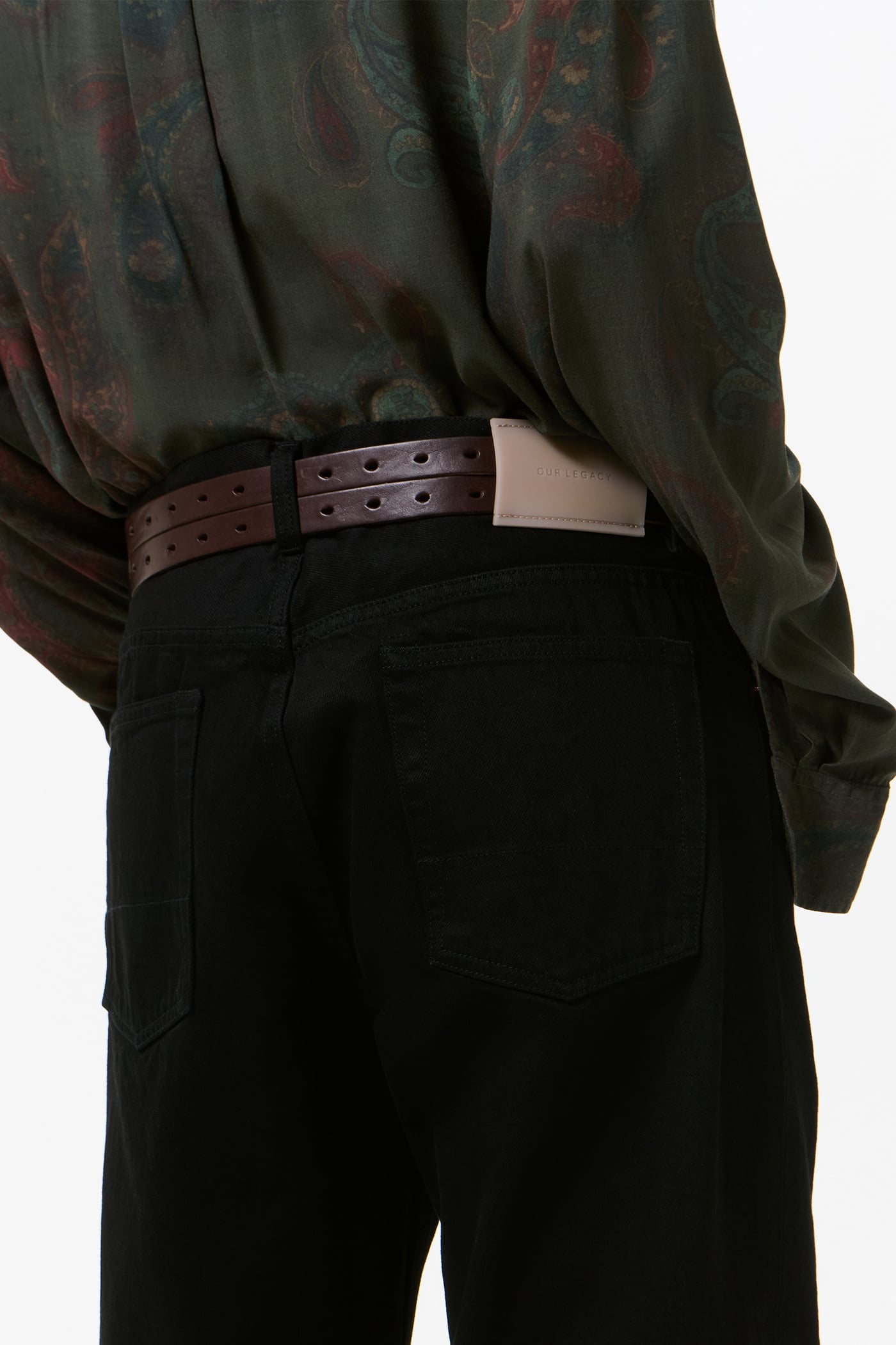Our Third Cut Jeans in Black Selvedge. Produced in a pigment dyed Italian selvedge denim, the mens Third Cut jeans have a relaxed, wide legged fit and feature a YKK zip fly, metal rivets and reinforced back pockets.