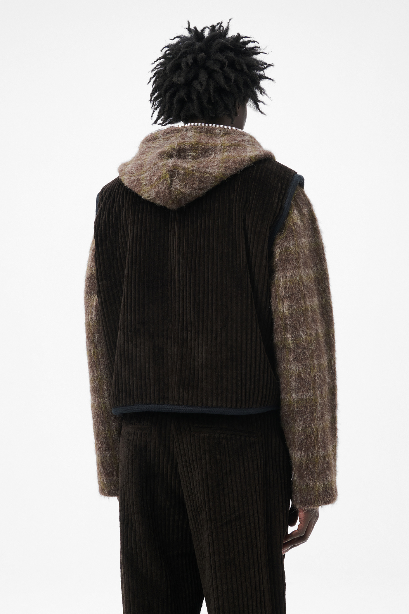 Our Top Vest in Profound Brown Mammoth Cord. Produced in Italian heavy corduroy fabric, the men's Top Vest has a boxy, cropped fit and features faux shearling lining, a two-way Lampo zip, a single welt breast pocket and a sleeveless construction.