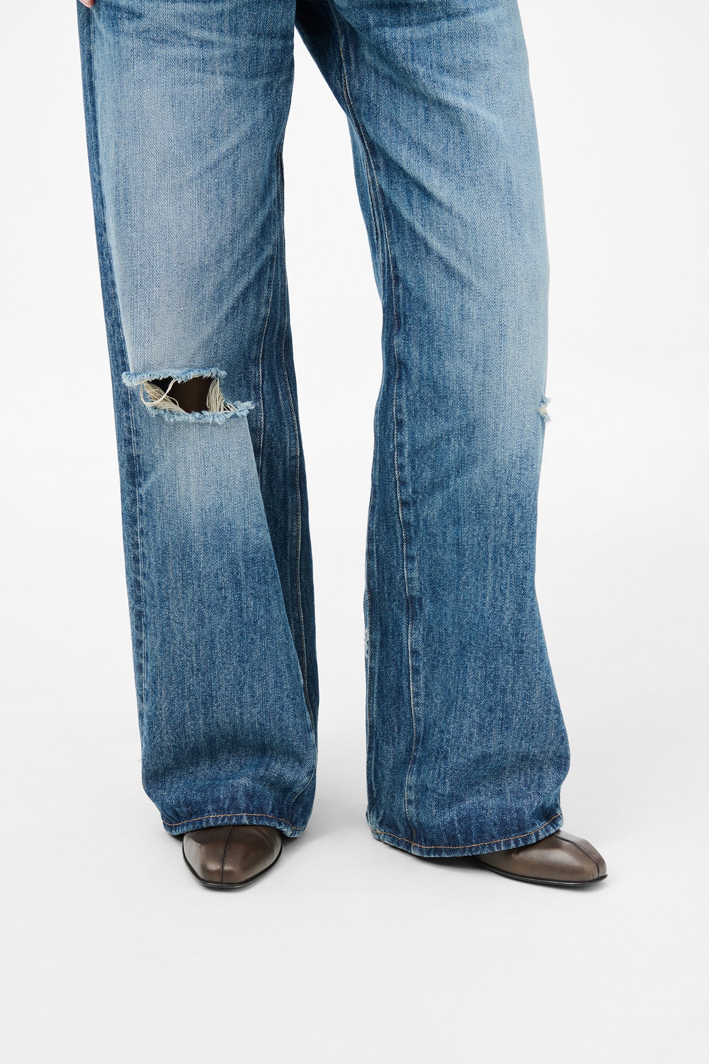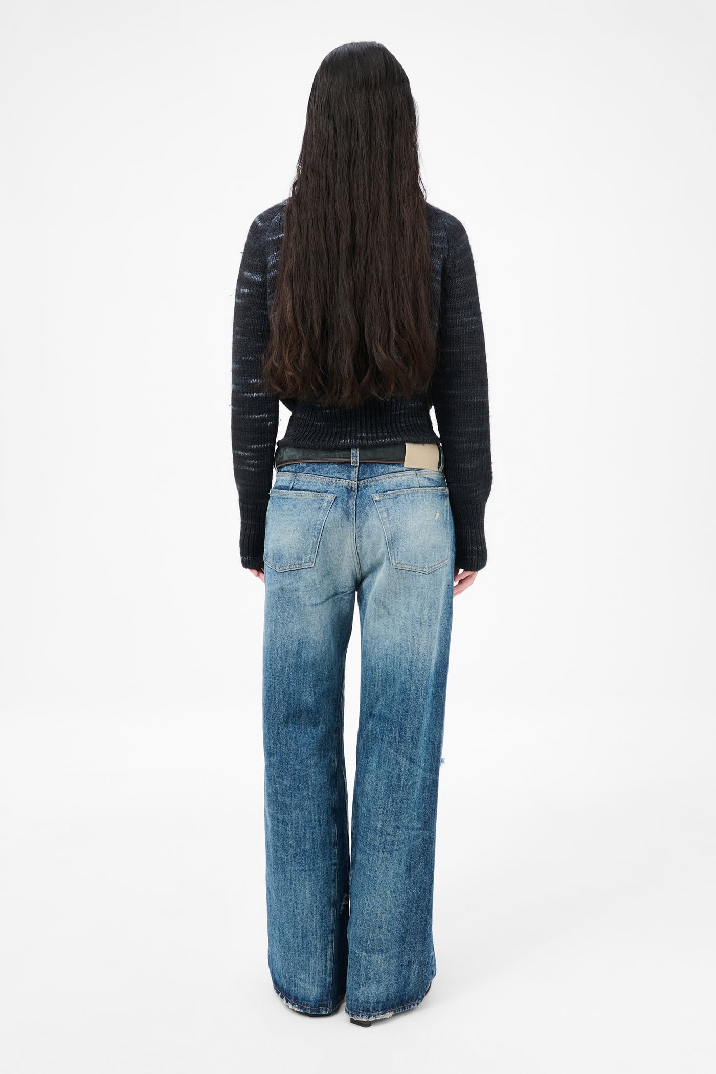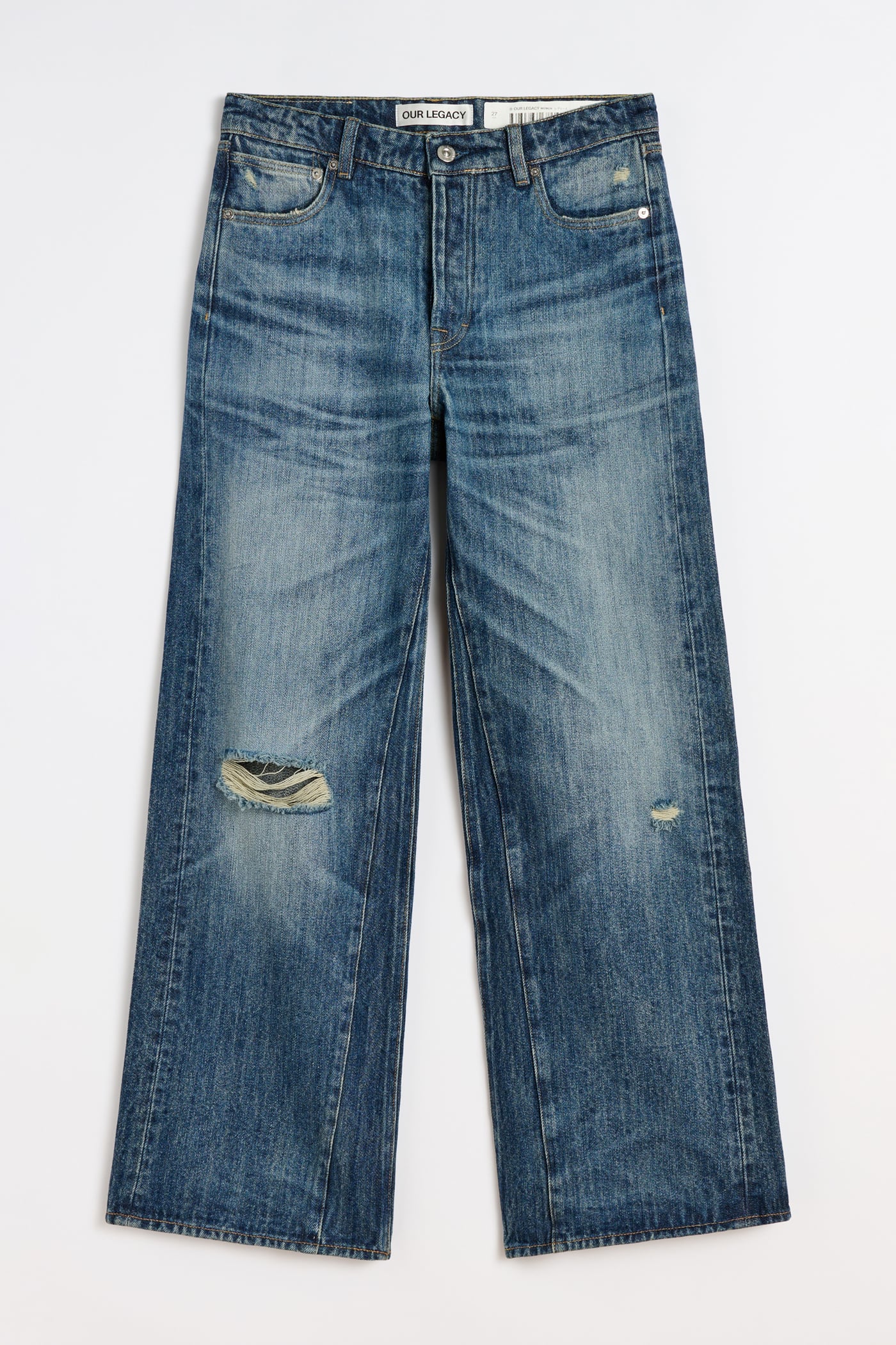 Our Treble Cut in Road Worn Rope Twill. Produced in Italian cotton hemp rope twill fabric, the women's Treble Cut has a slouchy, wide leg fit that sits above the hip and features indigo dyeing, vintage washing, hand-distressed fading, a button fly, paneled inseam, five pockets, and an OUR LEGACY embossed patch.