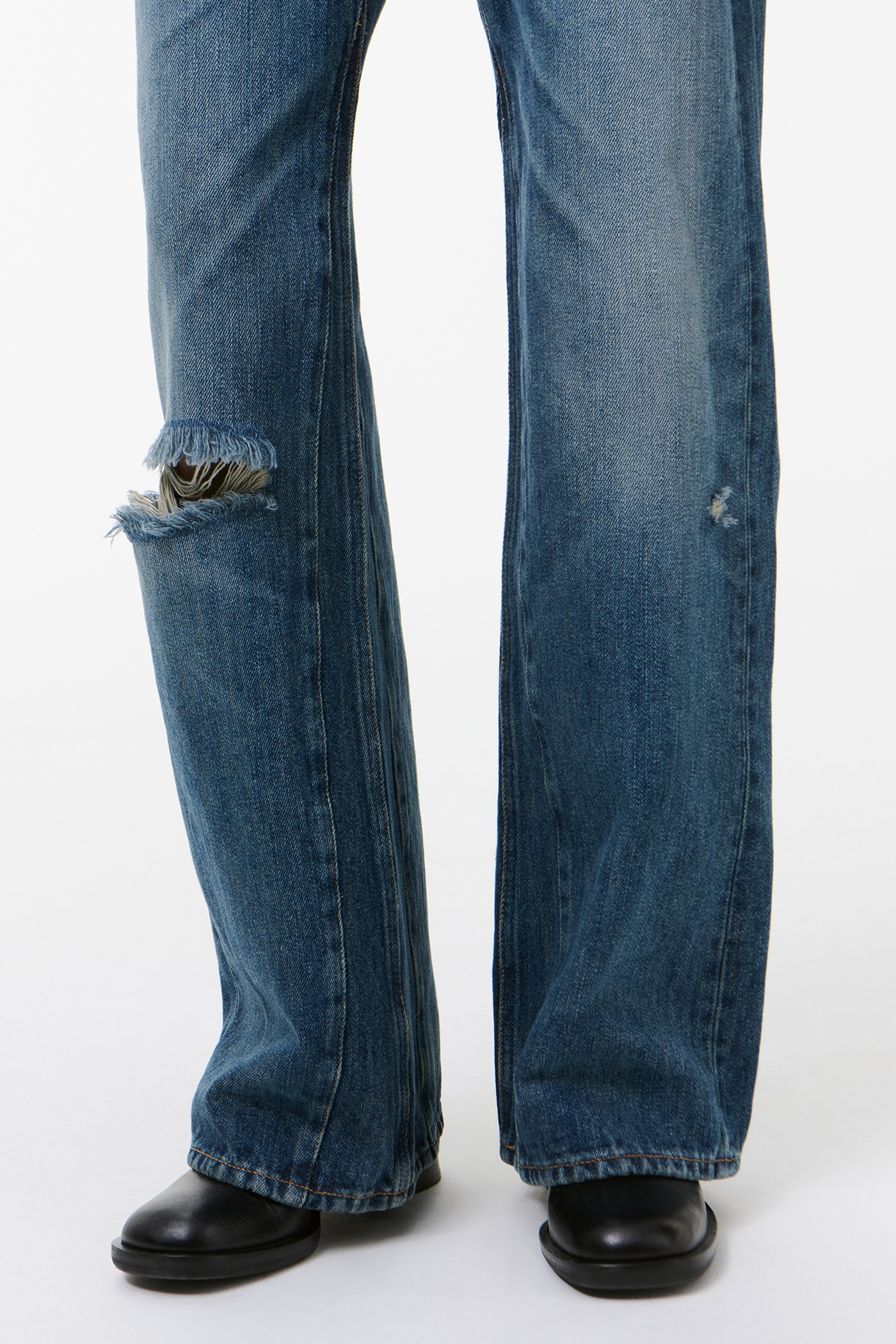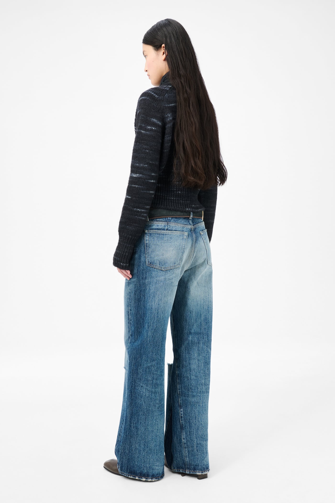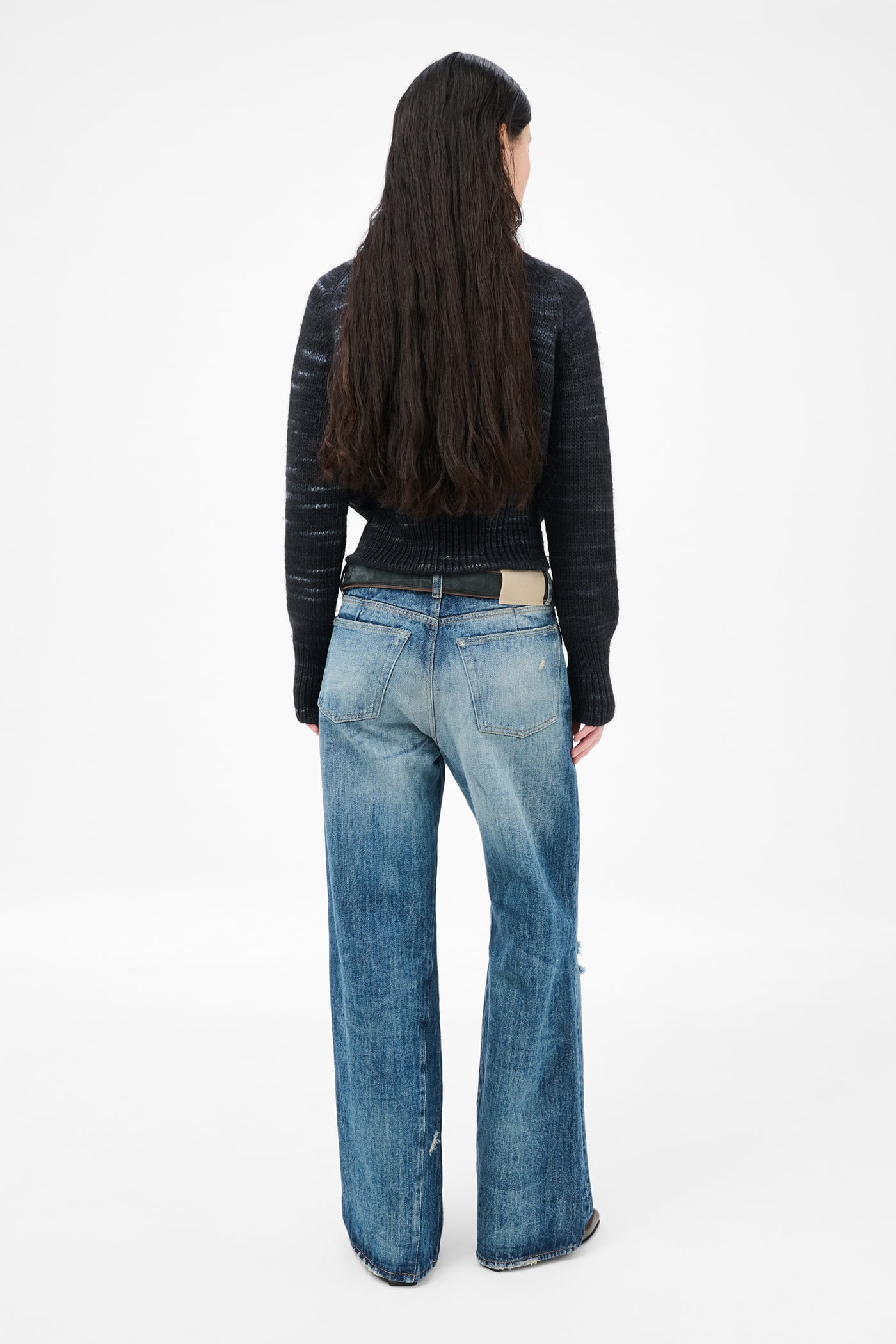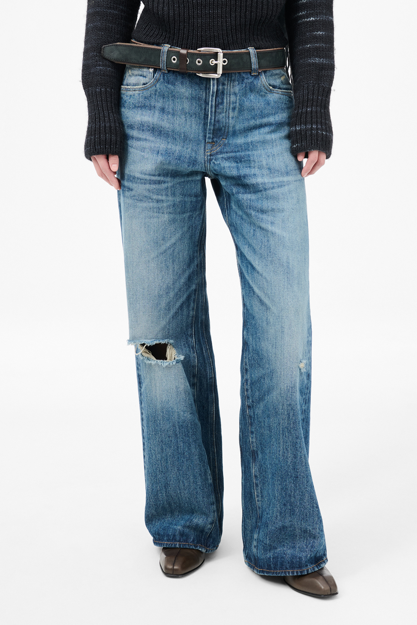 Our Treble Cut in Road Worn Rope Twill. Produced in Italian cotton hemp rope twill fabric, the women's Treble Cut has a slouchy, wide leg fit that sits above the hip and features indigo dyeing, vintage washing, hand-distressed fading, a button fly, paneled inseam, five pockets, and an OUR LEGACY embossed patch.
