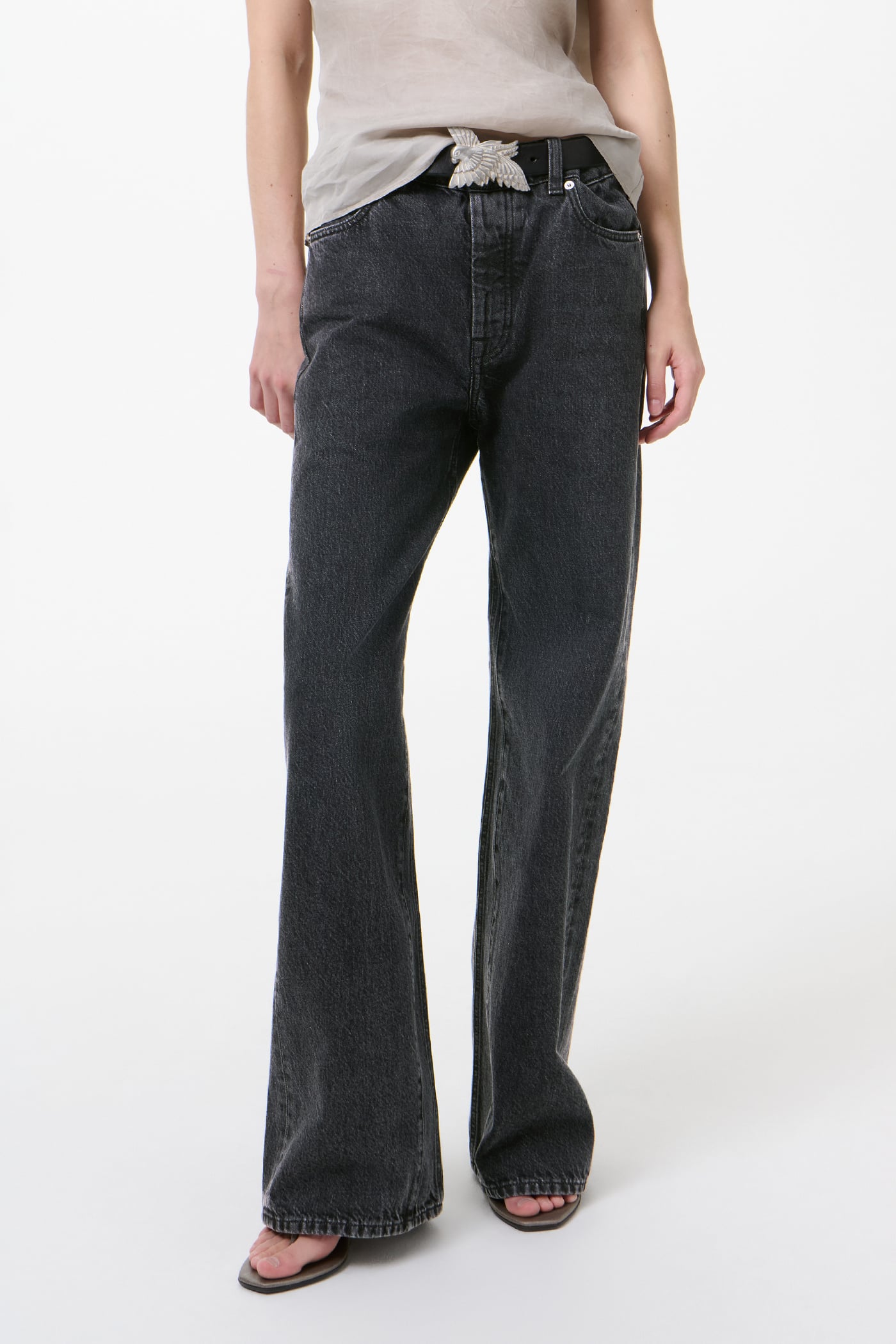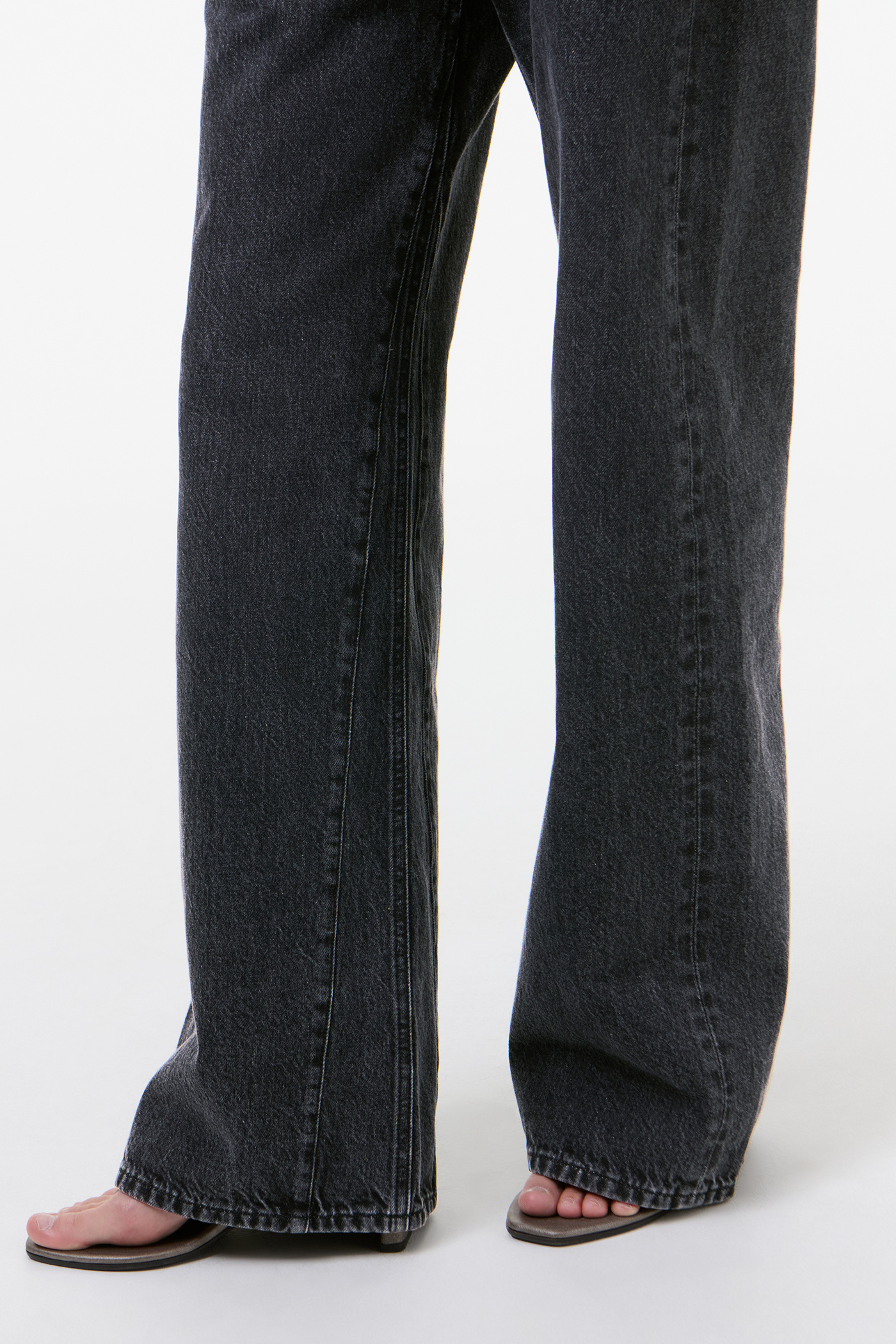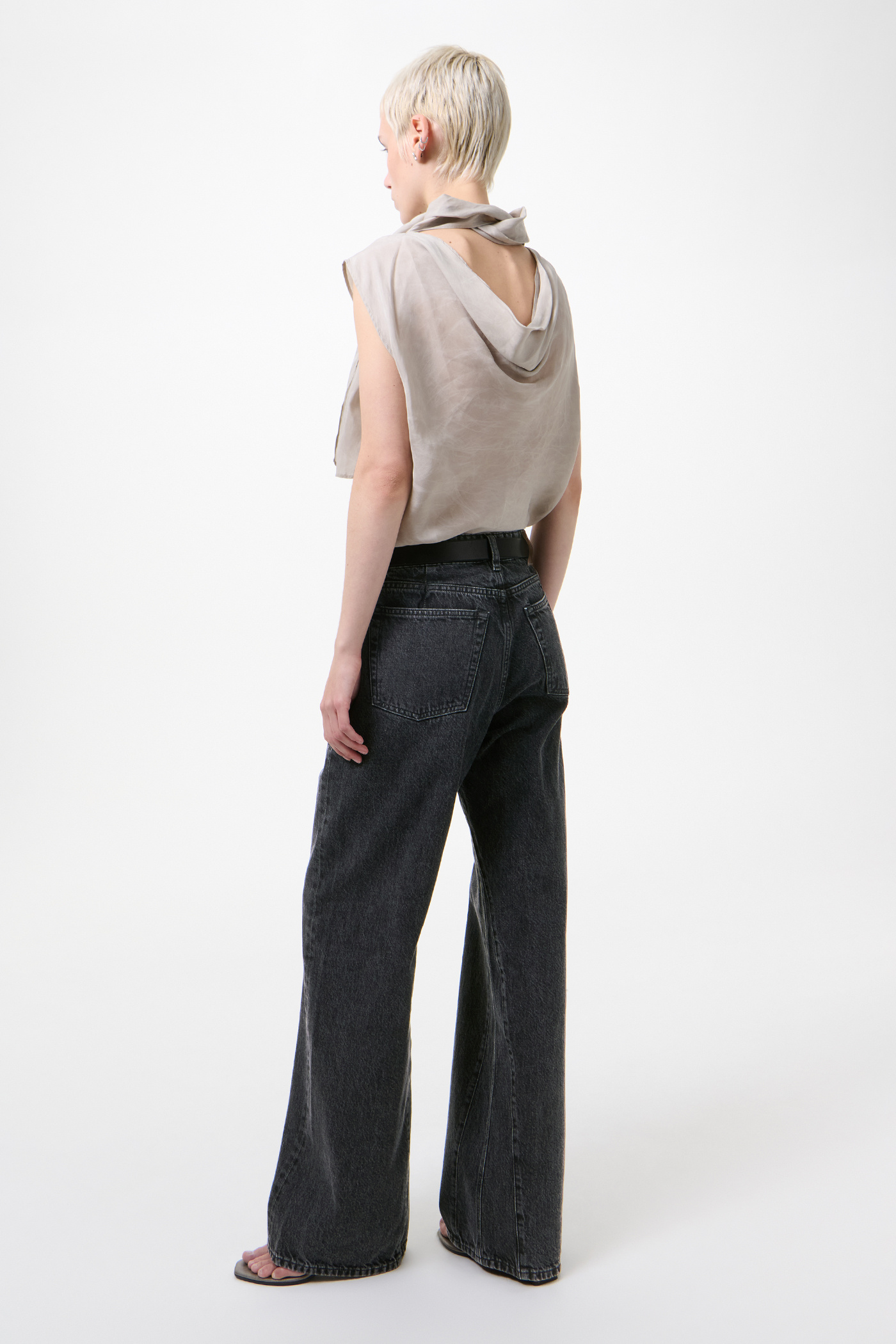 Our Treble Cut in Supergrey Wash. Produced in Italian denim, the women's Treble Cut has a slouchy wide leg fit that sits above the hip and features a button fly, paneled inseam, five pockets, and an OUR LEGACY embossed patch.
