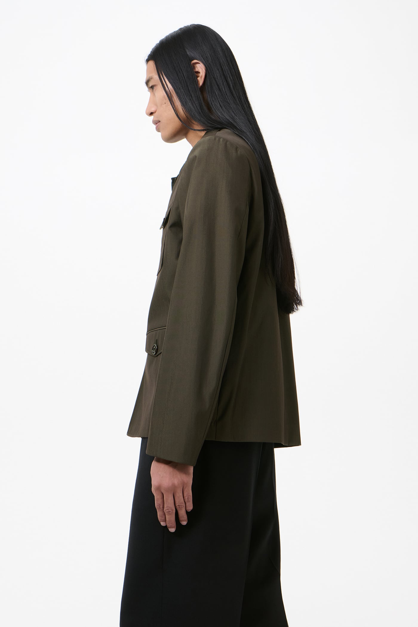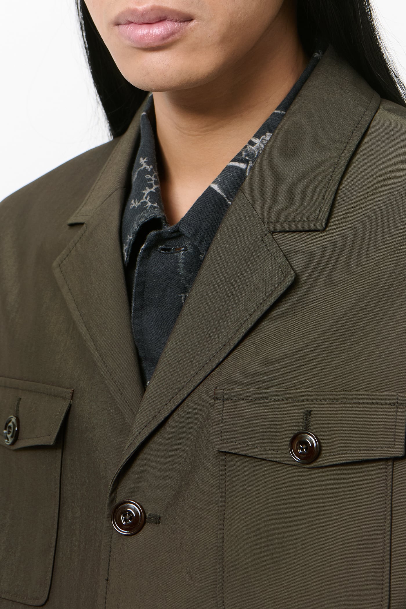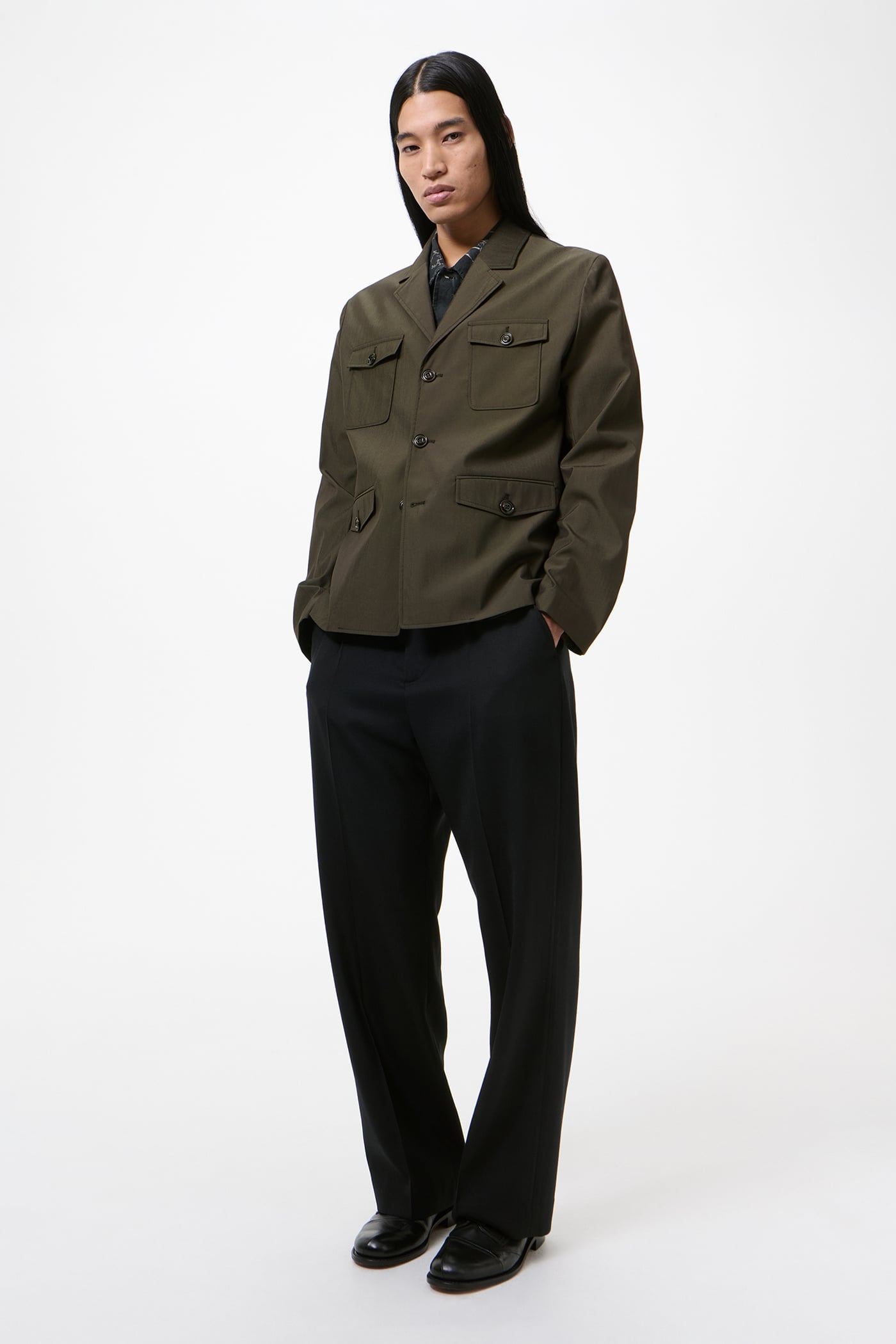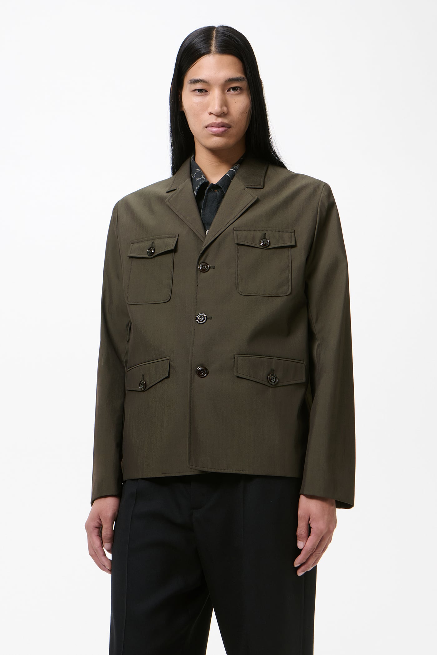 Our Trip Blazer in Glazed Brown Durawool. Produced in an Italian performance wool blend of virgin wool and polyamide, the fabric combines natural insulation, breathability and softness with enhanced durability and a premium hand feel. The men's Trip Blazer is our take on a safari jacket with a sharp, boxy silhouette and a four-pocket design. It features a straight front edge, three button fastening, an acetate and viscose lining, and corozo buttons.