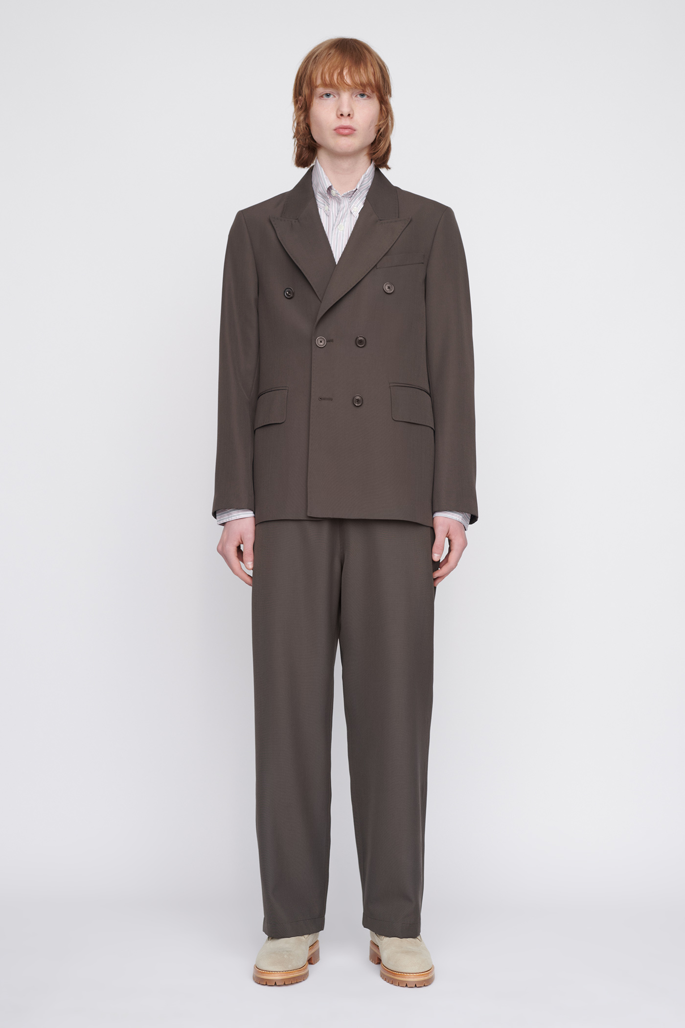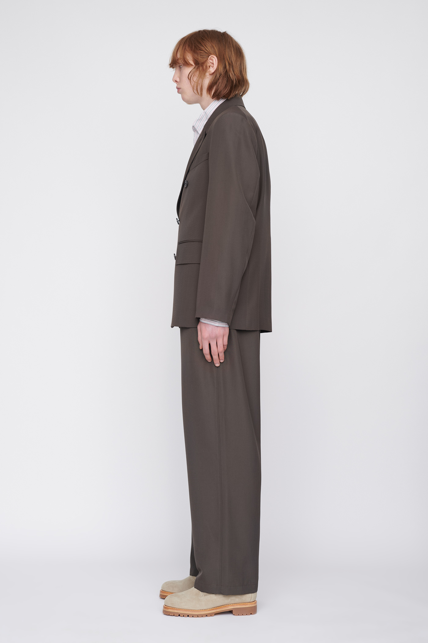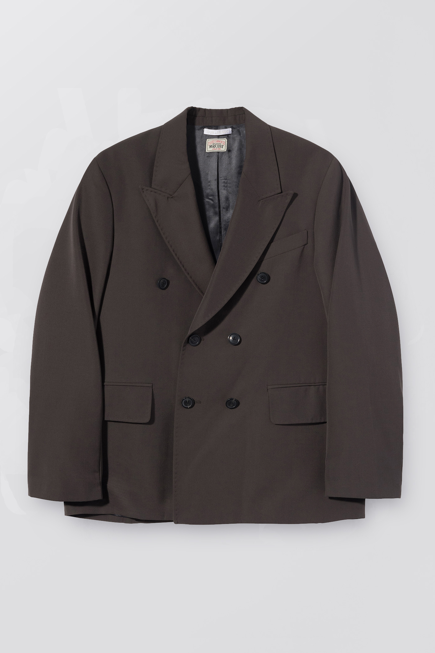 WORK SHOP X STÜSSY Unconstructed DB Blazer in Olive Grey Wool. Produced in a dead stock Italian wool, polyester fabric from the Our Legacy archive, this fully lined mens double breasted blazer has a relaxed tailored fit and features a peaked lapel and horn buttons.