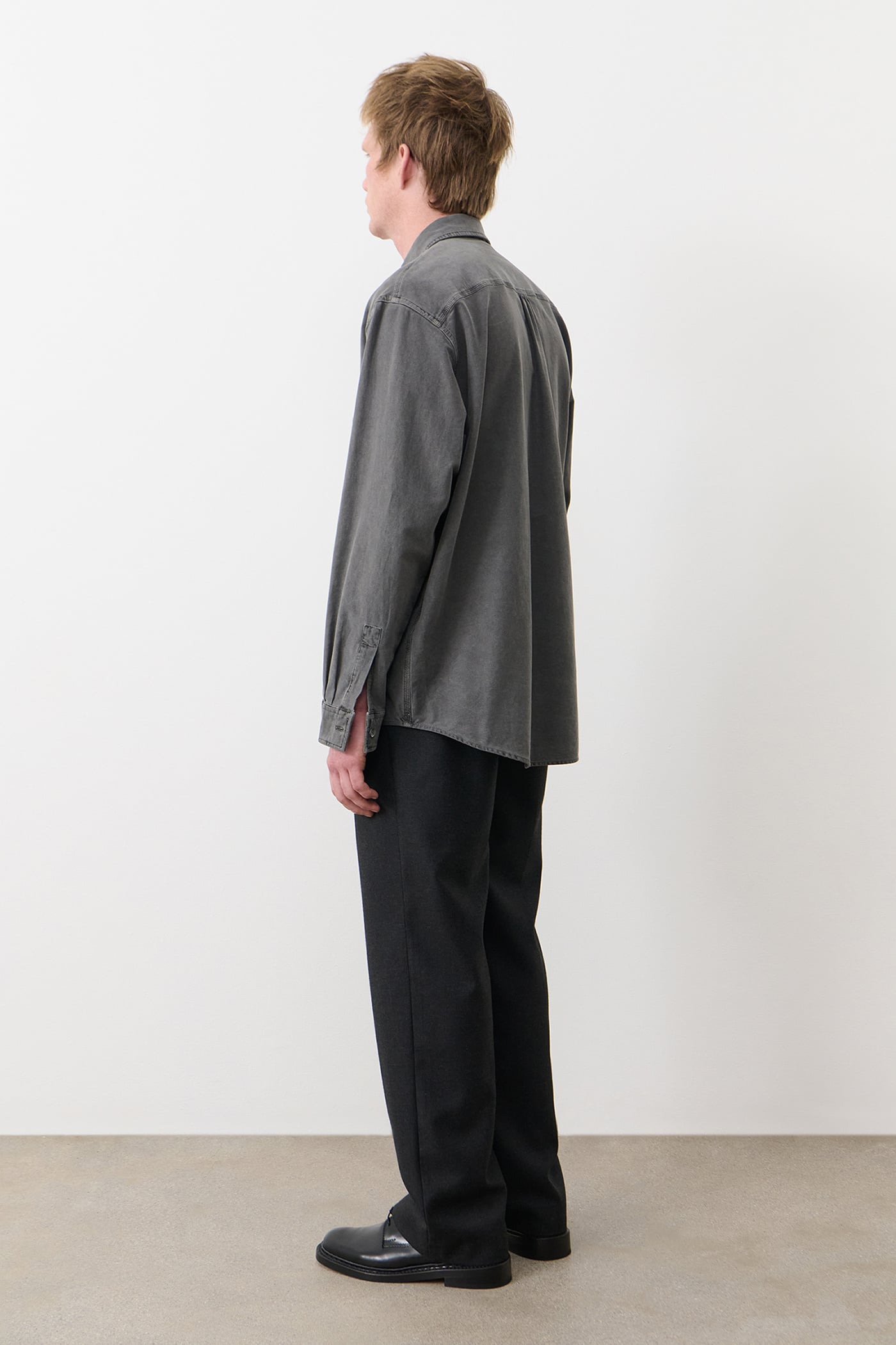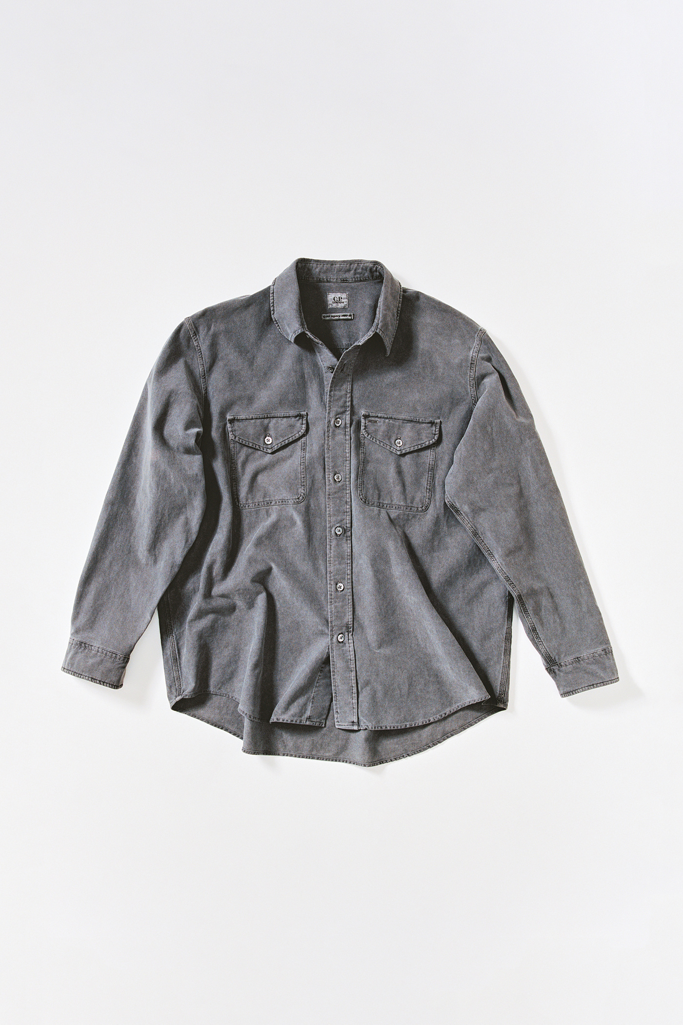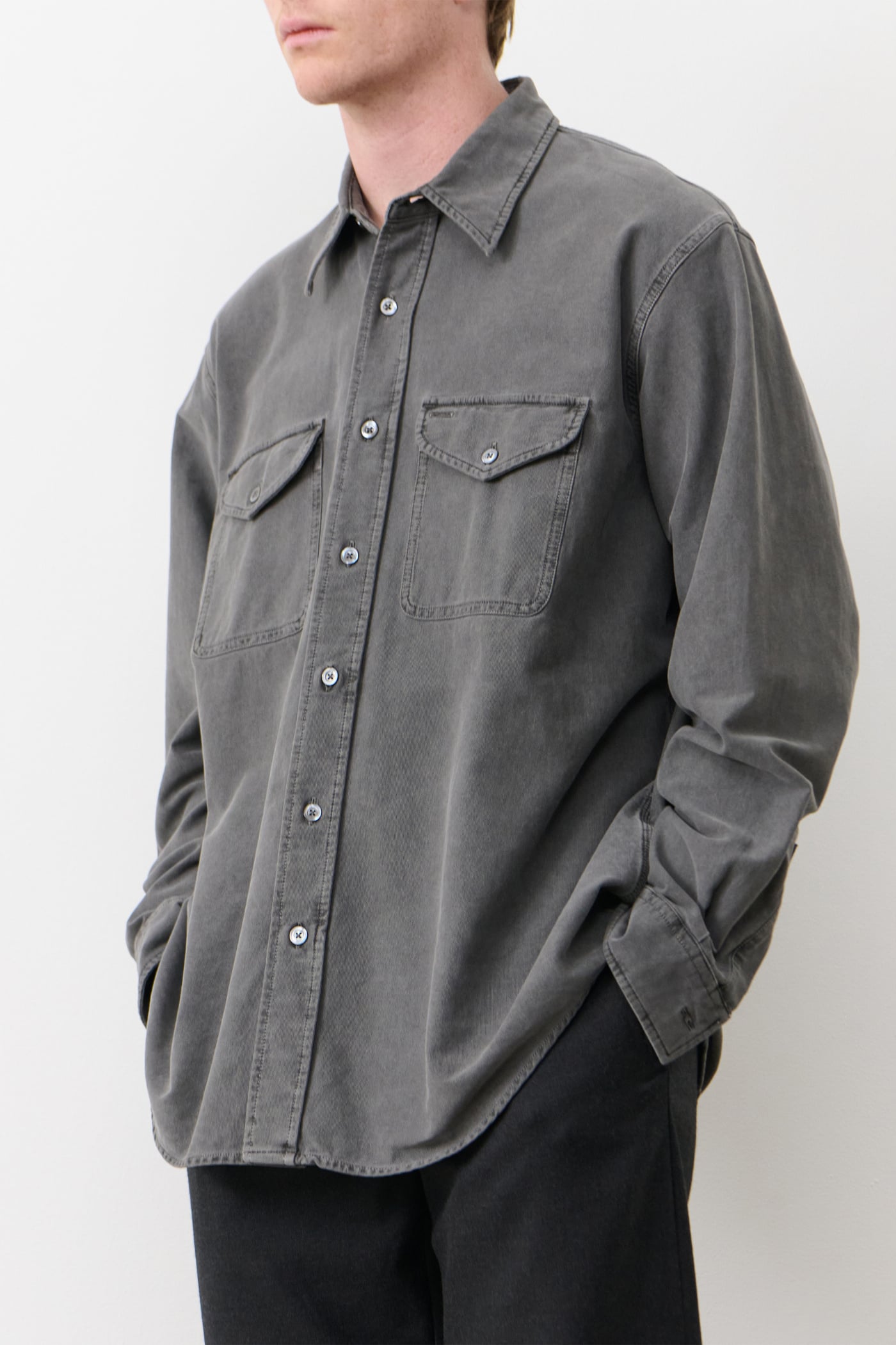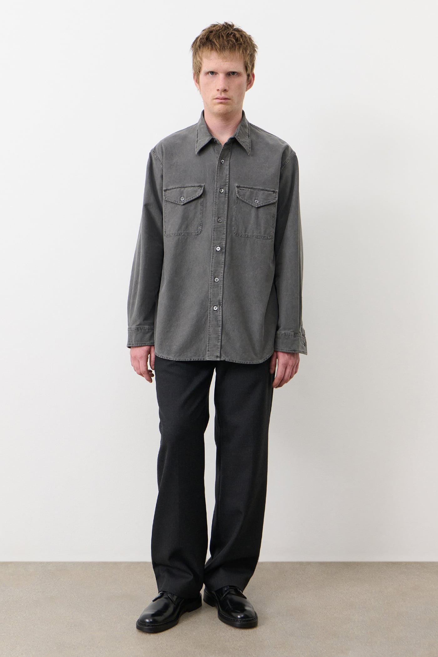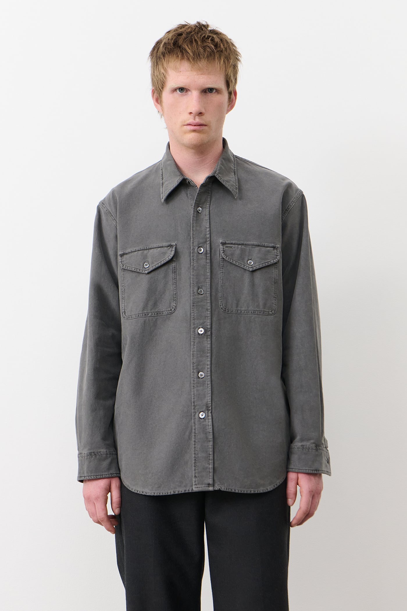 Utility Shirt in After Dark. Utility Shirt crafted from Italian ottoman stretch cotton for the collaboration between Our Legacy WORK SHOP and C.P. Company. Designed through research in the C.P. Company archive, Utility Shirt is referencing archival workwear shirting details translated to a classic Our Legacy fit. The fabric has been pigment dyed for a naturally lived-in appearance. Features a classic collar, mother of pearl buttons, chest pockets and adjustable cuffs. Relaxed fit.