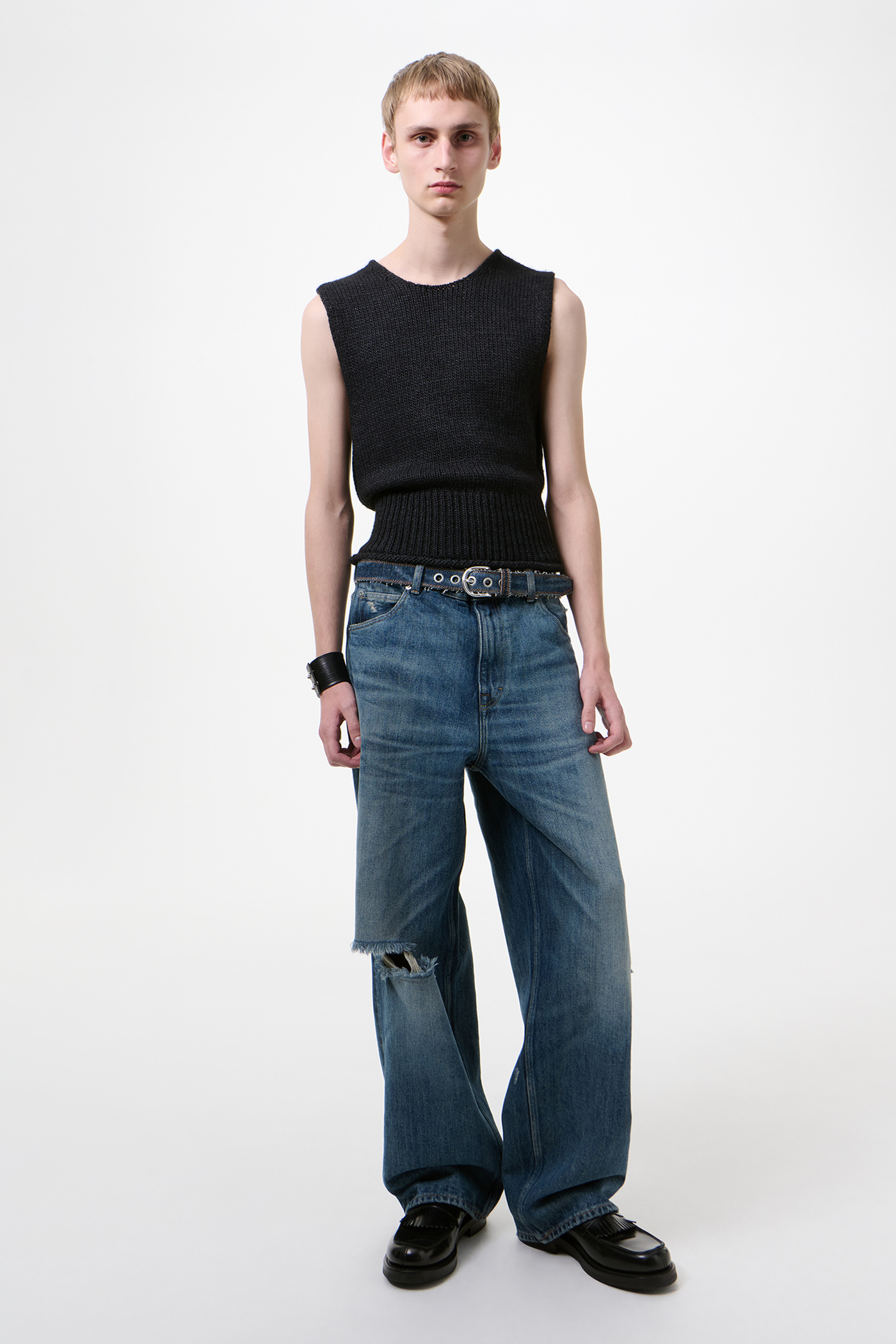 This garment is manufactured using carefully sourced material with a unique treatment process that gives each piece an individual shade and appearance. This technique may result in some color bleeding onto lighter garments or surfaces. This product features intentional holes that will gradually expand and evolve with wear. The garment shall be shaped by its wearer and naturally distress over time.