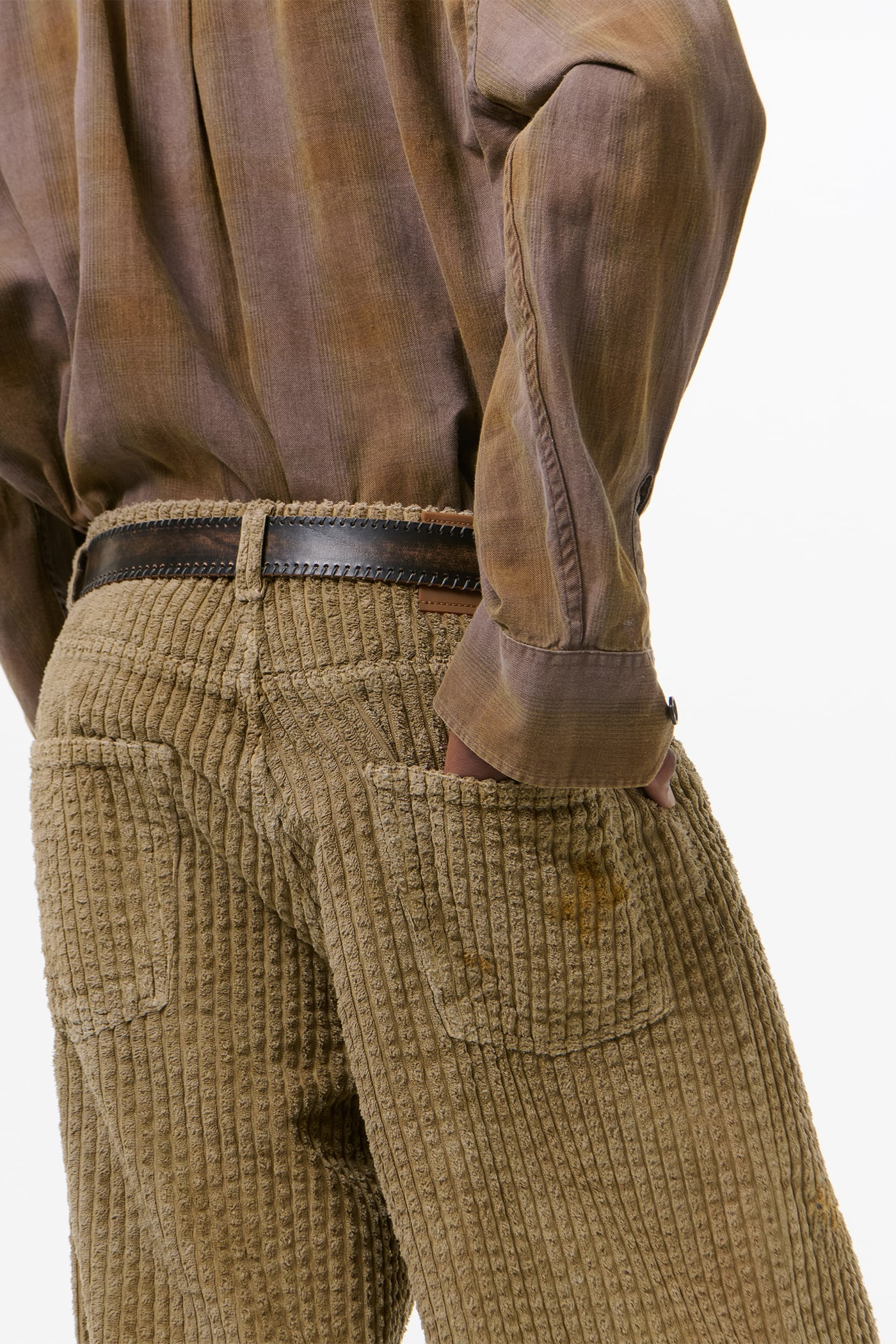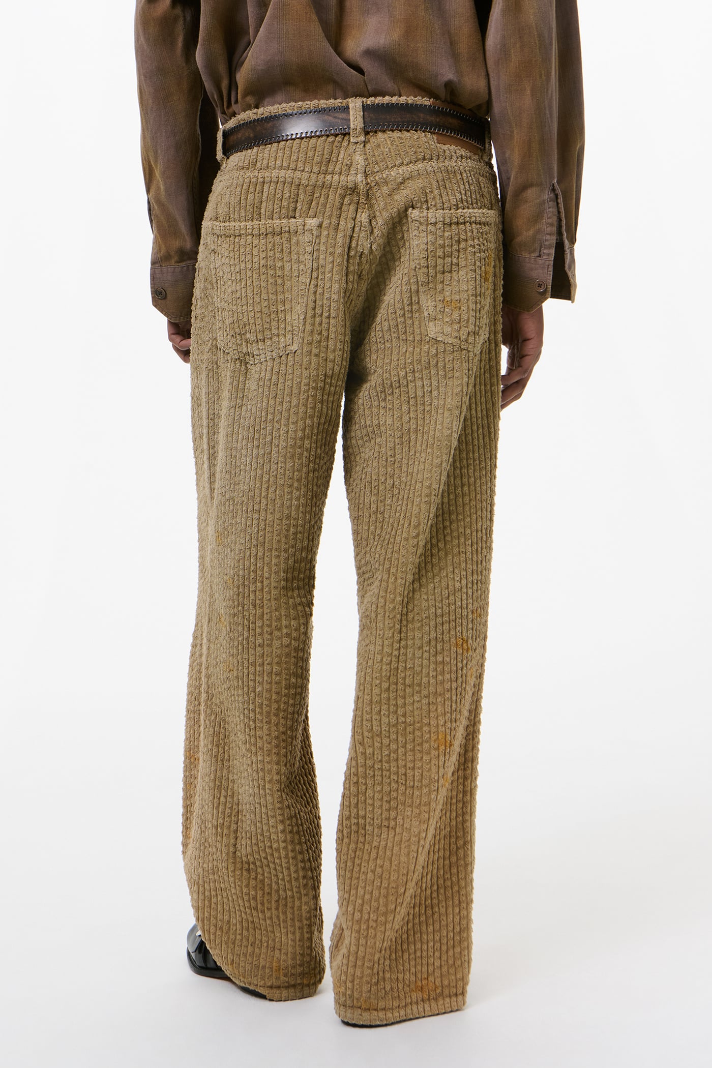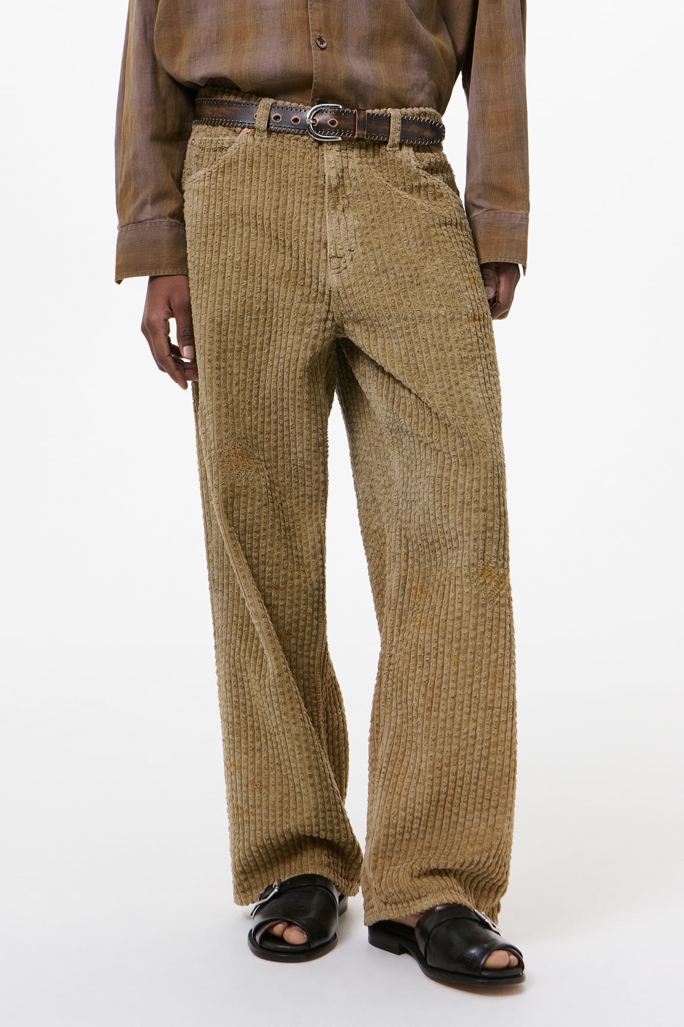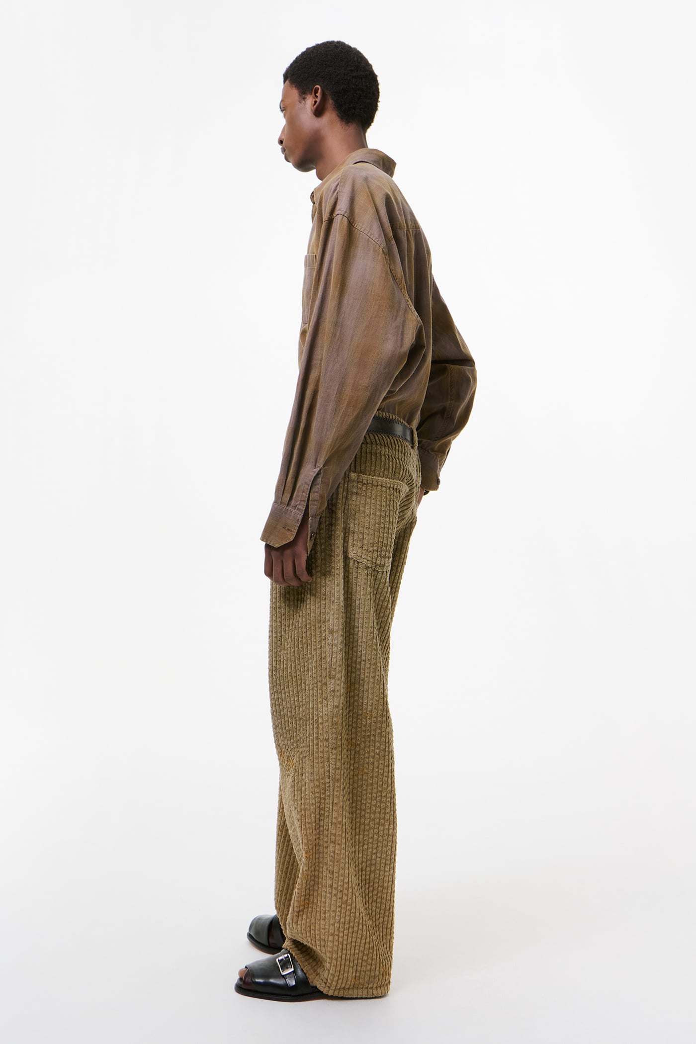Our Vast Cut in Tired Teddy Wash. Produced in Italian cotton corduroy, the men's Vast Cut has a high waisted, loose oversized fit with wide straight legs and features pigment dyeing, hand-distressed detailing and staining, a YKK zip fly, steel rivets, five pockets, and an embossed OUR LEGACY patch.