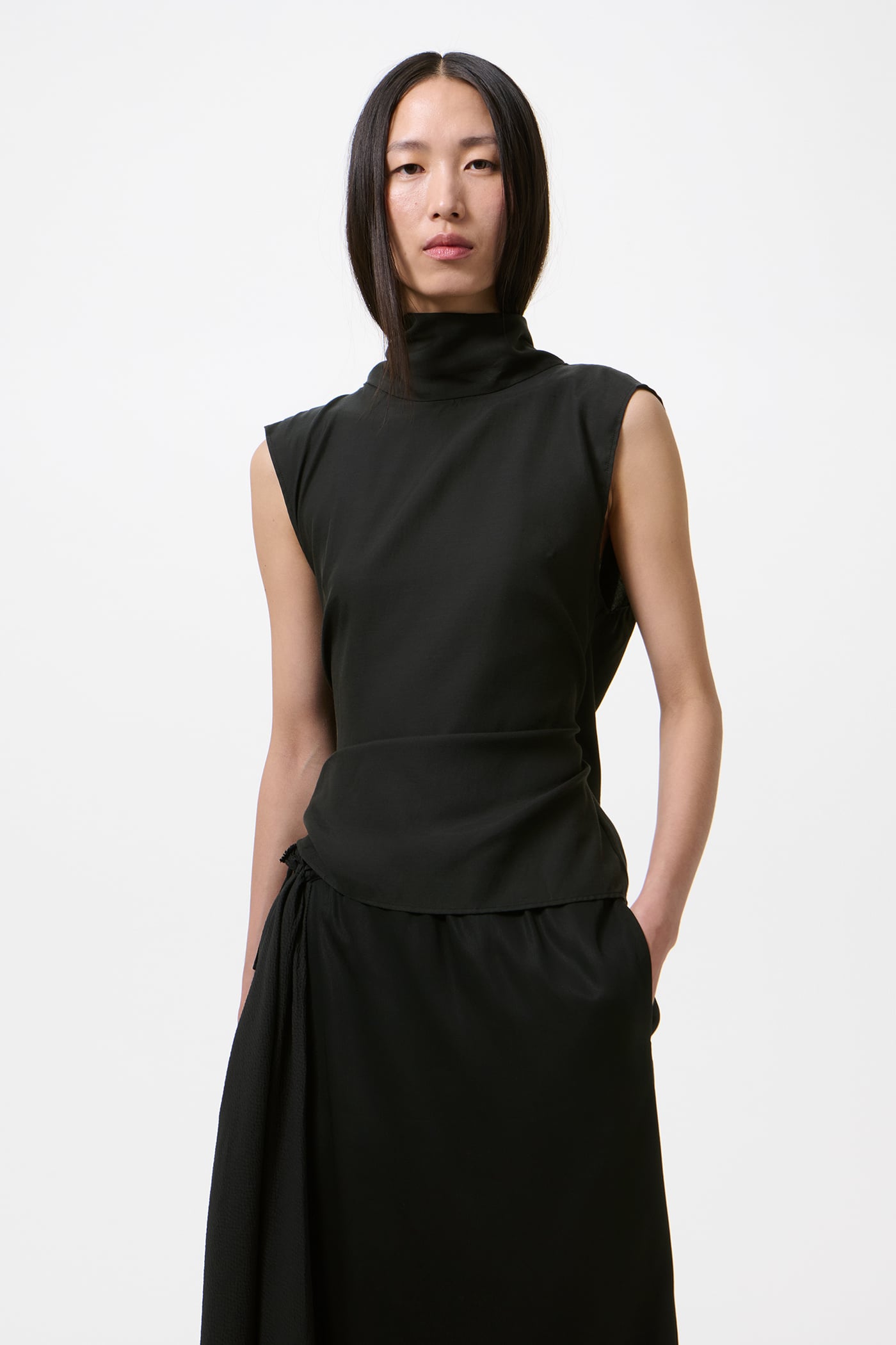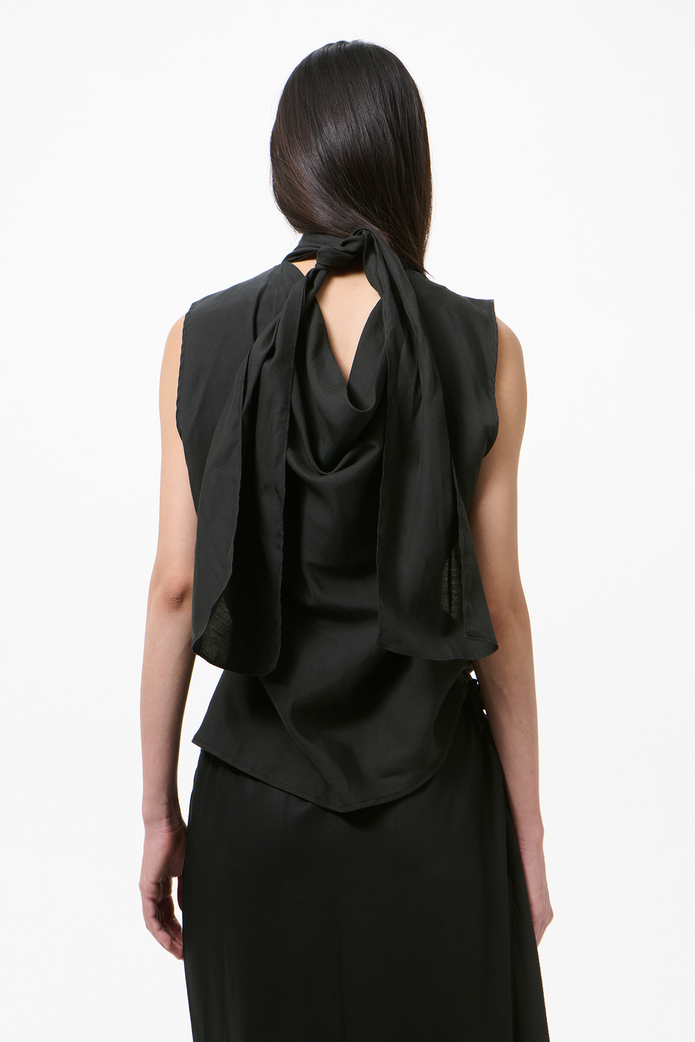 Our Virtuous Top in Still Black Calm Cupro Cotton. Produced in a Japanese cupro and cotton fabric, the Virtuous Top has a sleeveless silhouette and features an adjustable fit with inside ties that allow it to switch from relaxed to cinched, a Lavallière shawl at the neck, and a draped back panel with an open back.