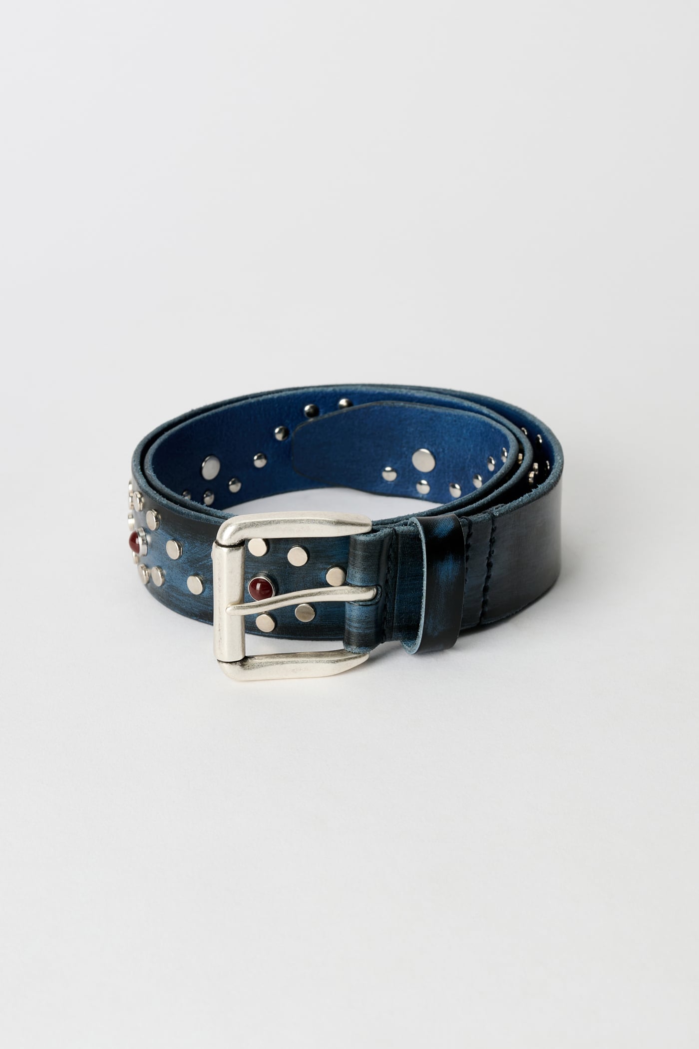 Our Vortex Belt in Vintage Black Ocean Leather. Produced in Italian cow leather with an abrasion finish, the belt features a repetitive spiral rivet pattern with contrast-colored studs at the center of each spiral.