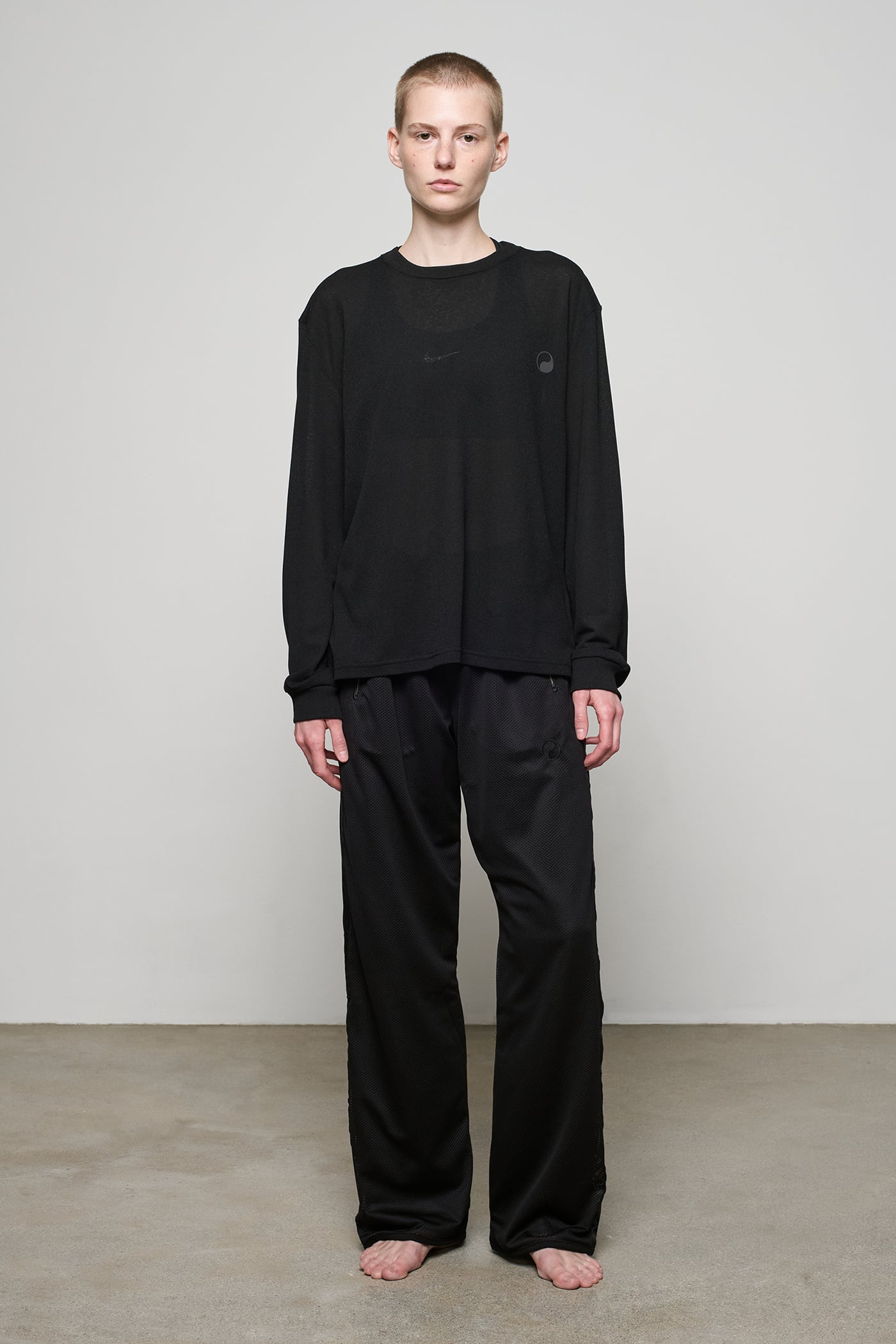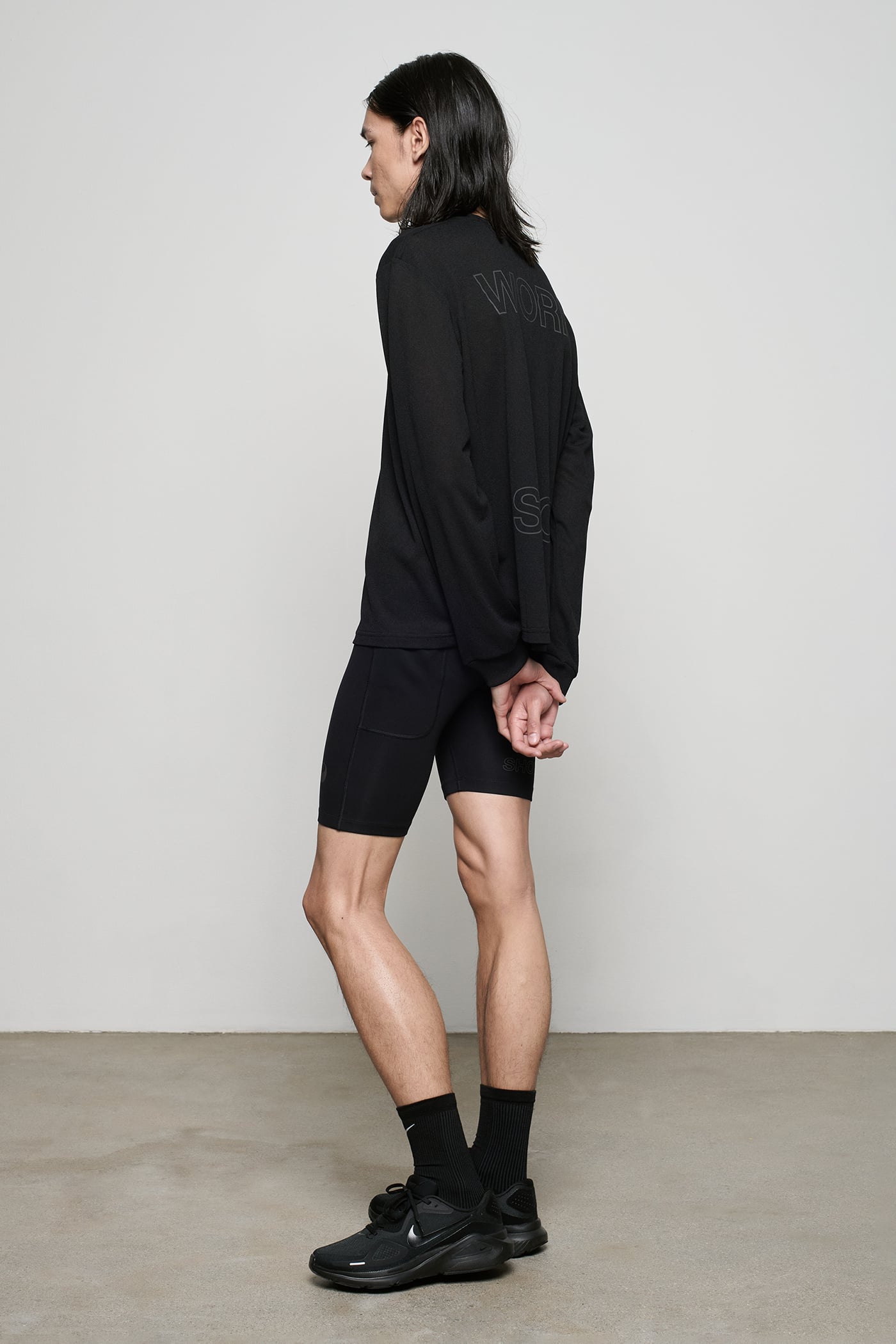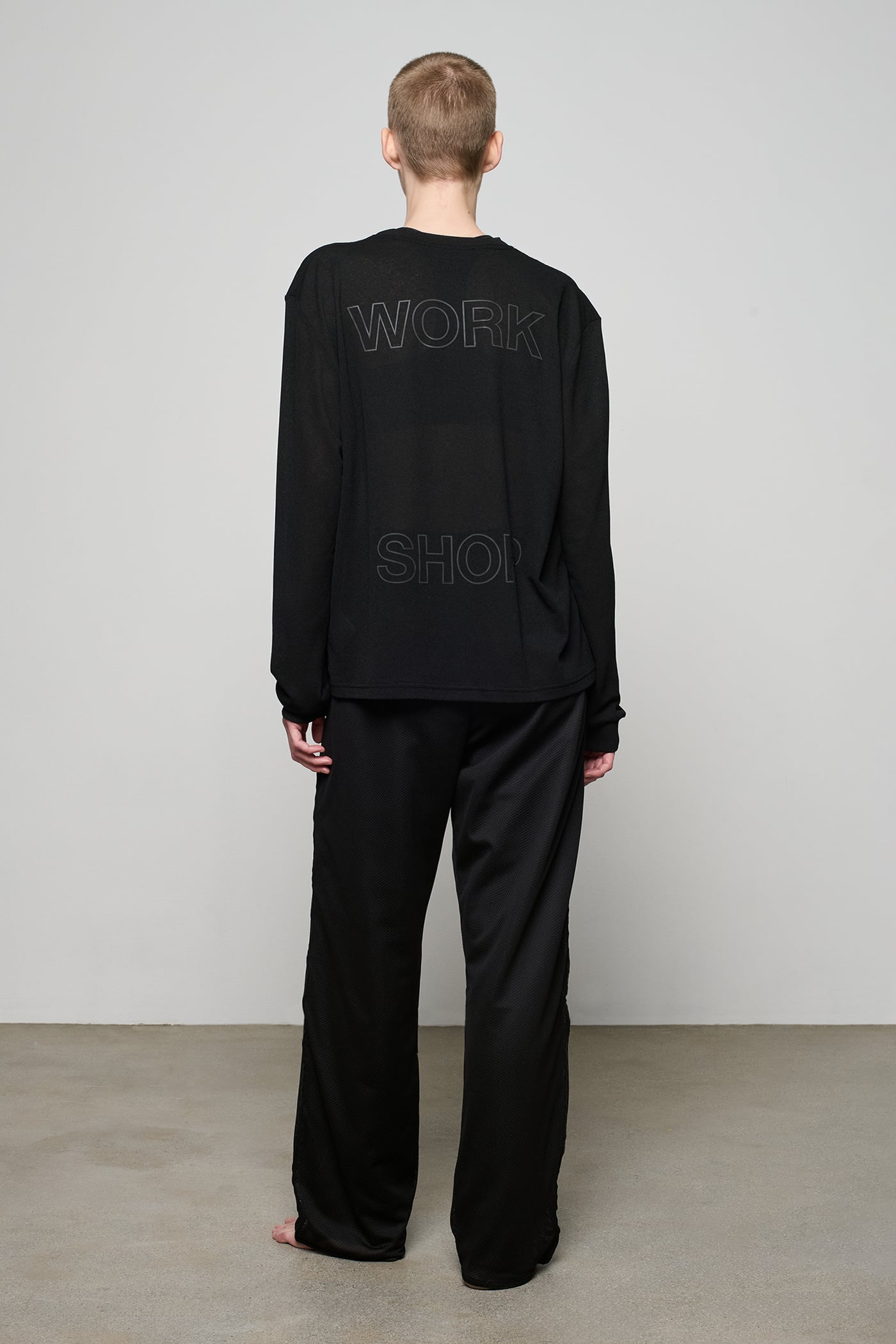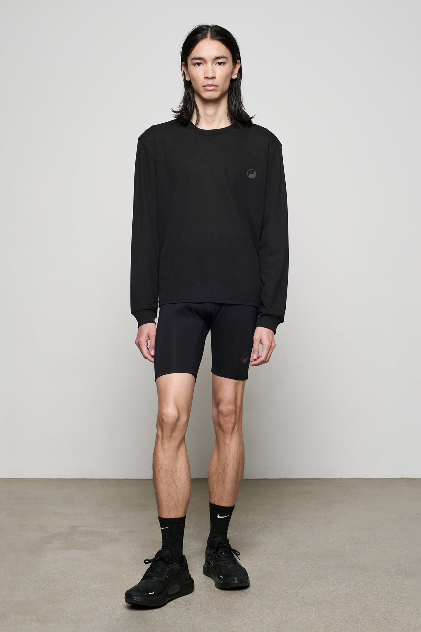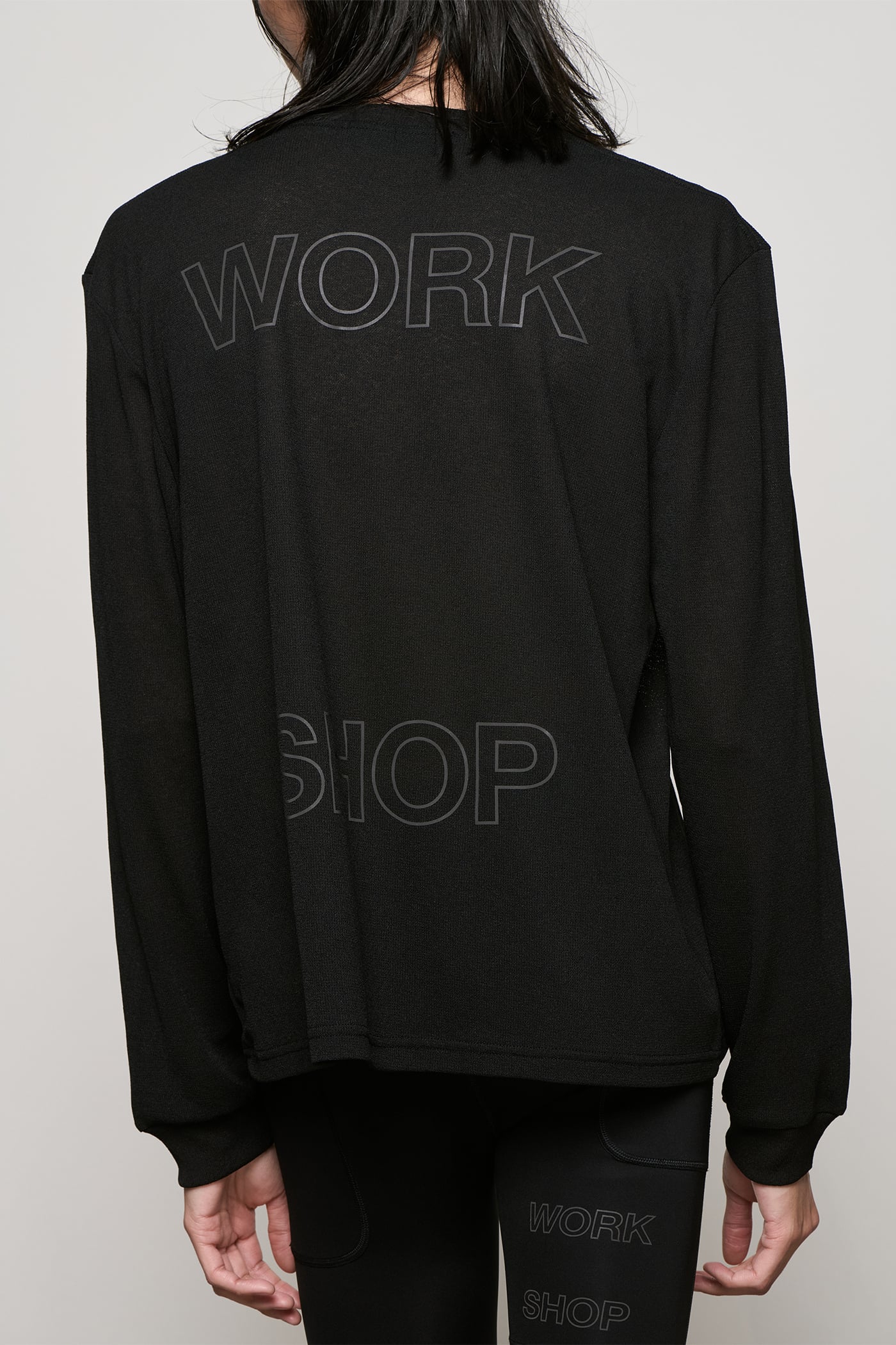Our Waffle Longsleeve in Black. Produced in a Japanese lightweight and moisture-wicking waffle-textured polyester fabric, the Waffle Longsleeve has a comfortable fit and features a ribbed collar and hem, reflective Yin Yang chest print, reflective WORK SHOP back print, overlocked seams and taped shoulder seams for enhanced durability.