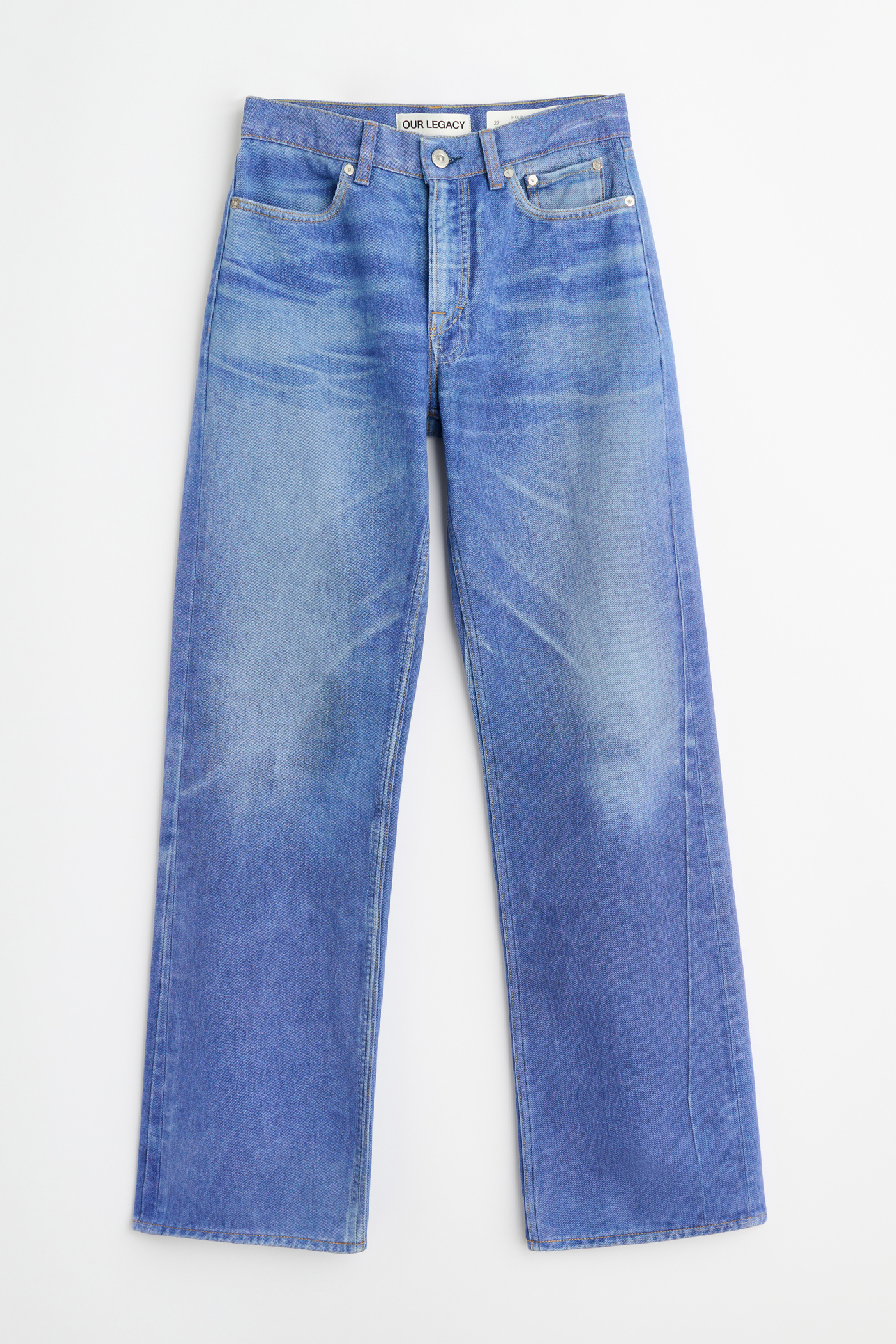 Our Wata Cut in Digital Blue Aurora Print. Produced in Italian denim with a trompe l'oeil vintage denim print, the Wata Cut has an extended leg length with a slight boot cut and features a zip fly, steel rivets, five pockets and an Our Legacy embossed patch.