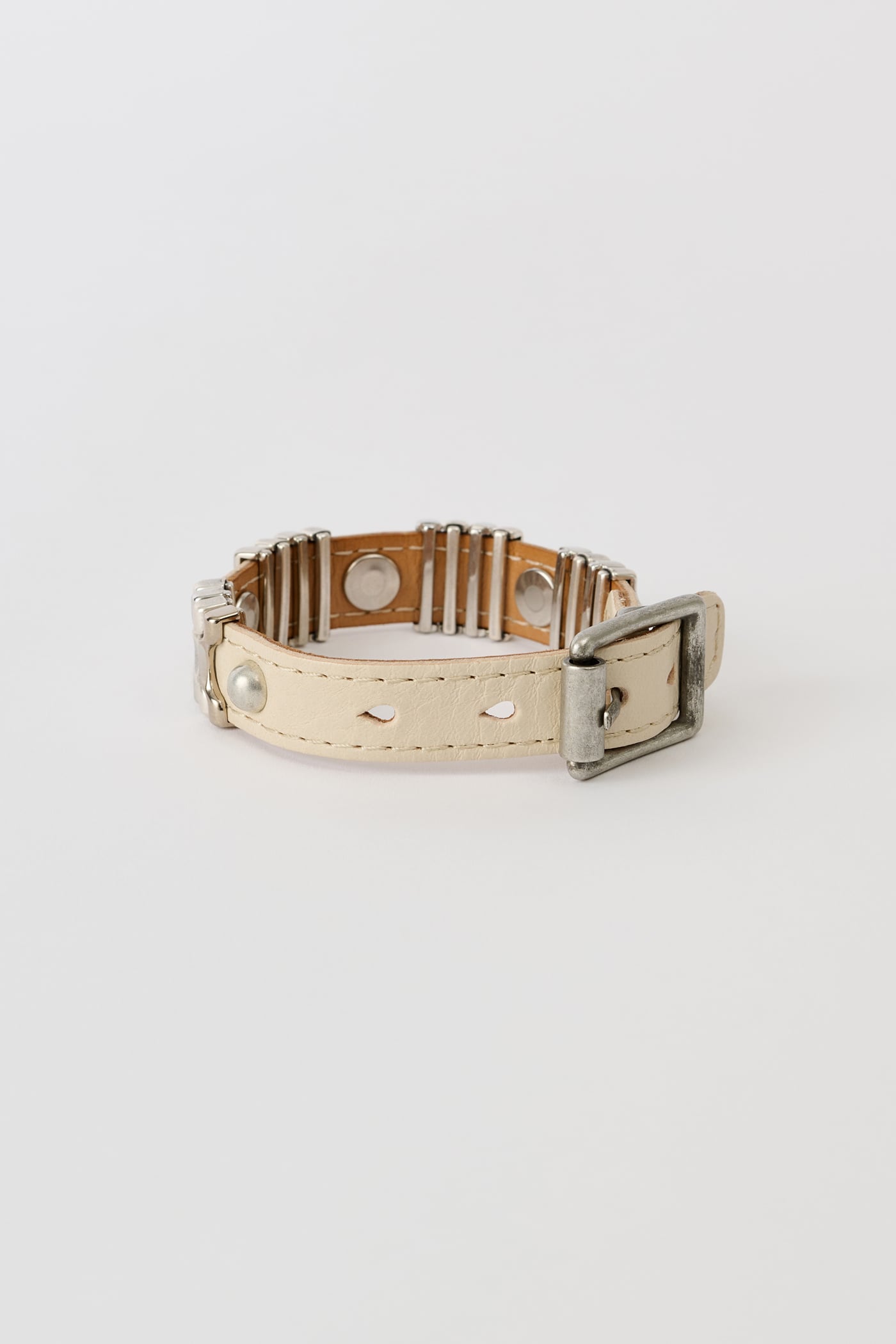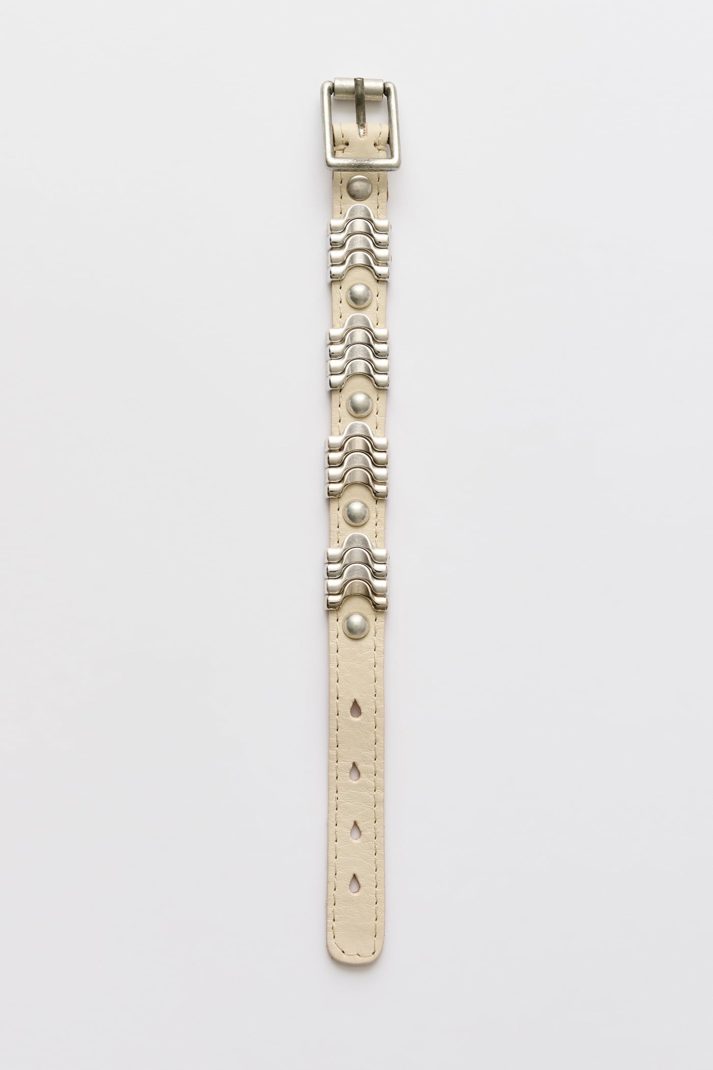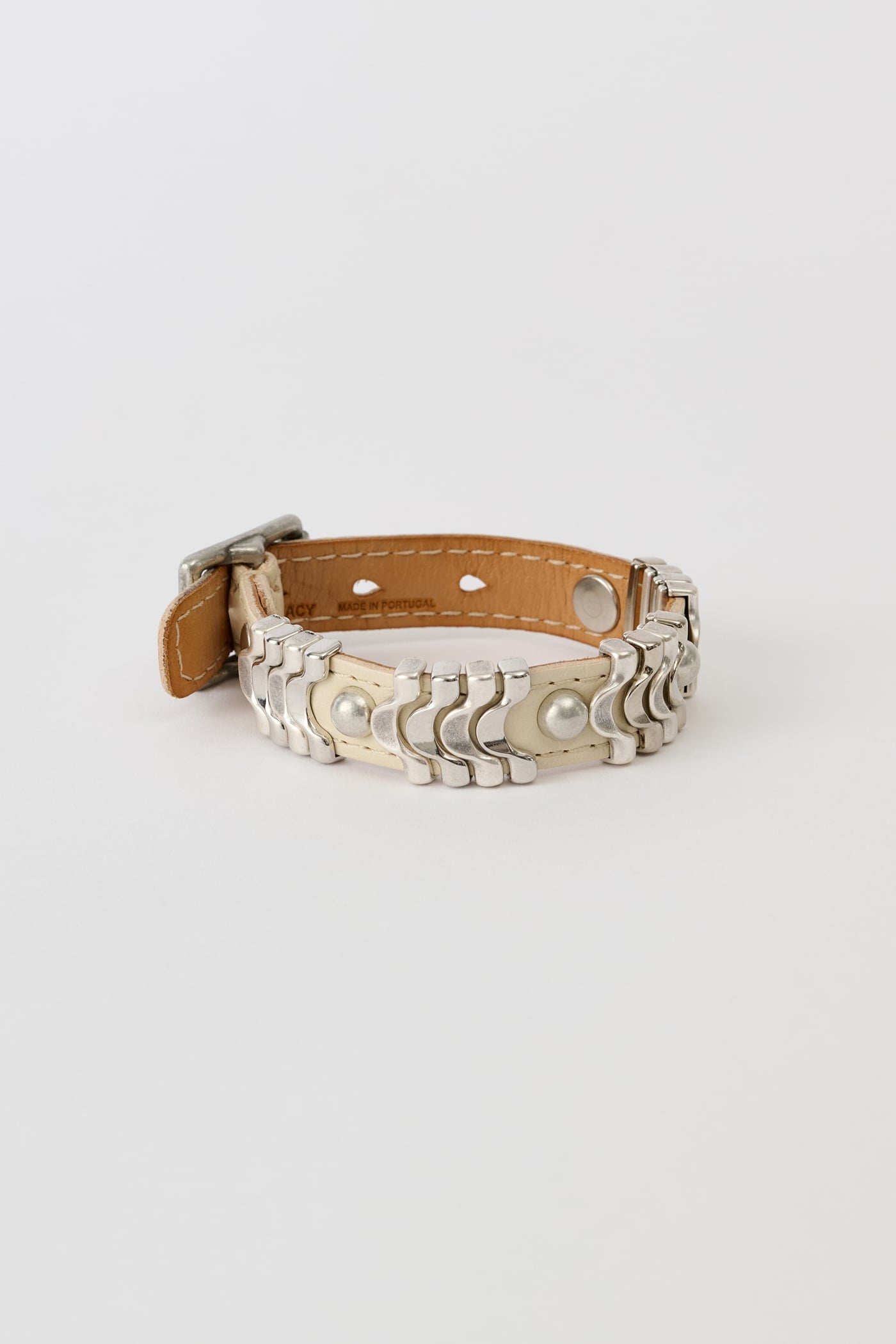 Our Wave Bracelet in Deep Ecru Leather. Produced in a vegetable-tanned full grain Italian cow leather, the Wave Bracelet features an adjustable wrist strap, interlocking metal wave ornaments, a metal pin buckle closure and rivet details.