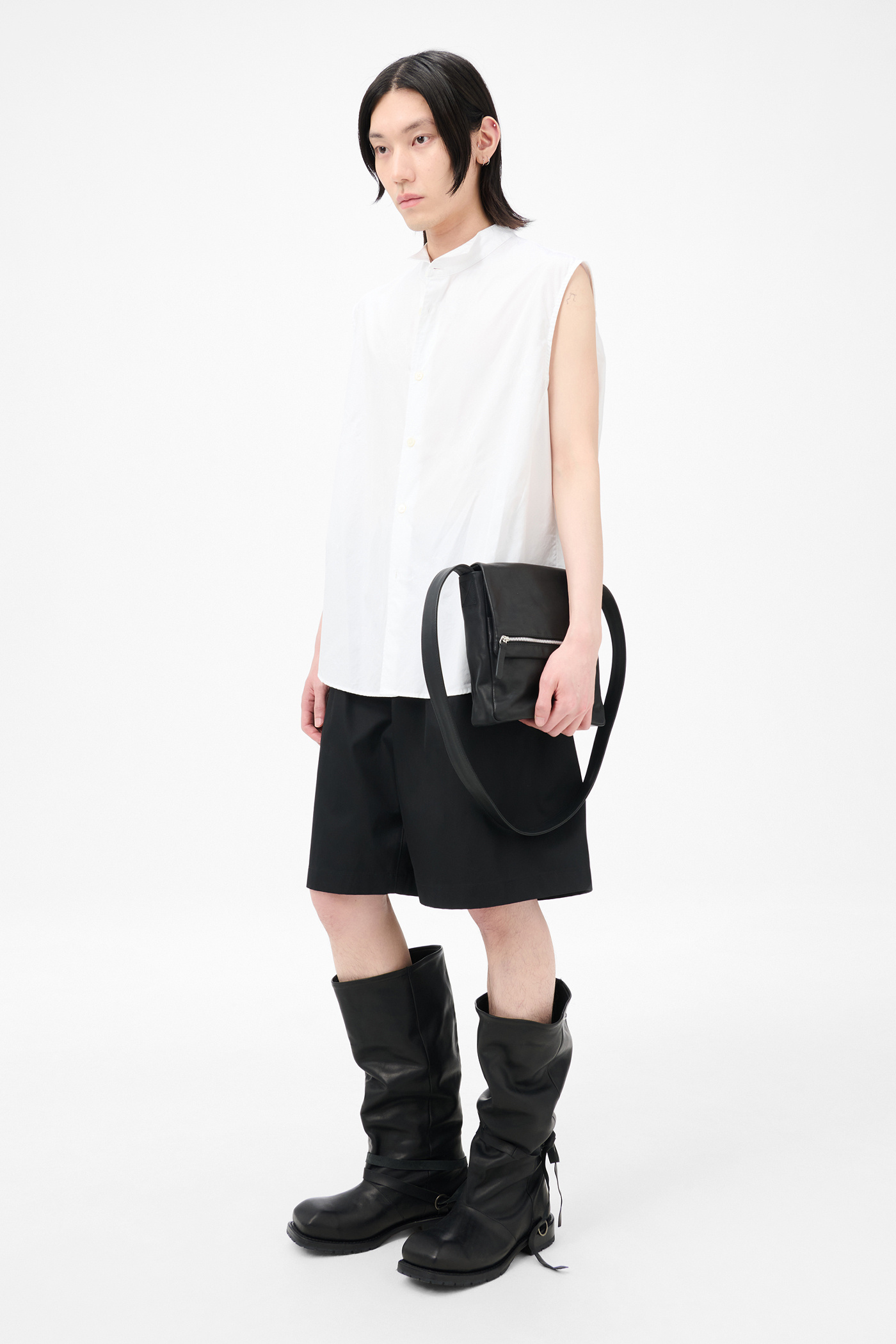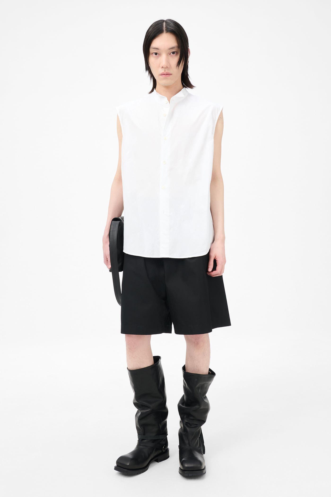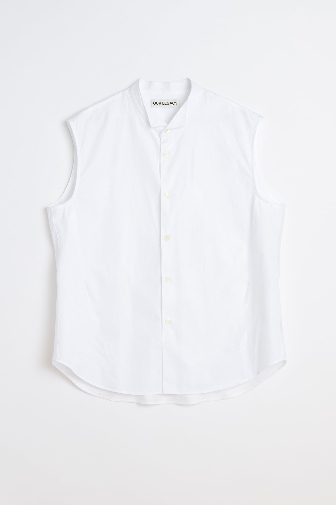 Our Wing Shirt Sleeveless in Winter Bouquet Super Poplin. Produced in crisp premium cotton poplin from exclusive Italian supplier Borghi, the men's Wing Shirt Sleeveless is a take on tuxedo wingtip shirts with a fine and clean expression. The sleeveless shirt has a relaxed fit and features a wingtip collar, box pleat at center back, stitched darts at armholes, and pearl buttons.