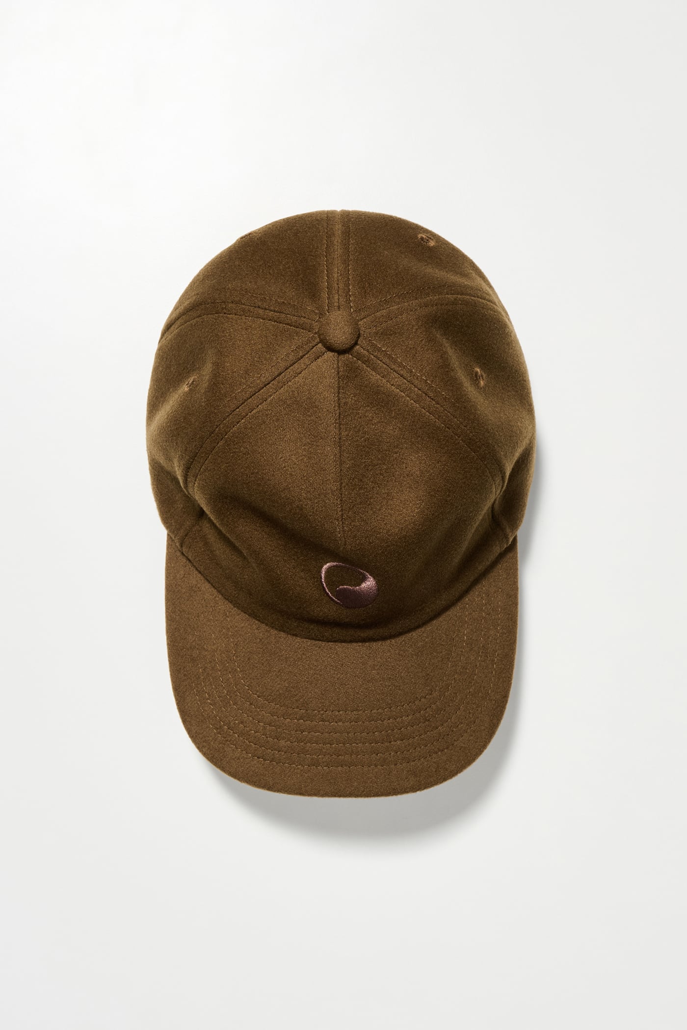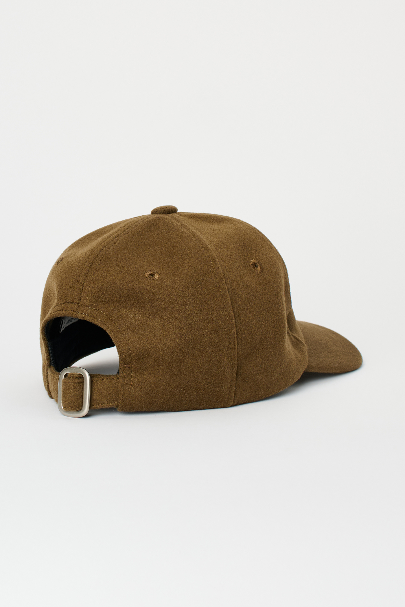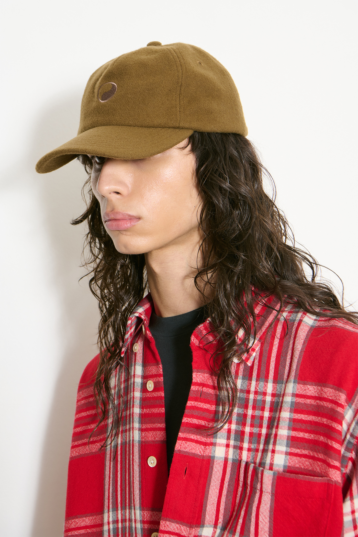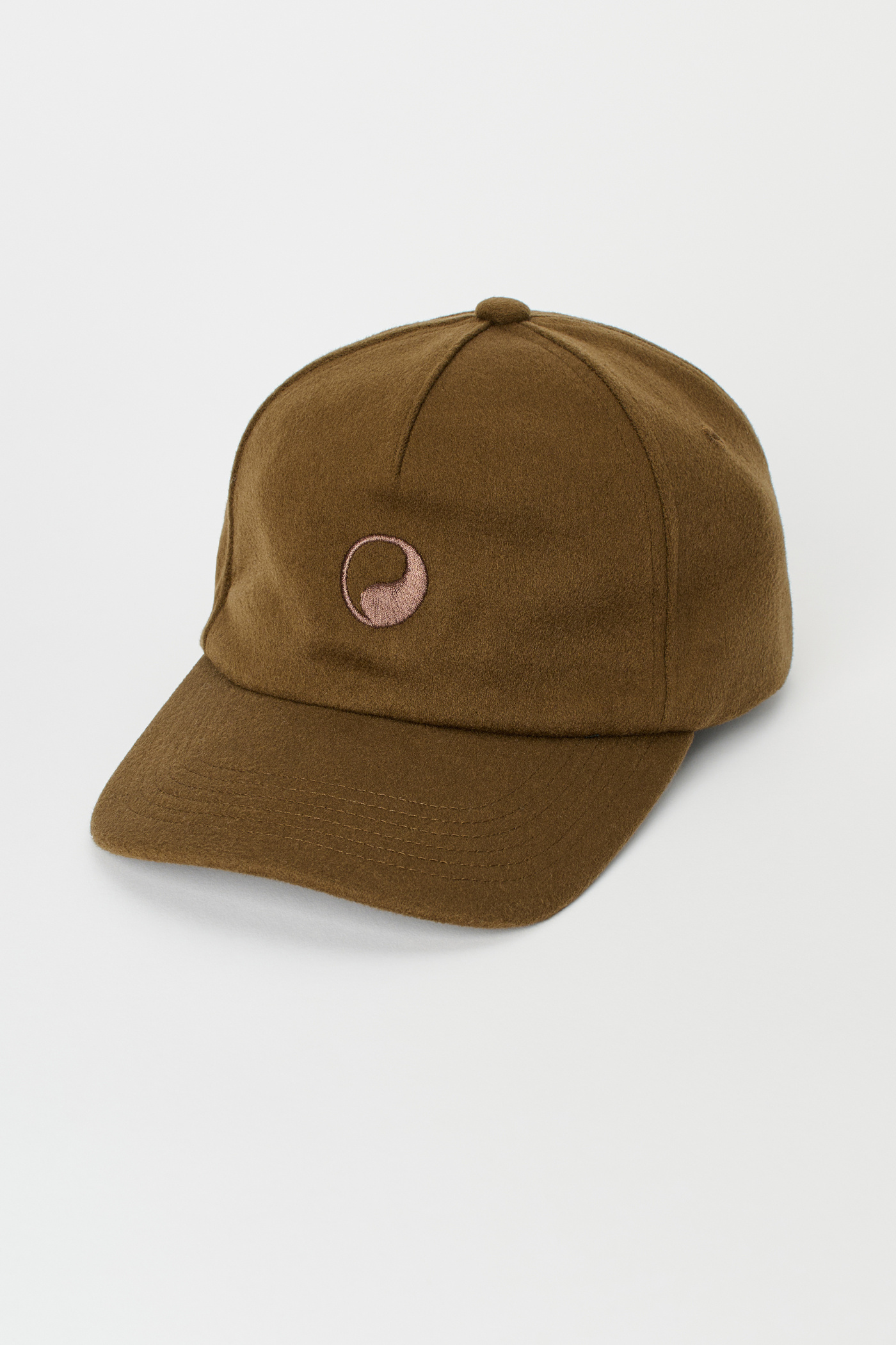 Our Work Cap in Khaki Wool. Produced in Italian deadstock fabric, this unisex six-panel cap features a curved brim, stitched eyelets, a rear strap adjuster, and is finished with Yin Yang embroidery.