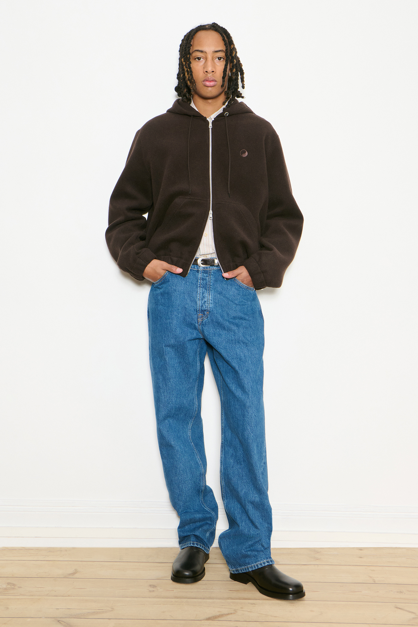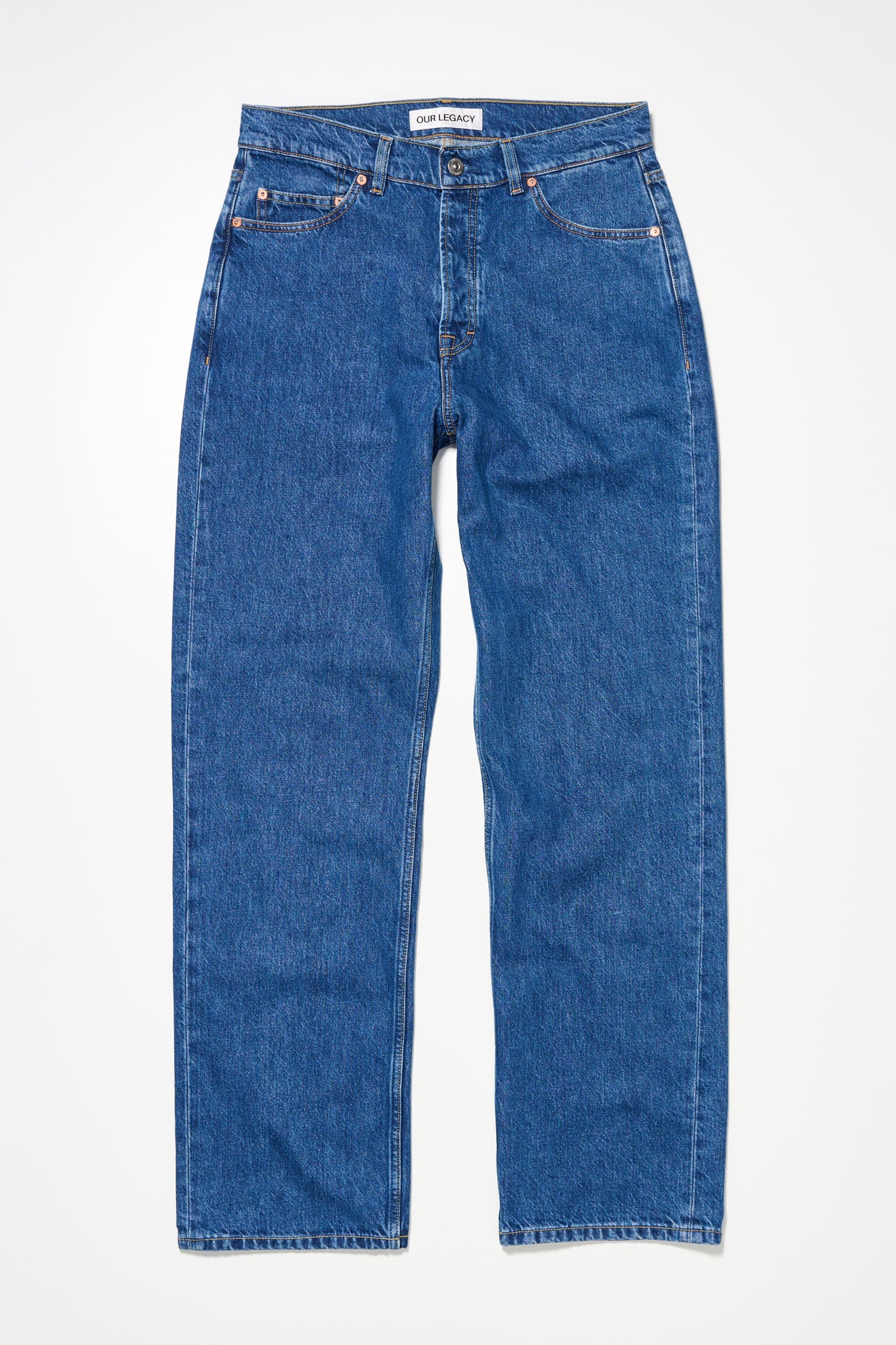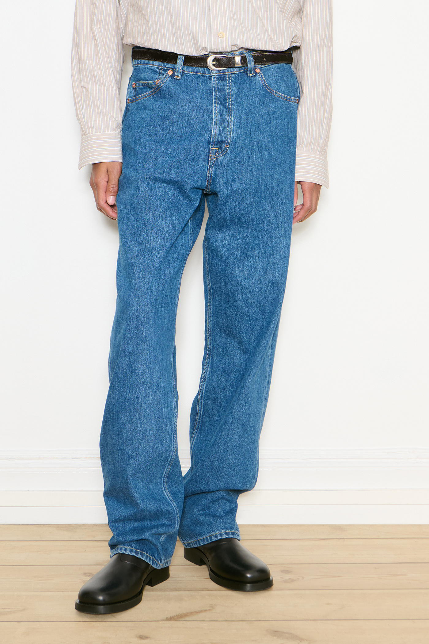 This garment is manufactured using carefully sourced material with a wash process that will give each pair an individual shade and appearance. The garment shall be shaped by its wearer and will naturally distress over time to finish the design process.