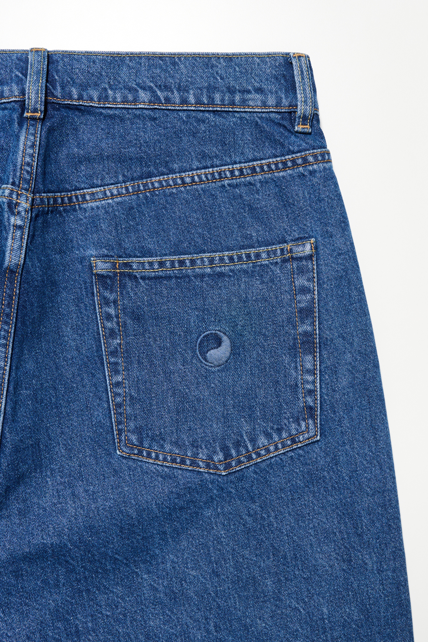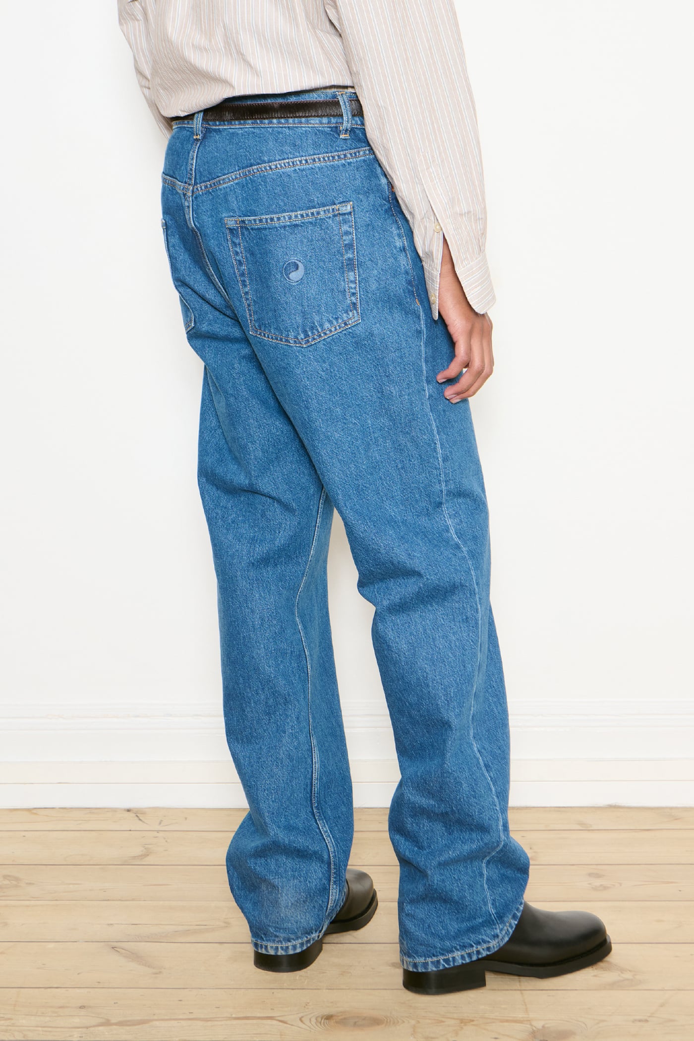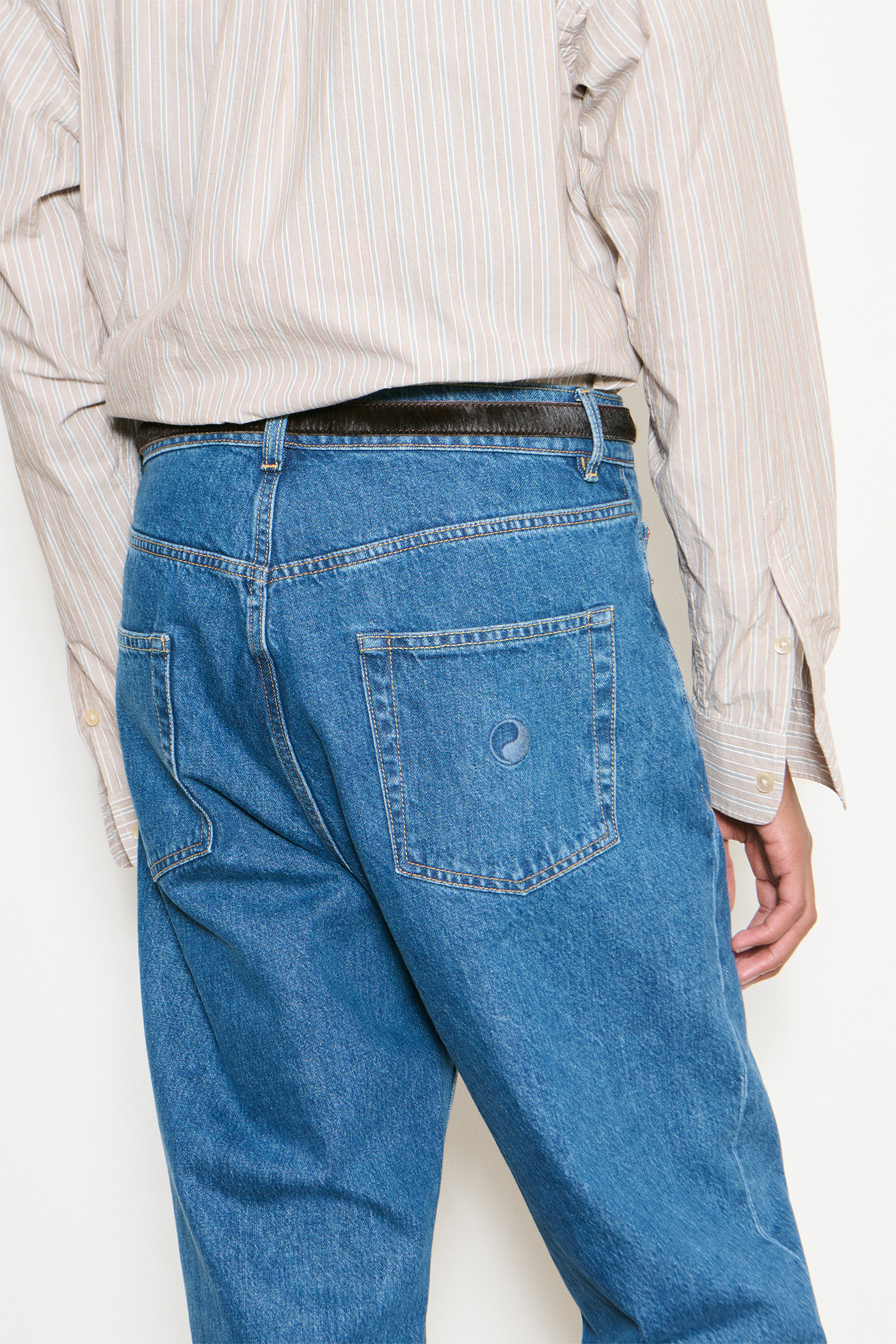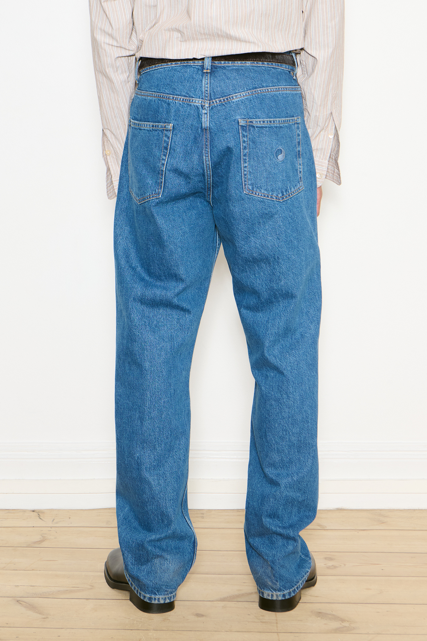Our Work Cut in Blue Wash. Produced in Italian denim, the Work Cut has a true-to-size regular, tapered fit and features a mid rise, button fly, five pockets and subtle Yin Yang embroidery.