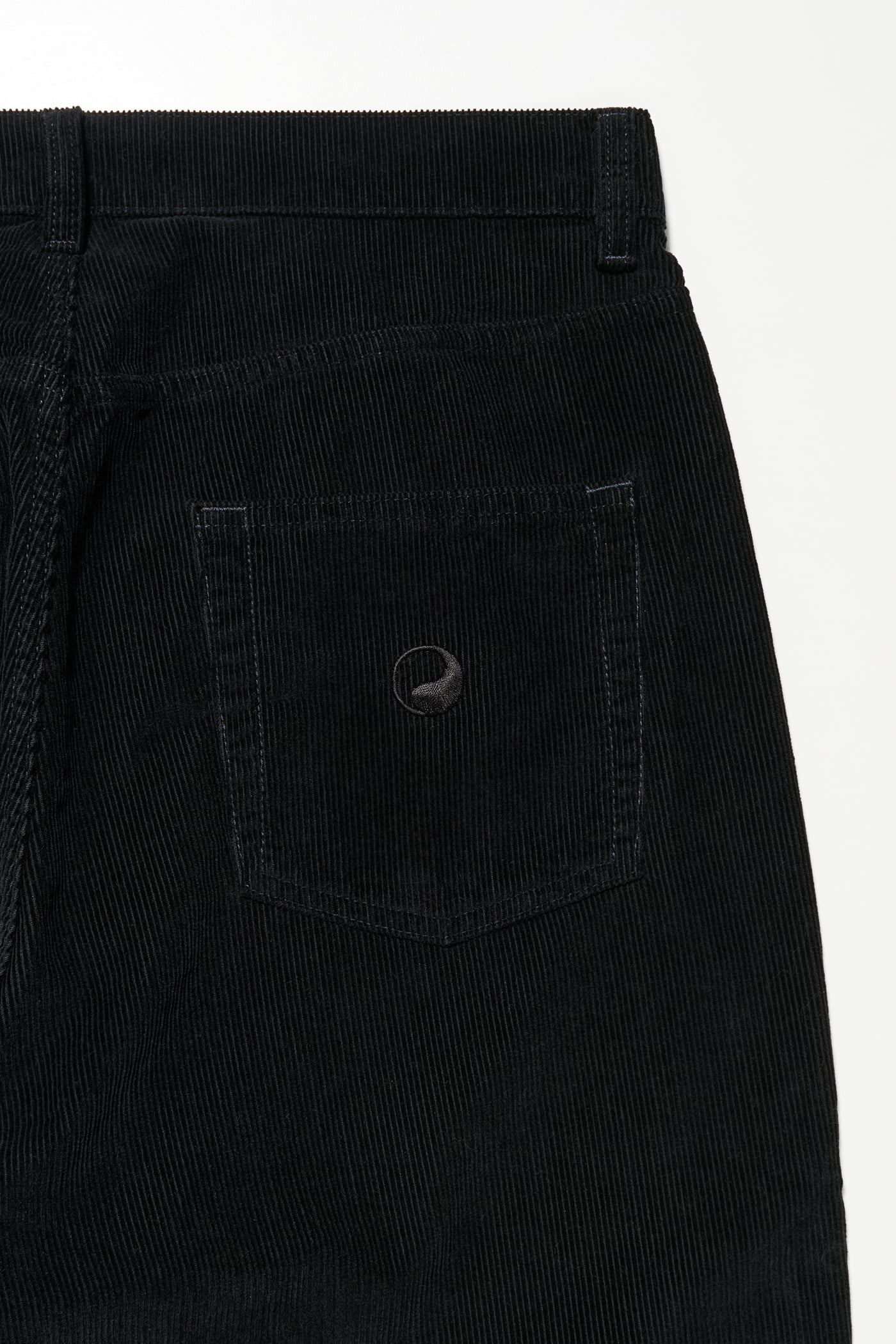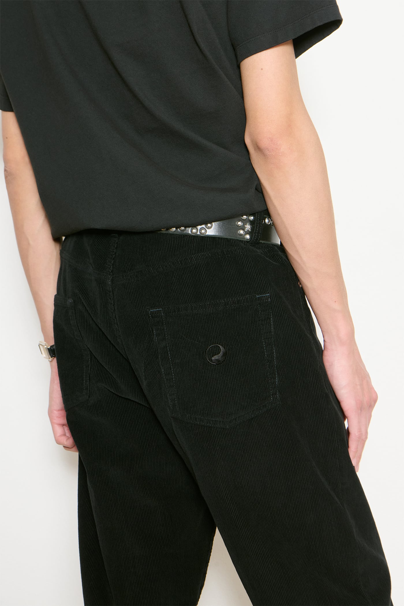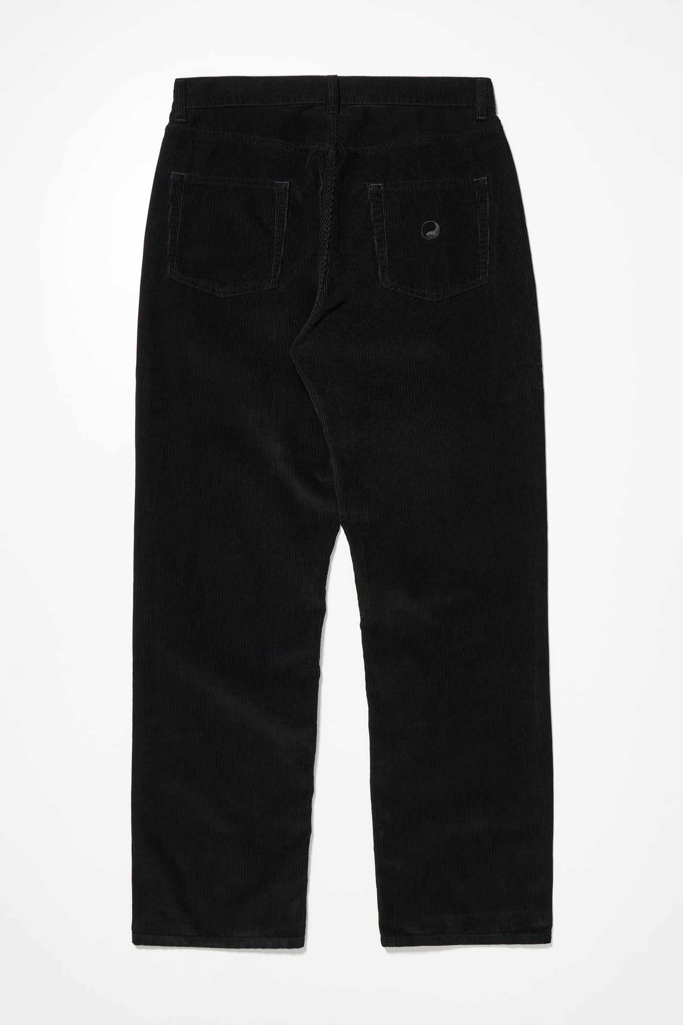 Our Work Cut in Overdye Black Cord. Produced in Italian deadstock cotton cord fabric, the Work Cut has a mid rise with a regular, tapered fit and features five pockets, a button fly and Yin Yang embroidery.