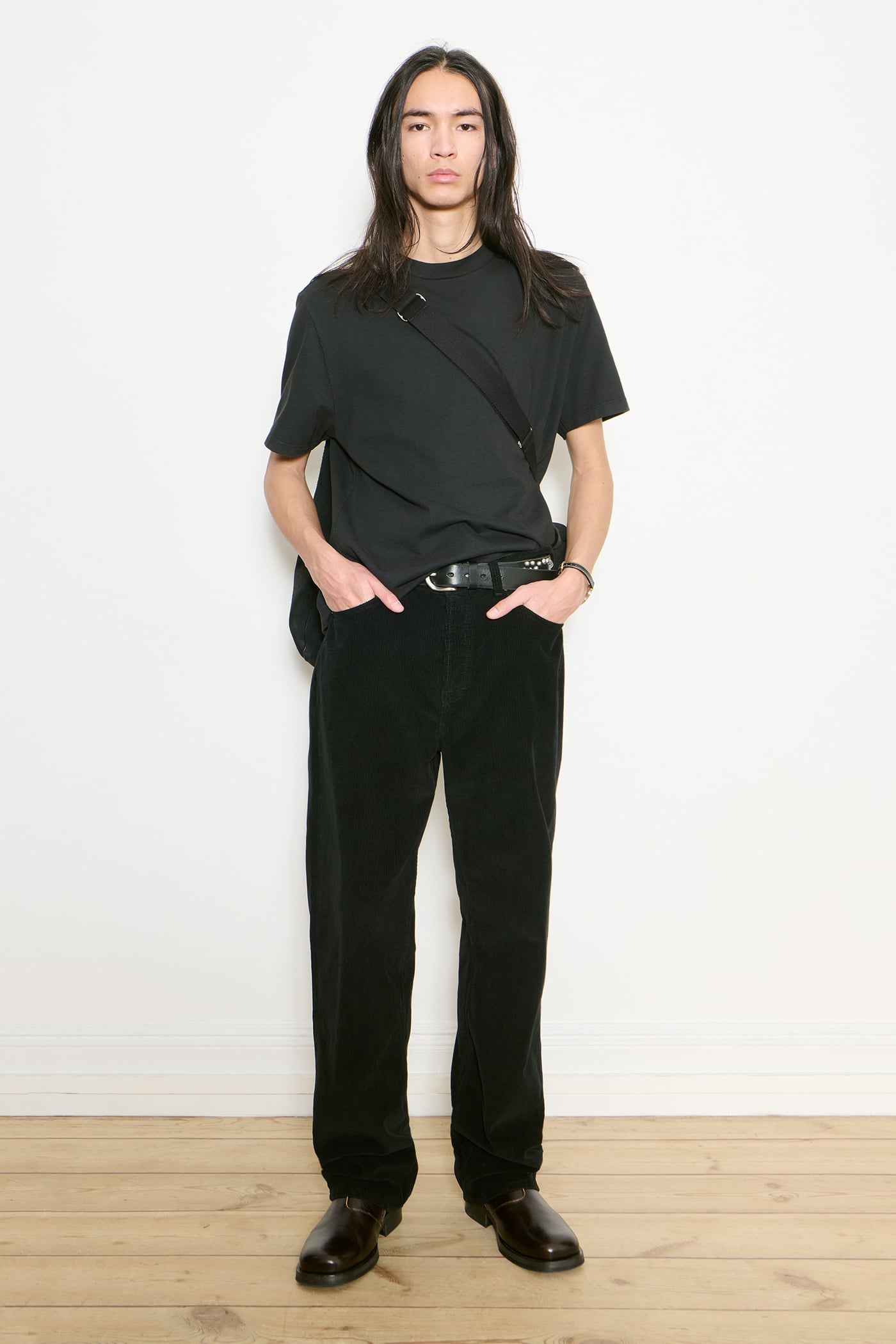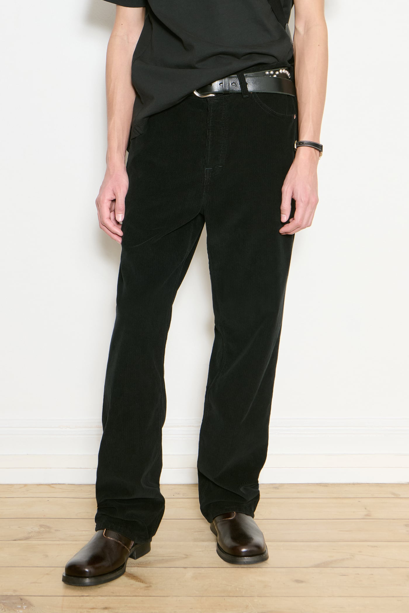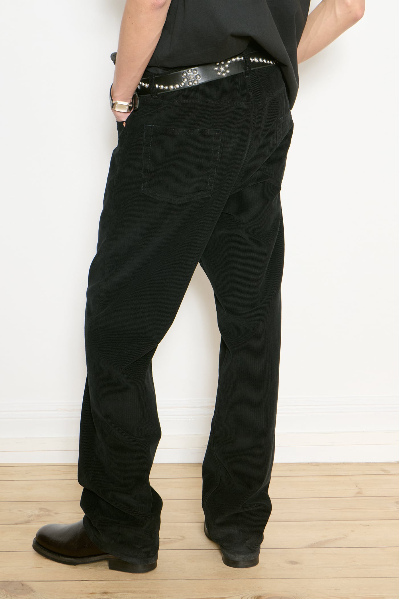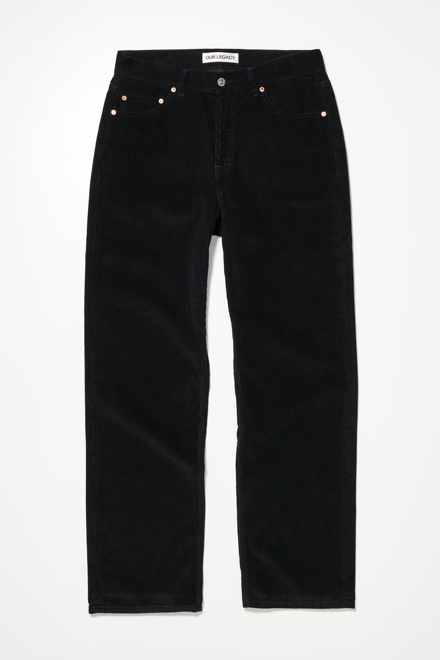 Our Work Cut in Overdye Black Cord. Produced in Italian deadstock cotton cord fabric, the Work Cut has a mid rise with a regular, tapered fit and features five pockets, a button fly and Yin Yang embroidery.