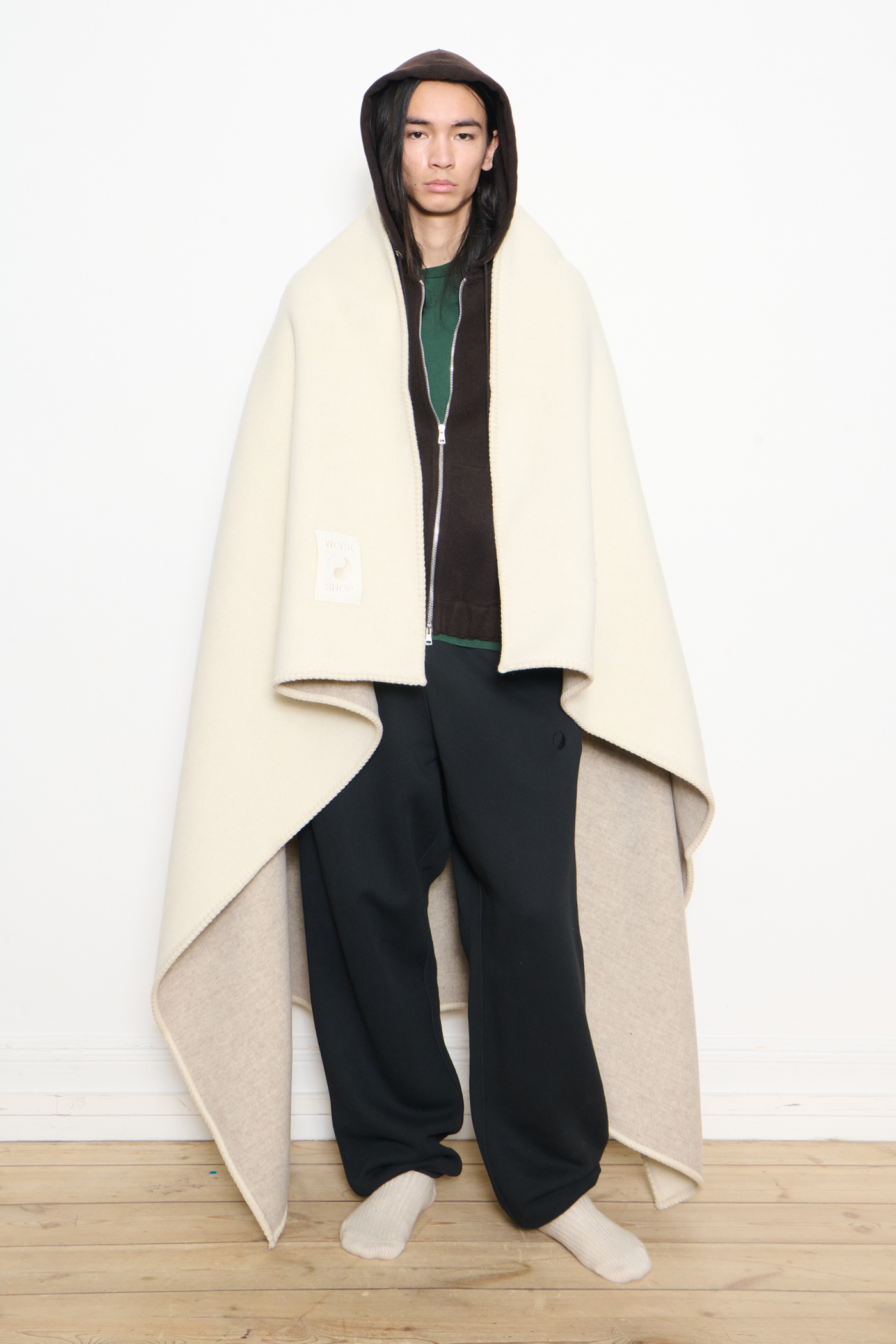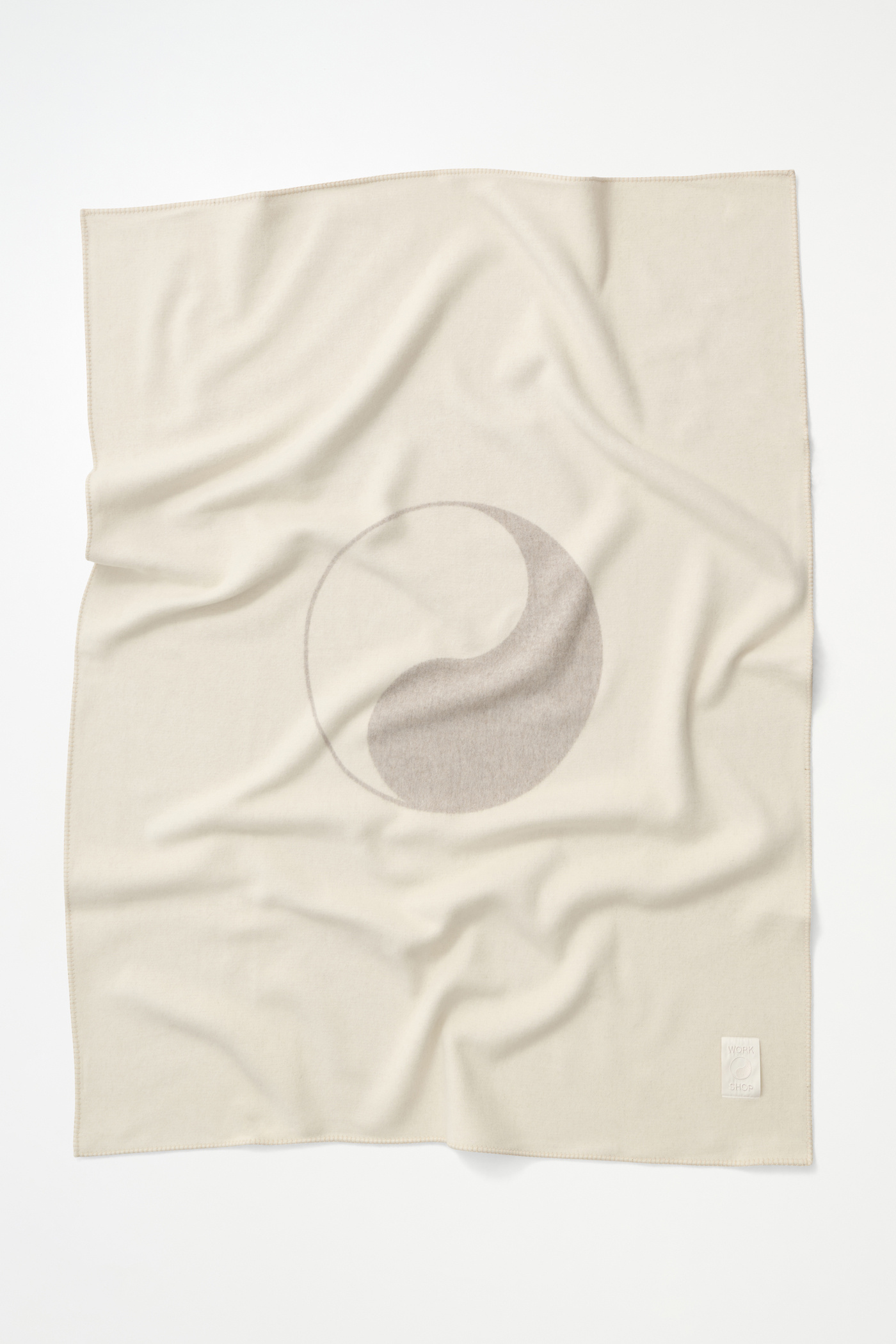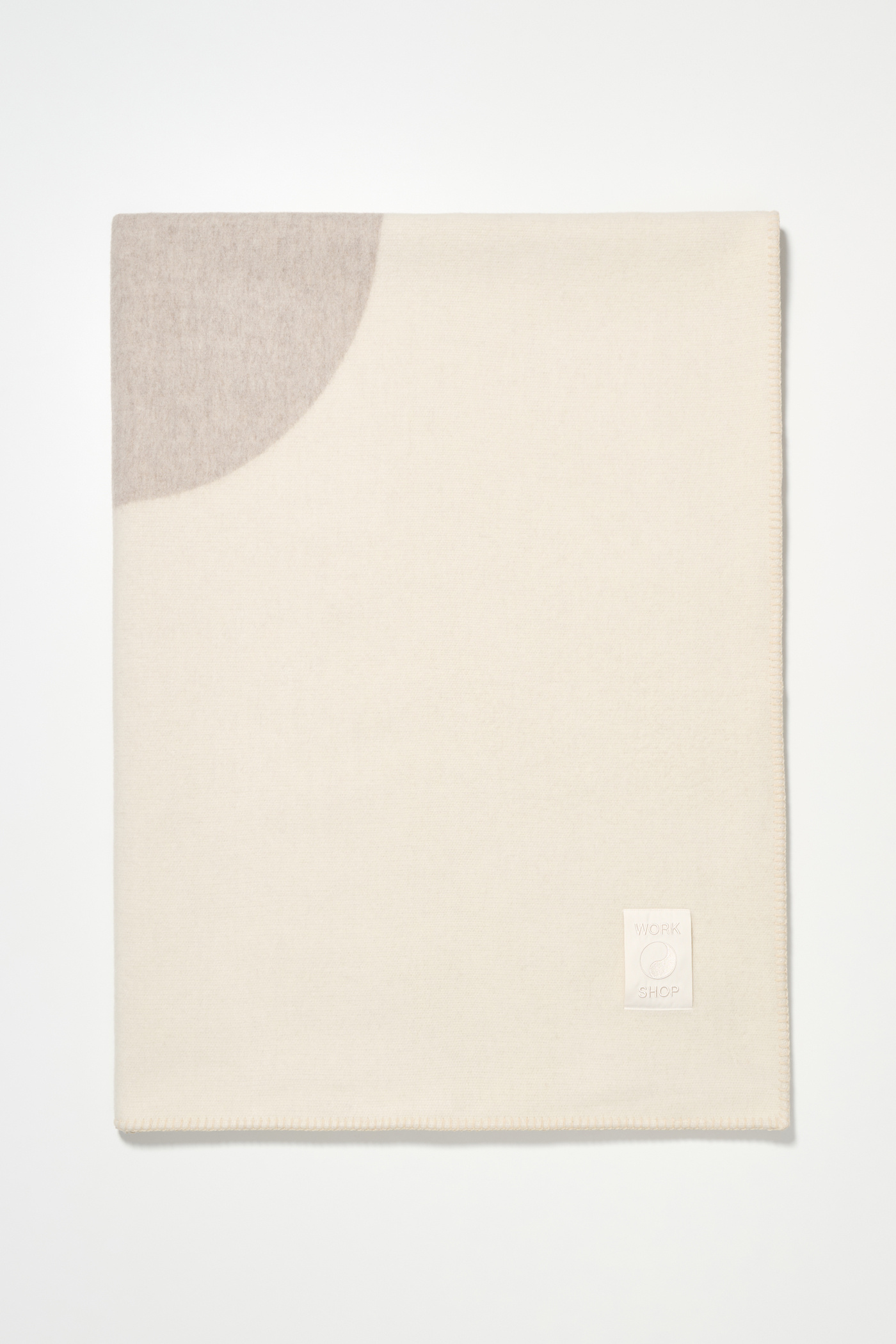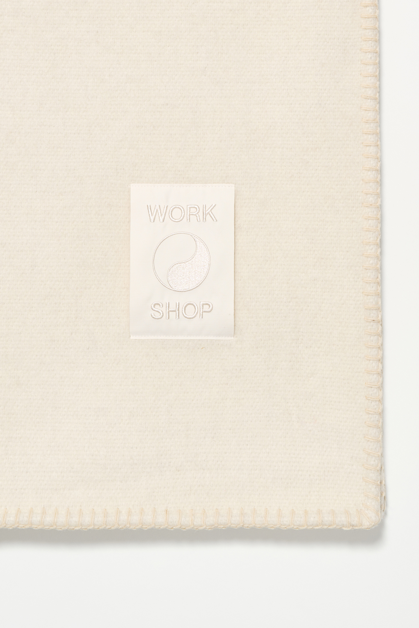 Our Work Shop Blanket in Neutral. Produced in a soft thick Italian natural wool, the Blanket features carpet stitched hems, a woven Our Legacy Yin Yang logo and a Work Shop patch.