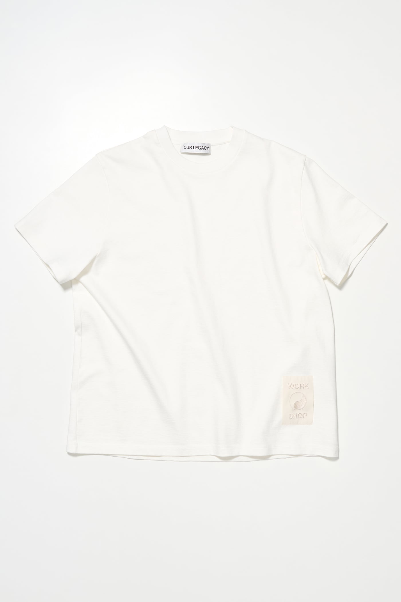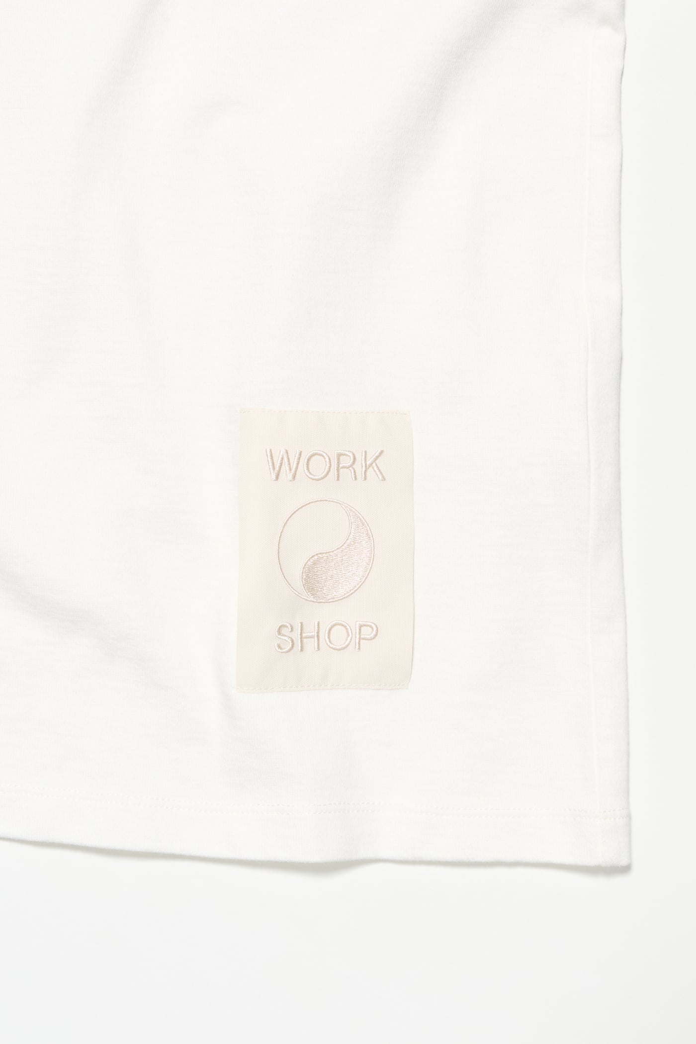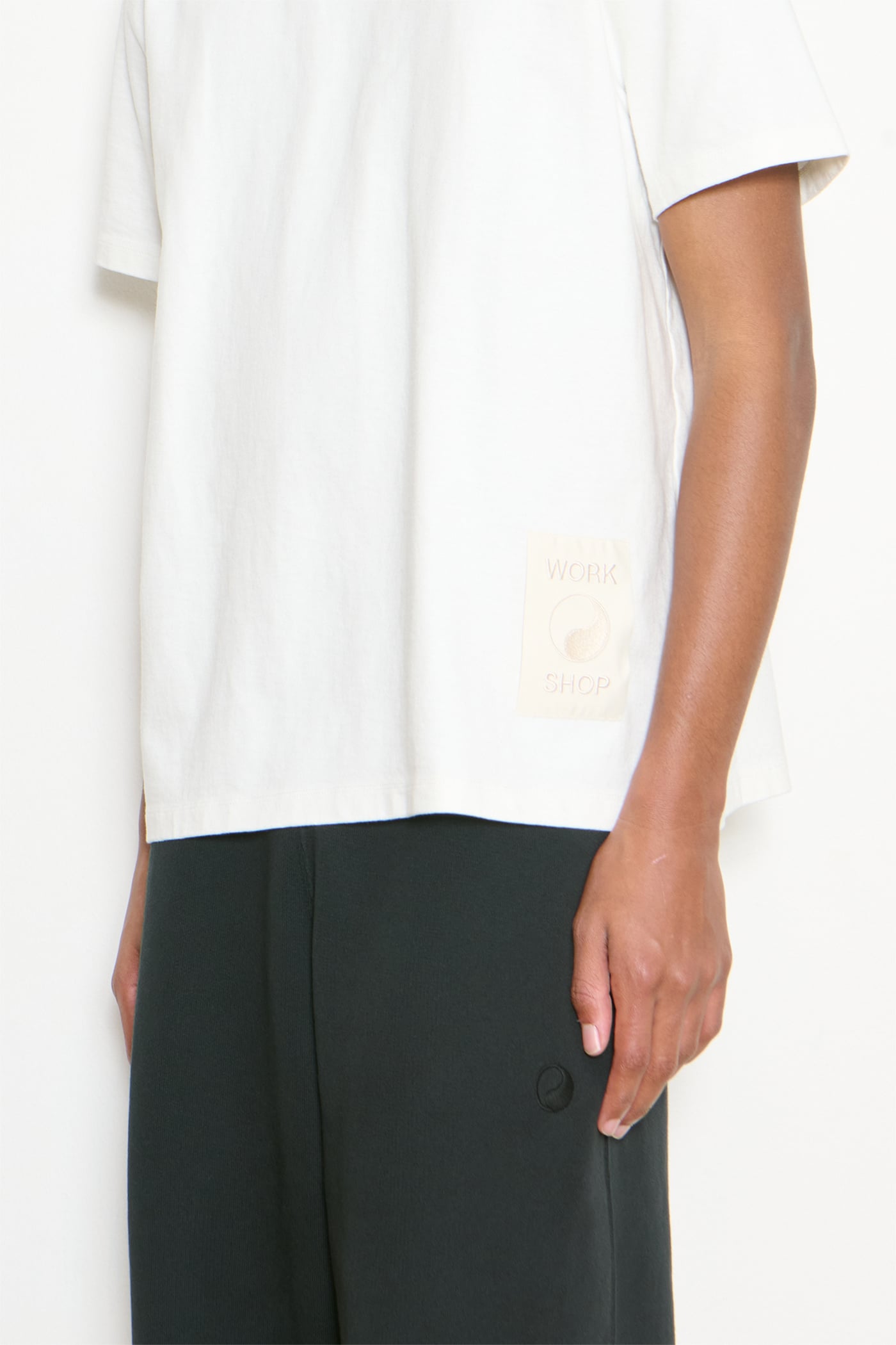 Our Work Shop Box Tee in Solid White. Produced in Italian deadstock cotton fabric, the Box Tee has a slightly oversized, boxy fit and features a ribbed collar, straight hem and a Work Shop patch.
