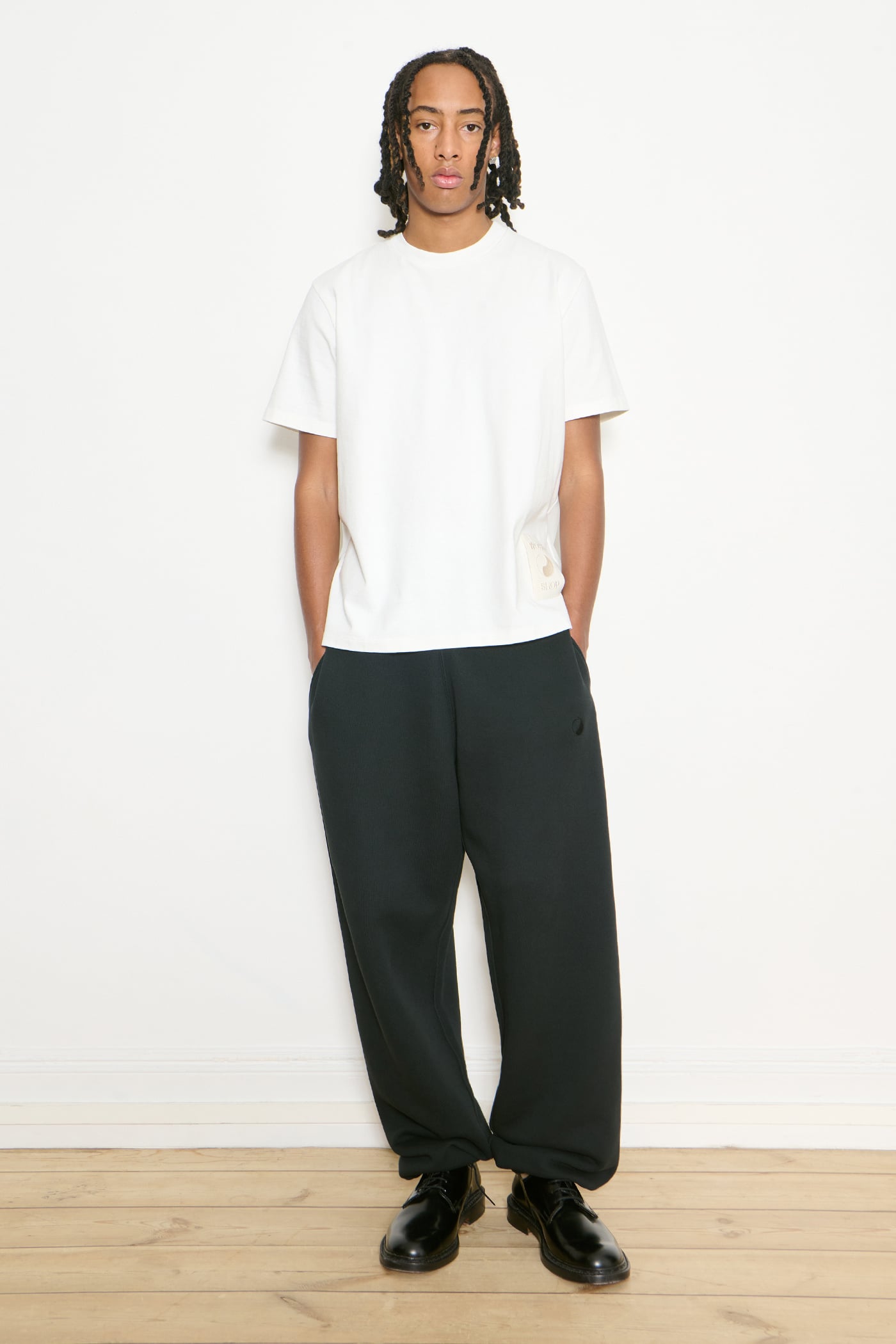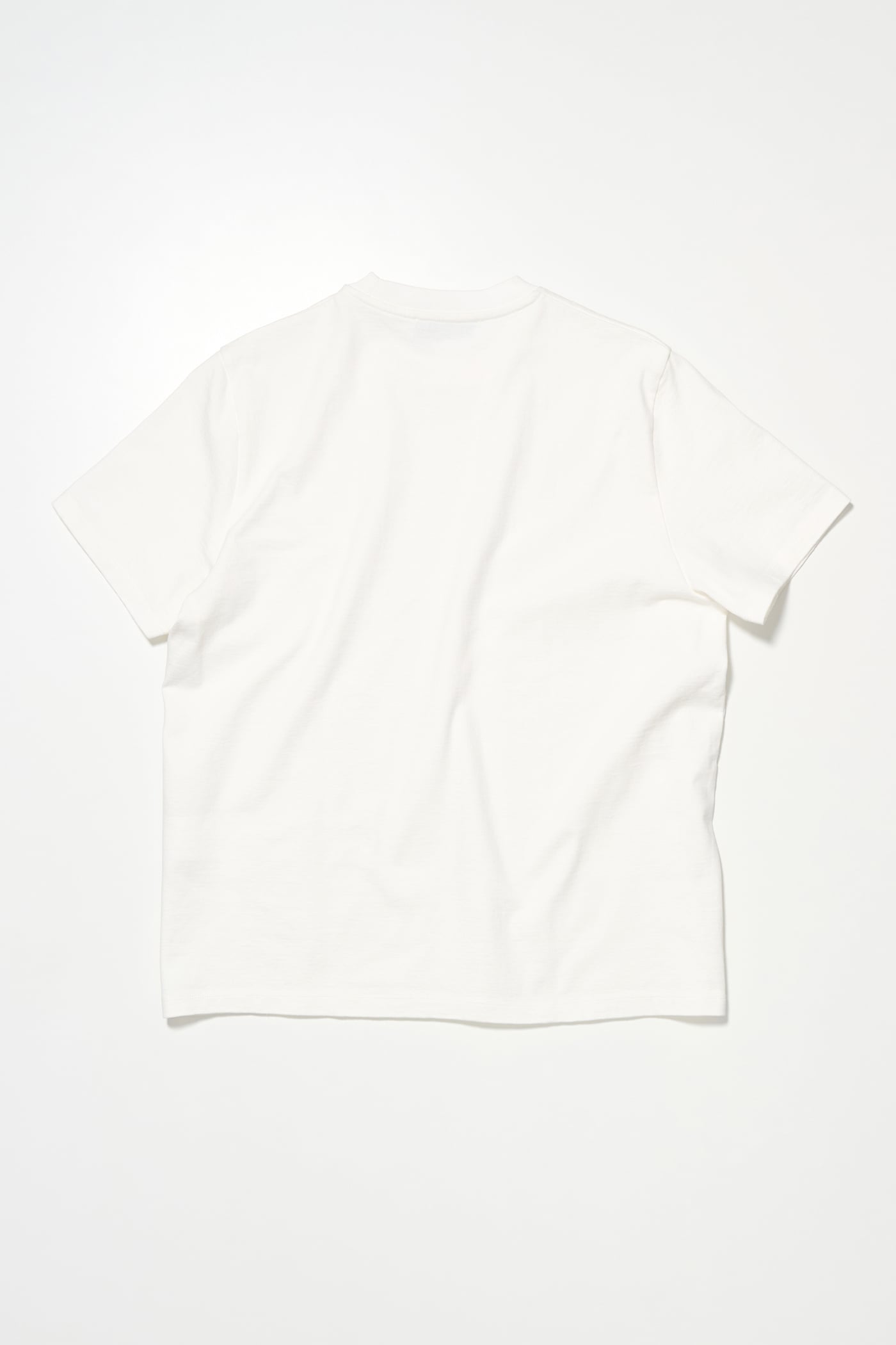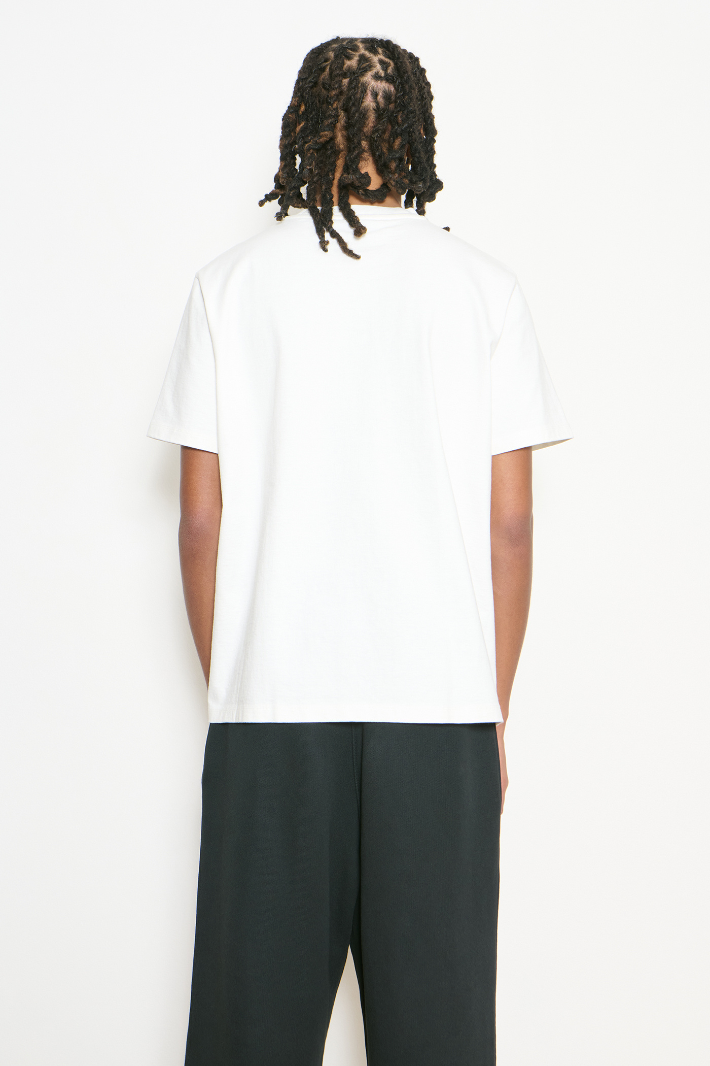 Our Work Shop Box Tee in Solid White. Produced in Italian deadstock cotton fabric, the Box Tee has a slightly oversized, boxy fit and features a ribbed collar, straight hem and a Work Shop patch.