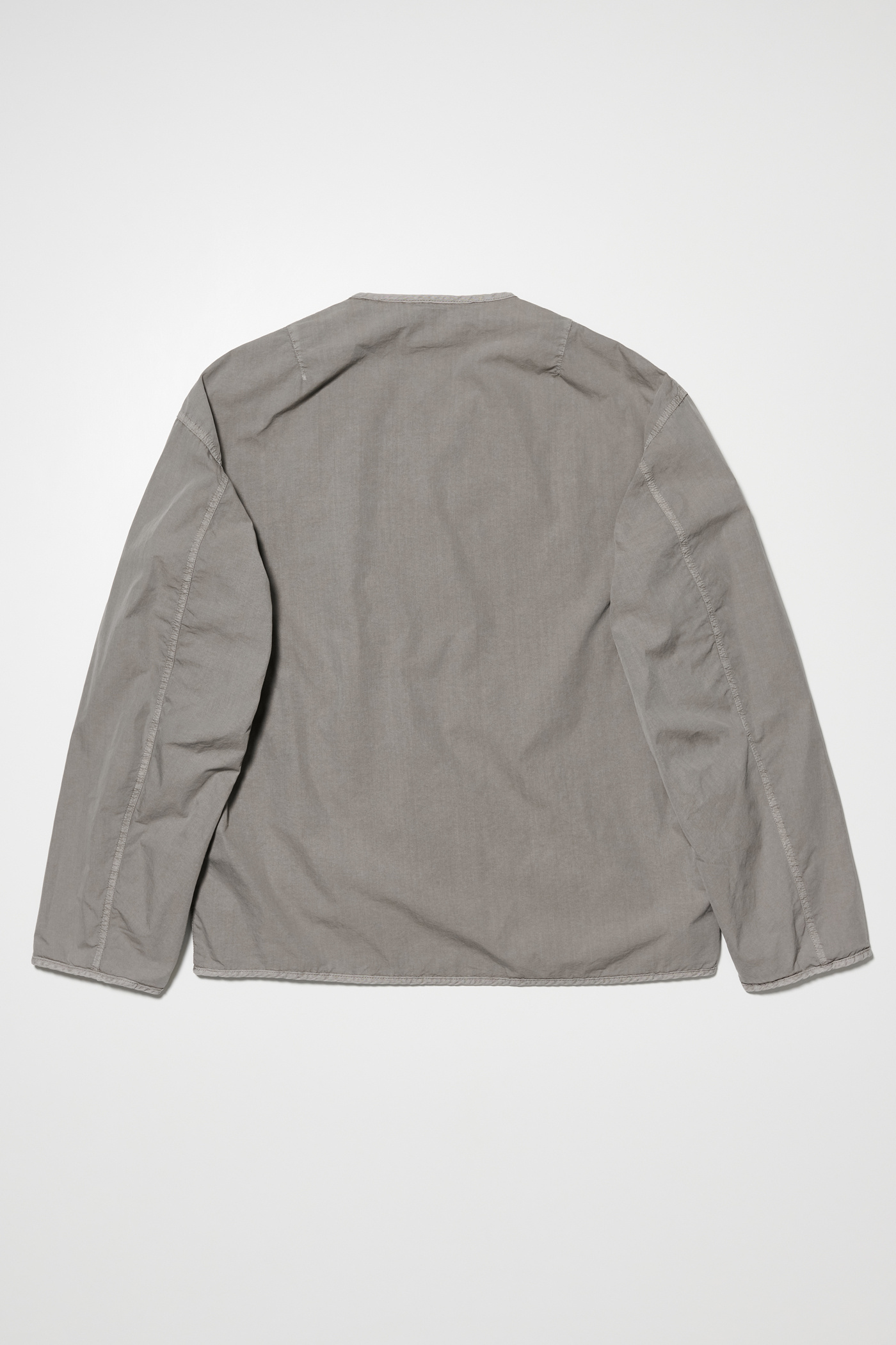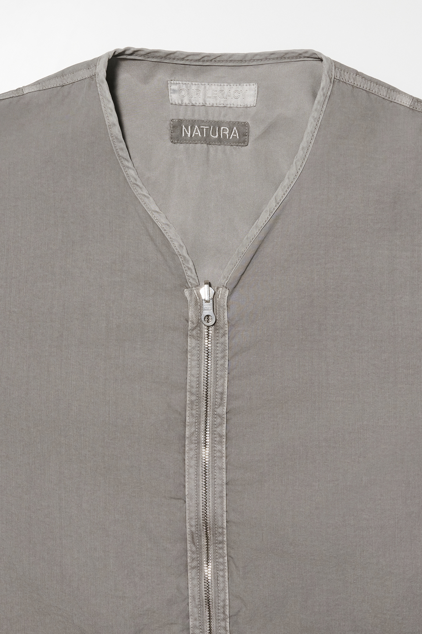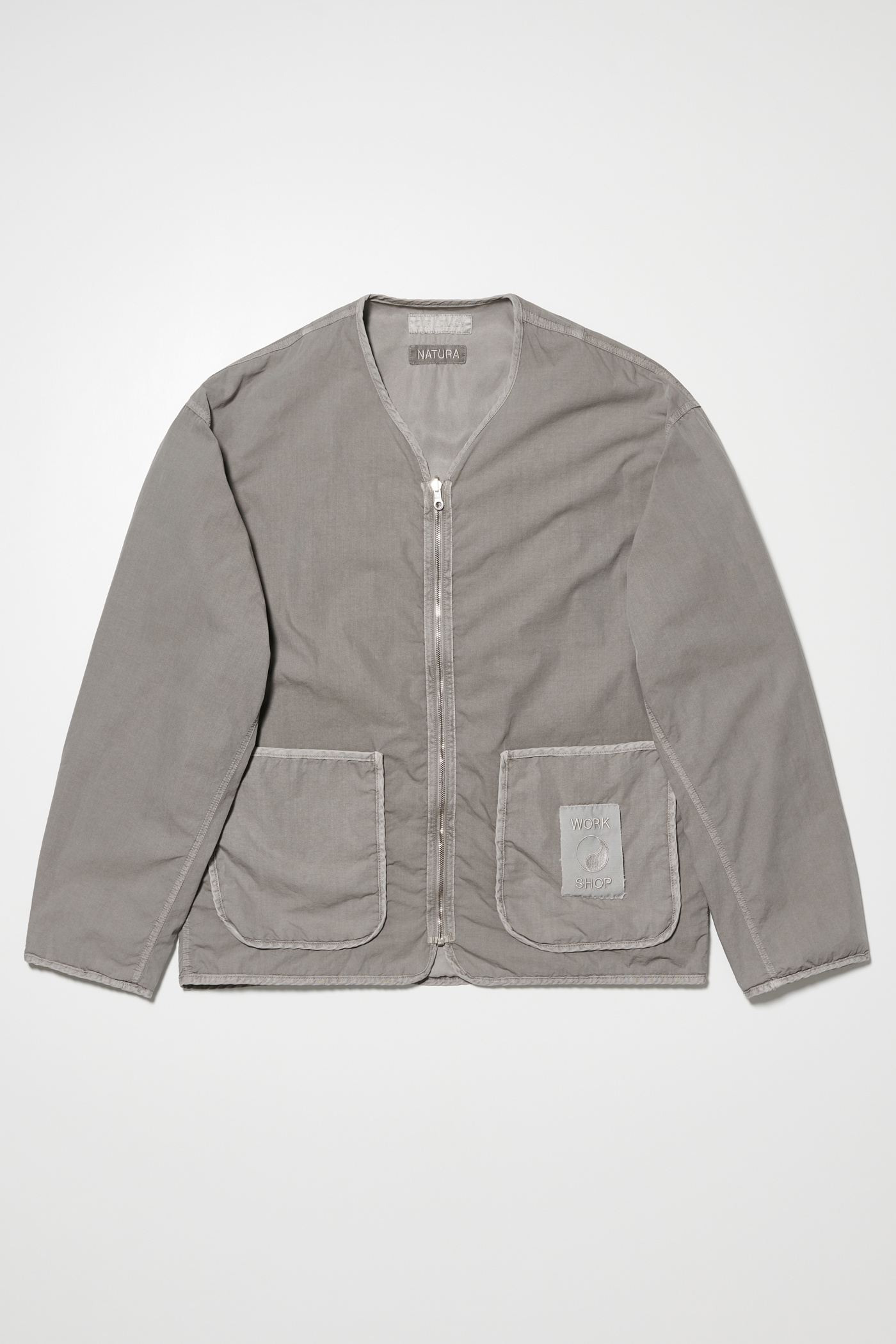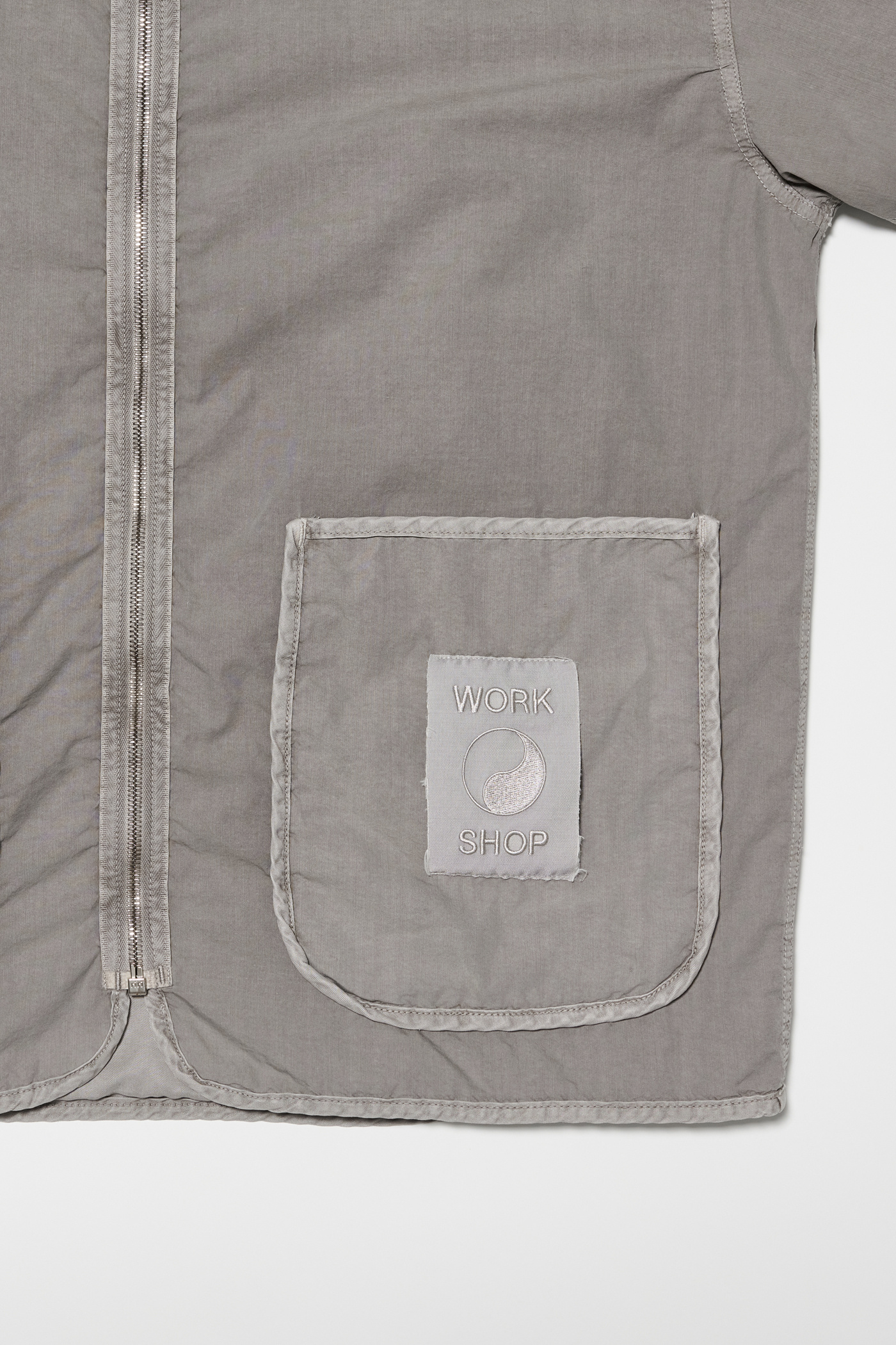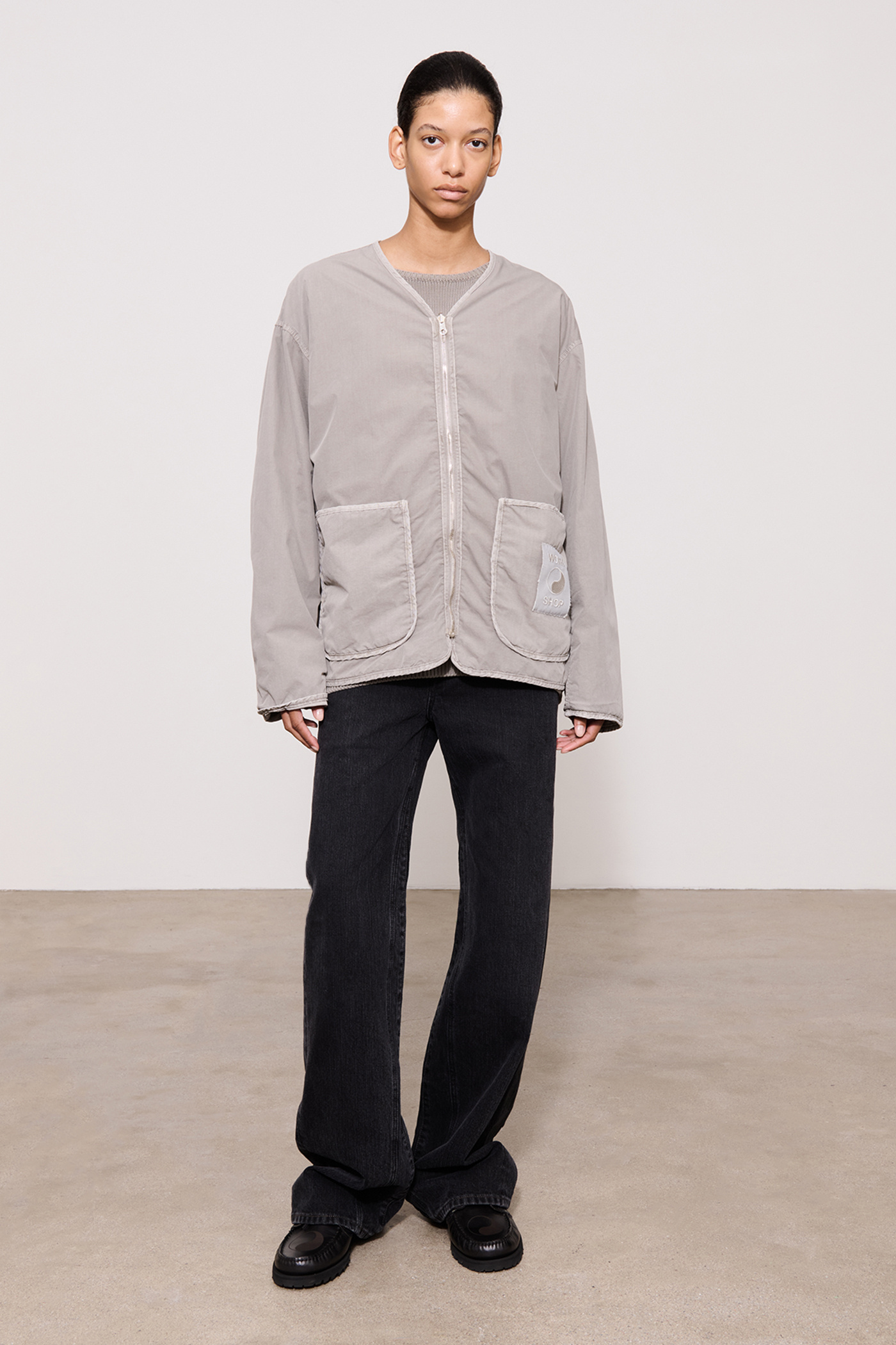 Our Work Shop Liner in Nero. Produced in an Italian cotton and polyamide blend fabric and natural dyed in Italy, the Work Shop Liner has a relaxed, boxy fit and features a reversible zip closure, two patch pockets, a Work Shop patch and a single chest pocket on the the reverse side.