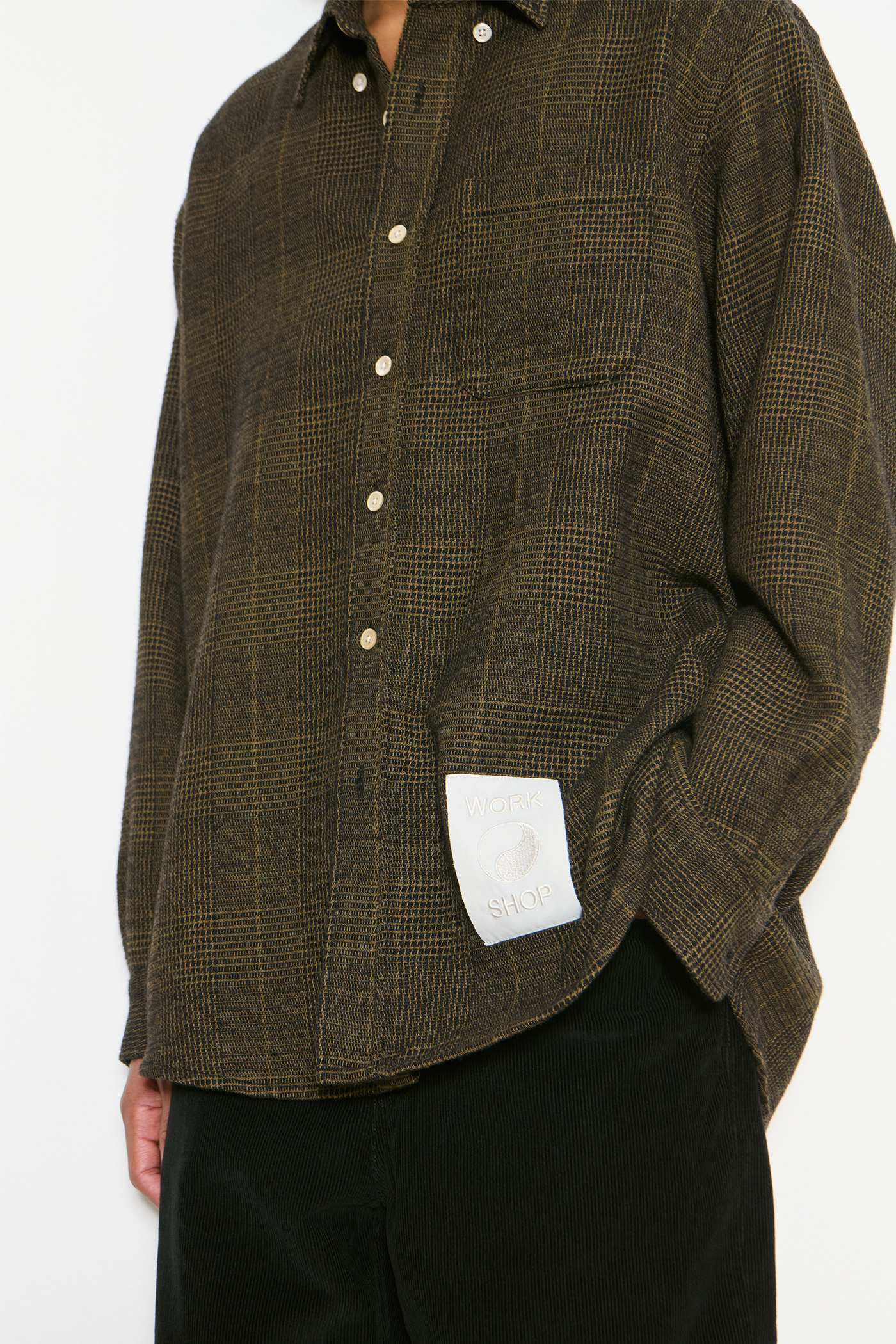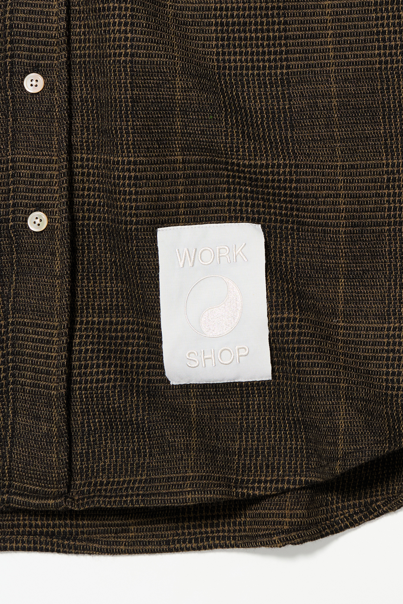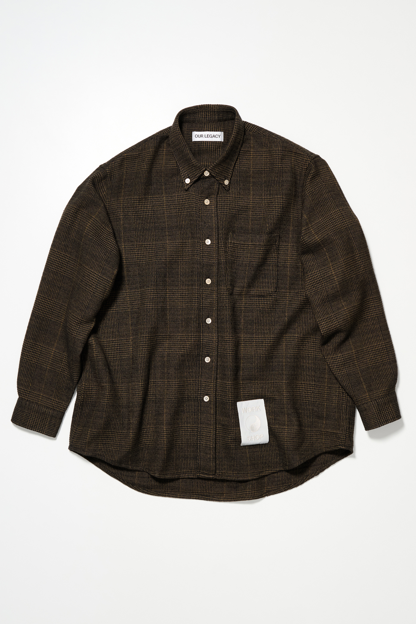 Our Work Shop Shirt in Black Mustard Check. Produced in an Italian deadstock virgin wool and polyester fabric, the Work Shop Shirt has a relaxed fit and features mother of pearl buttons, a button-down collar, a single chest pocket, button cuffs, a curved hem and a Work Shop patch.