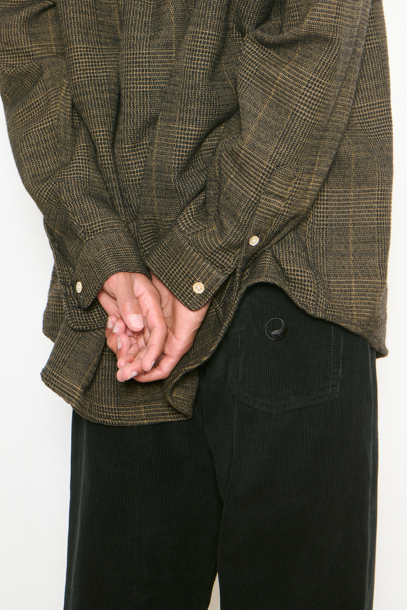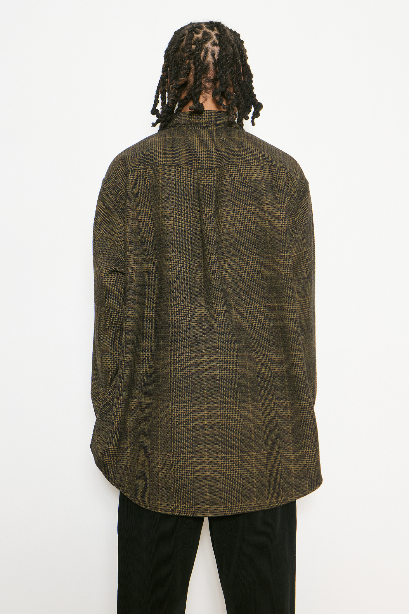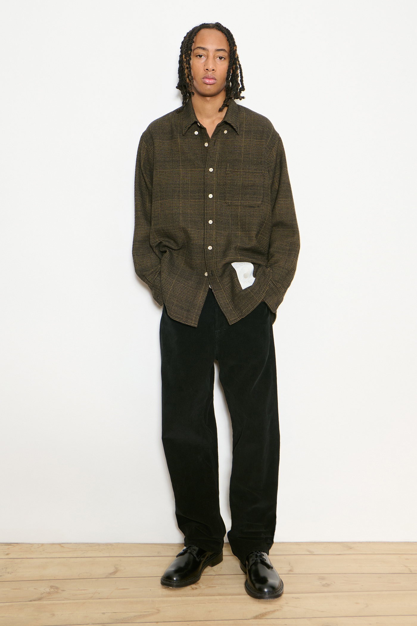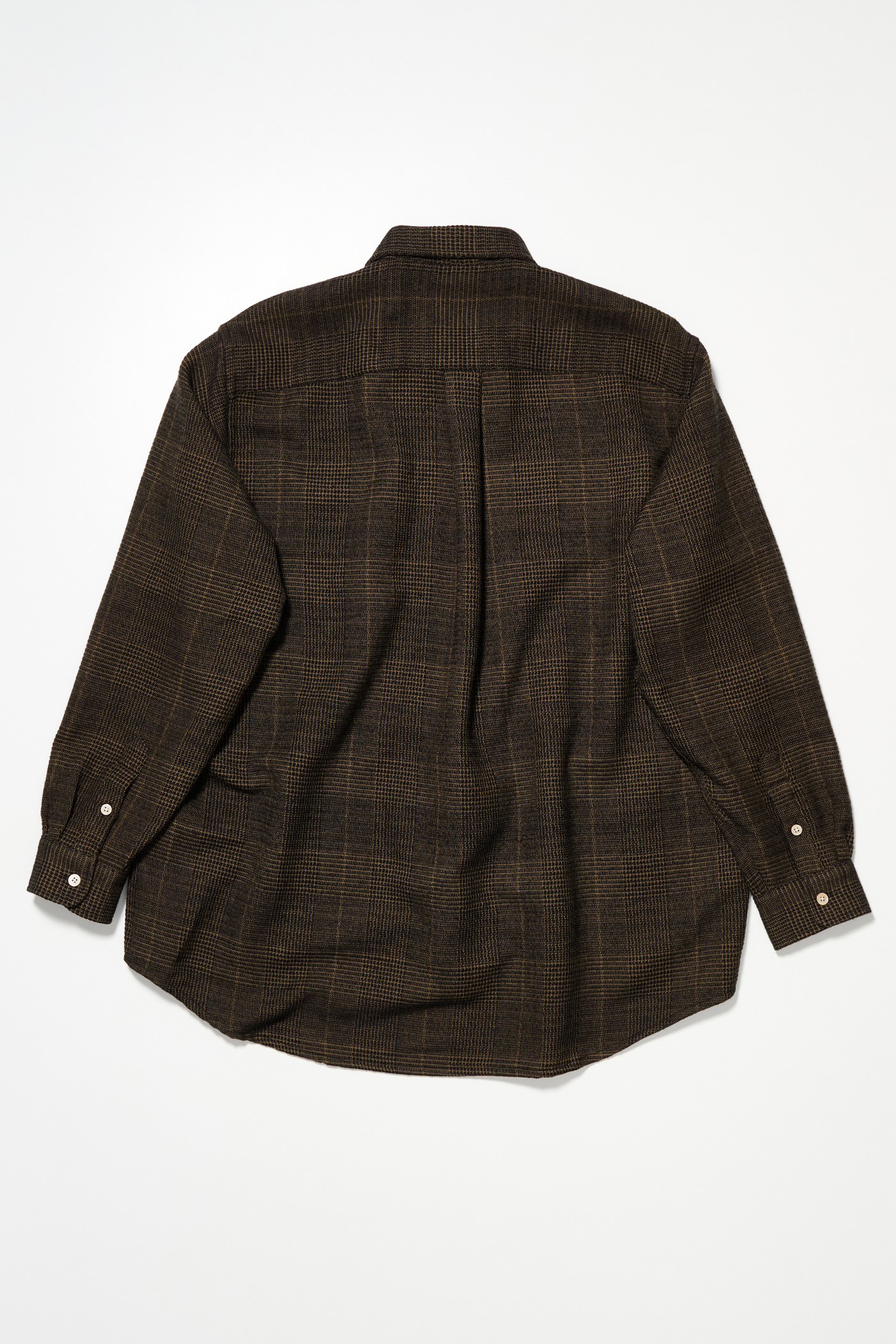 Our Work Shop Shirt in Black Mustard Check. Produced in an Italian deadstock virgin wool and polyester fabric, the Work Shop Shirt has a relaxed fit and features mother of pearl buttons, a button-down collar, a single chest pocket, button cuffs, a curved hem and a Work Shop patch.