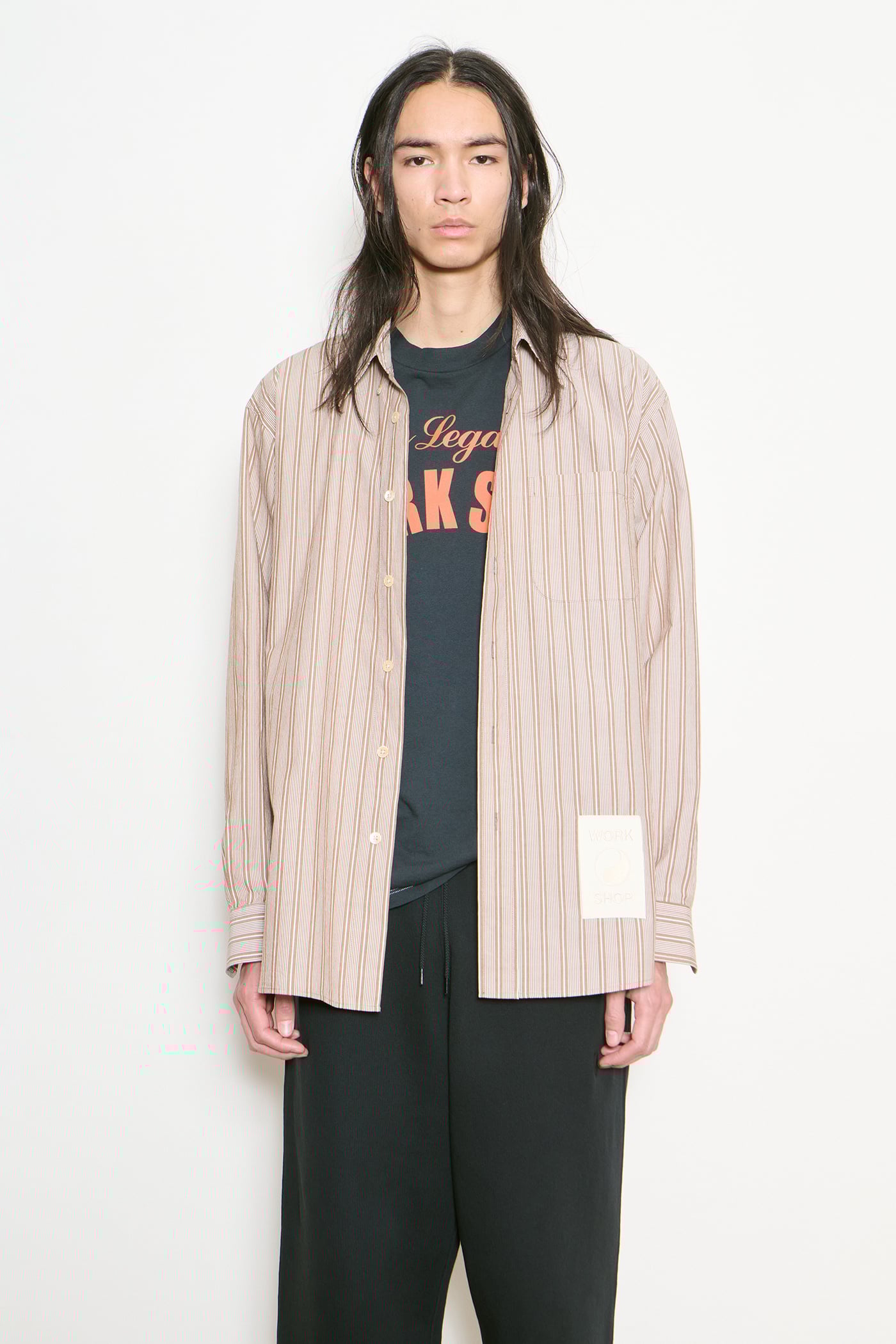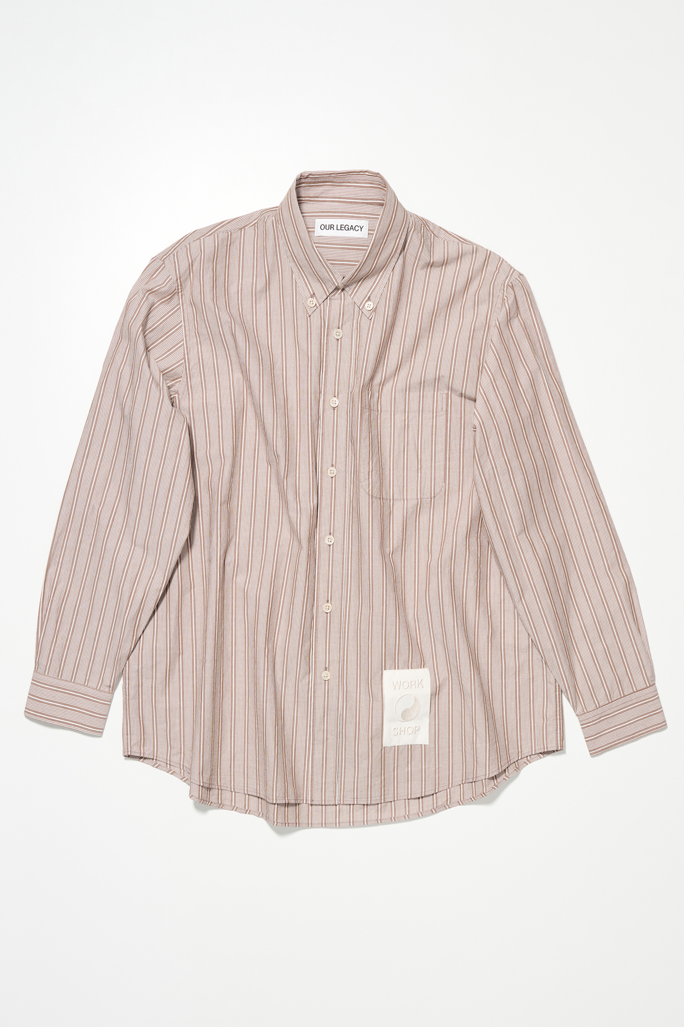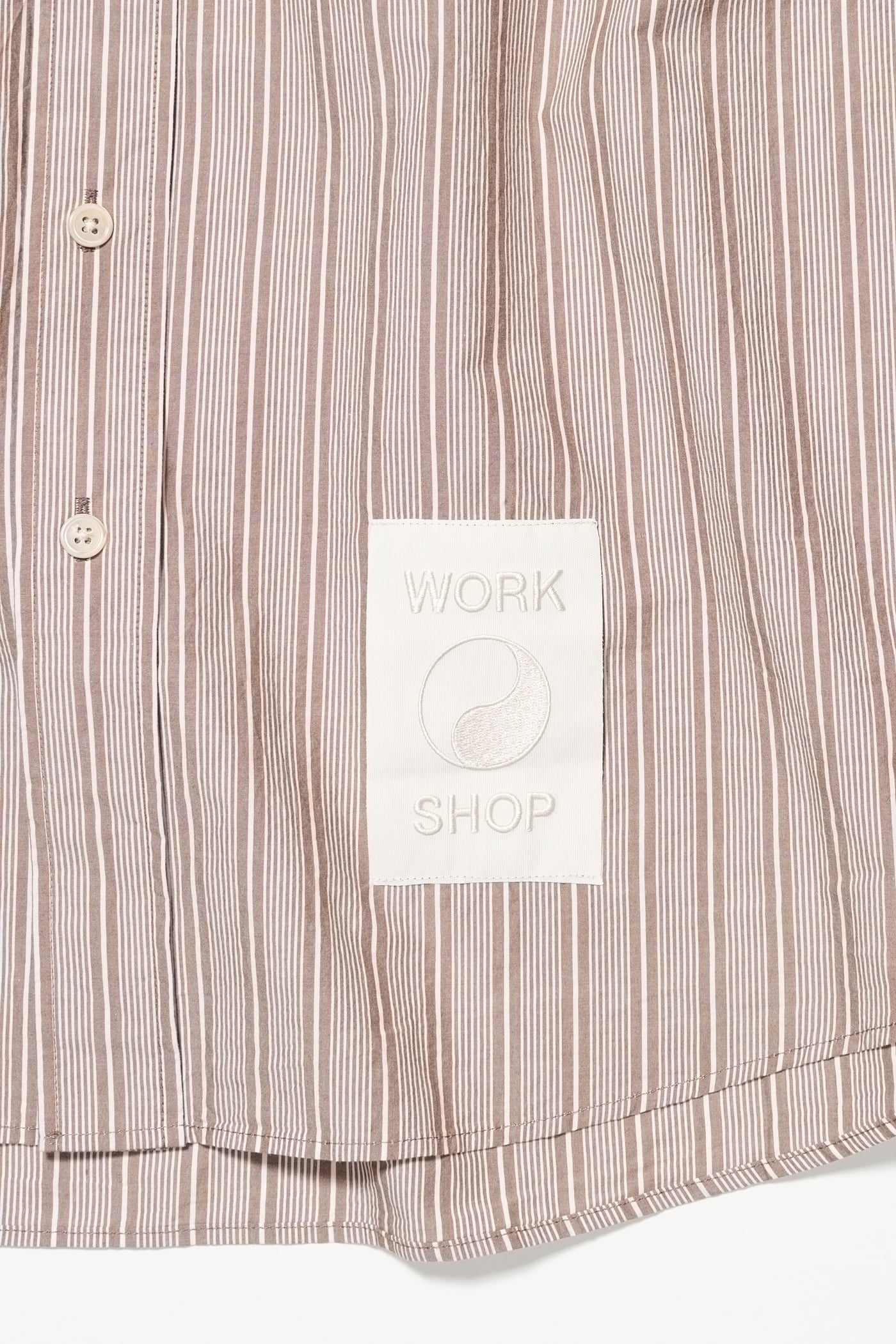 Our Work Shop Shirt in Brown White Stripe. Produced in a Japanese deadstock cotton fabric, the Work Shop Shirt has a relaxed fit and features mother of pearl buttons, a button down collar, a single chest pocket, button cuffs, a curved hem and a Work Shop patch.