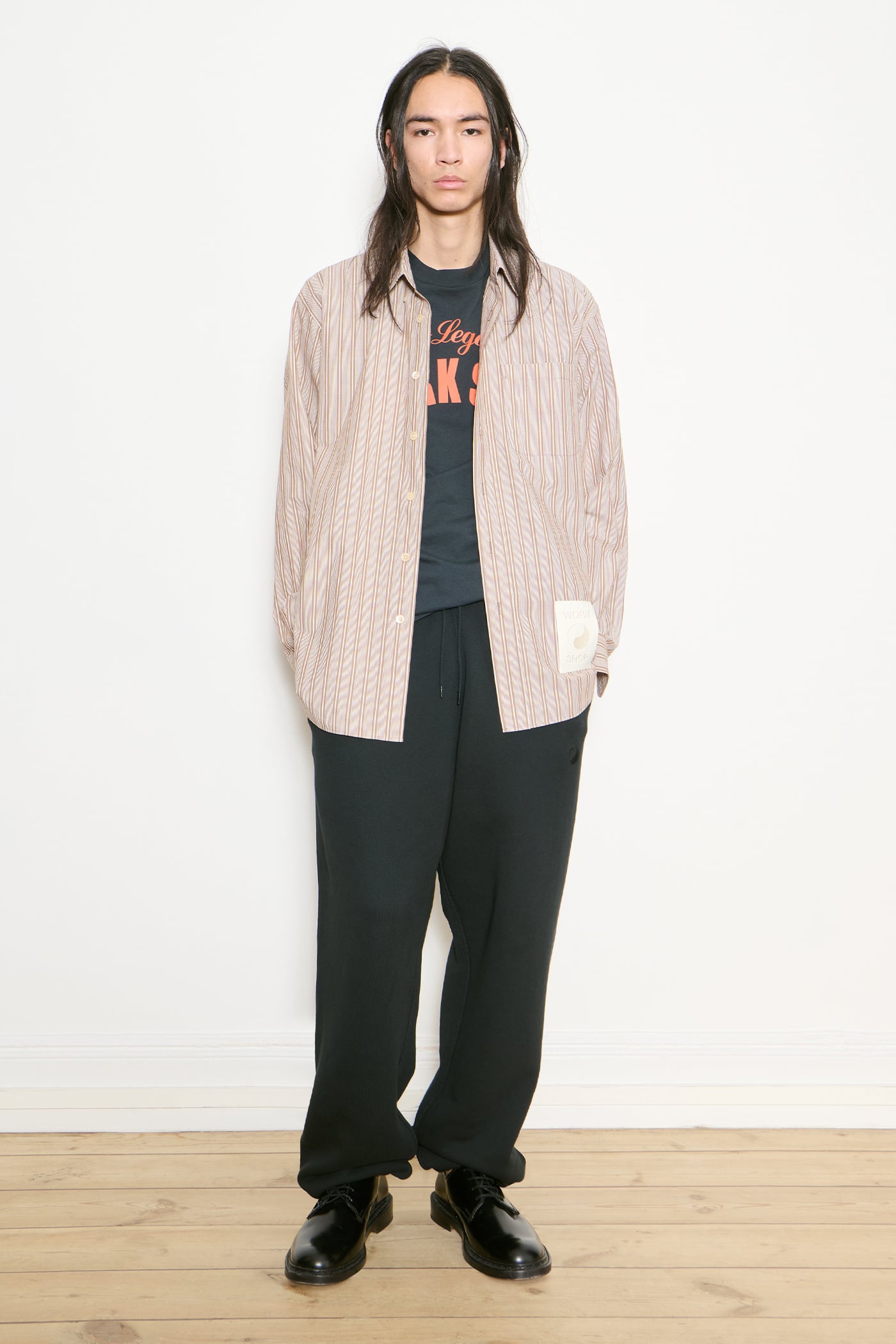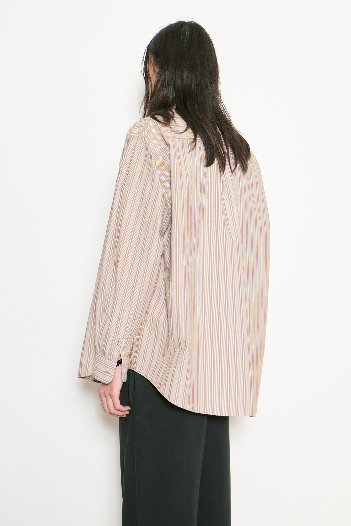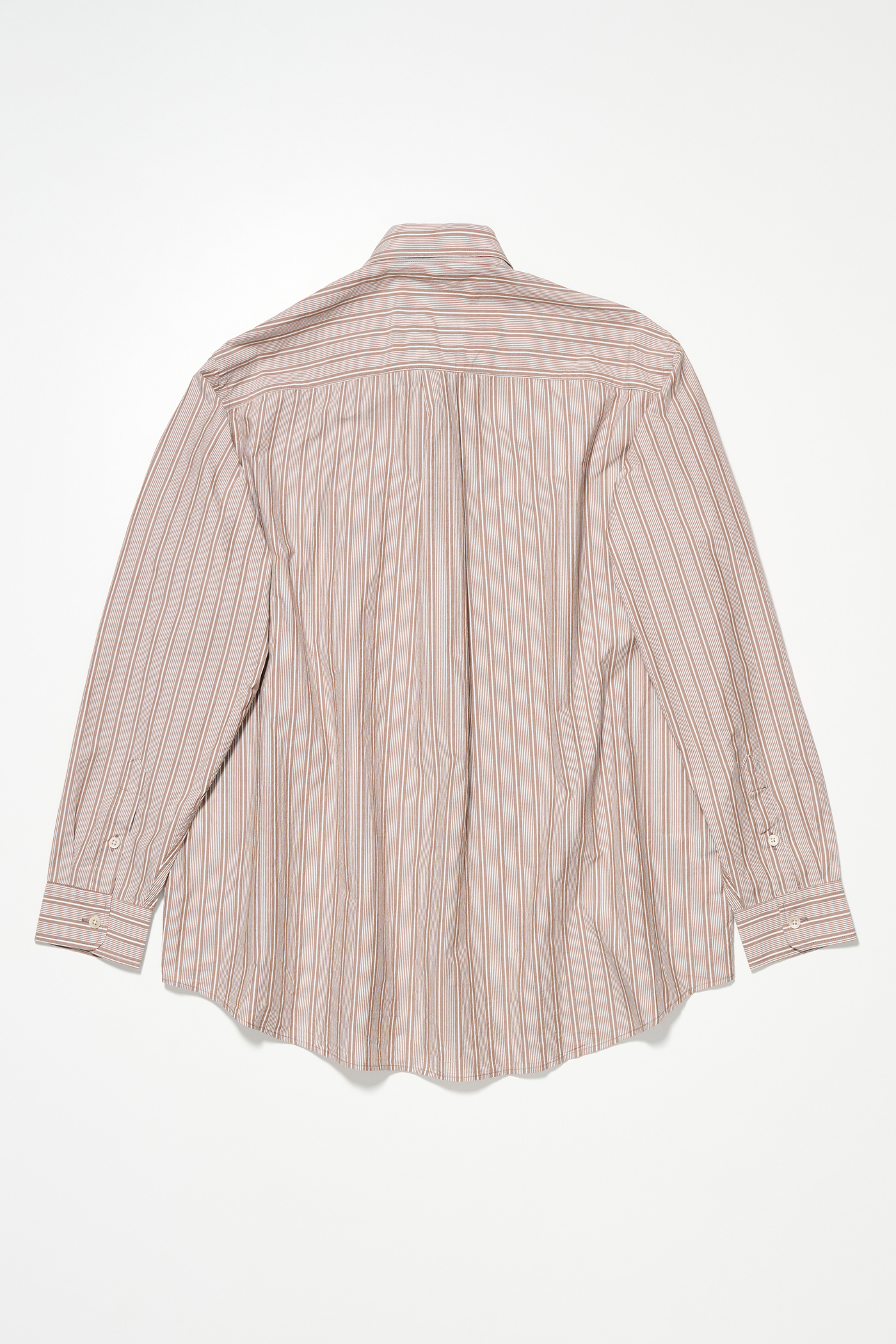 Our Work Shop Shirt in Brown White Stripe. Produced in a Japanese deadstock cotton fabric, the Work Shop Shirt has a relaxed fit and features mother of pearl buttons, a button down collar, a single chest pocket, button cuffs, a curved hem and a Work Shop patch.