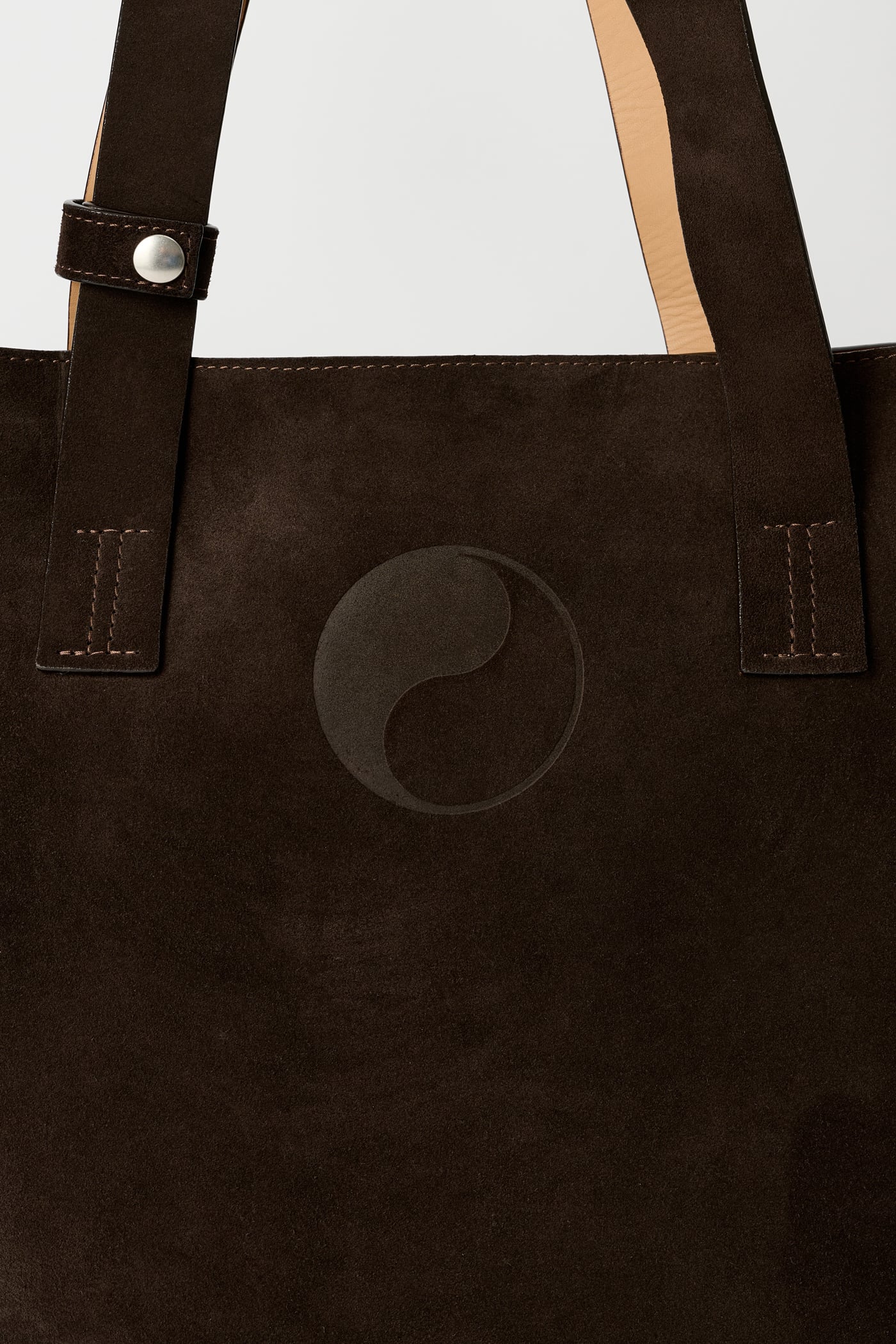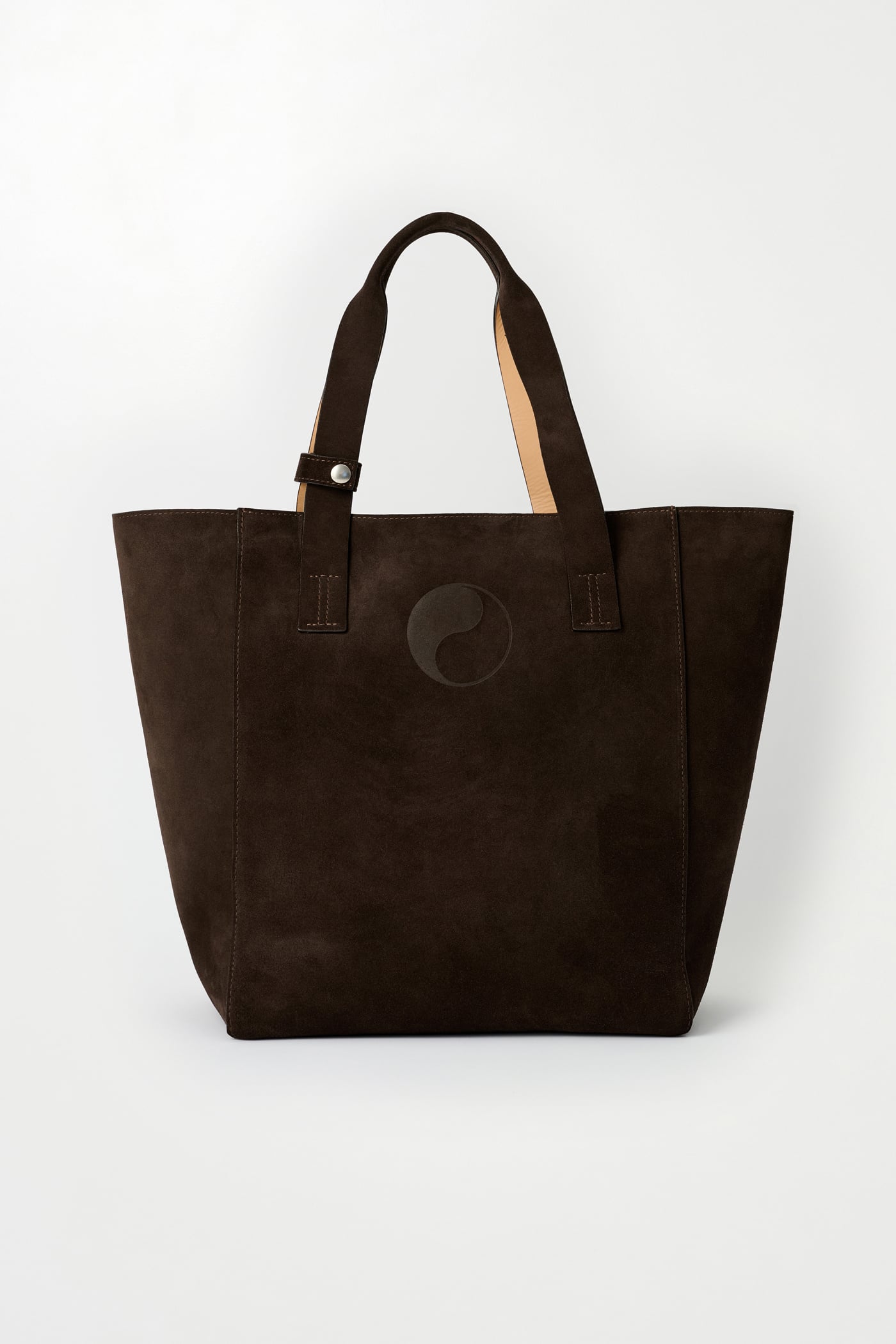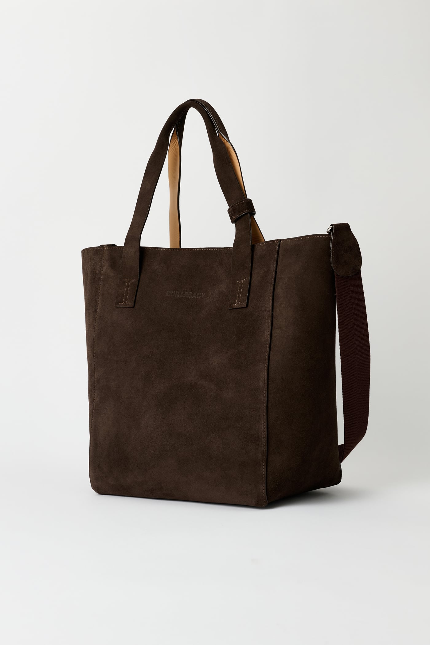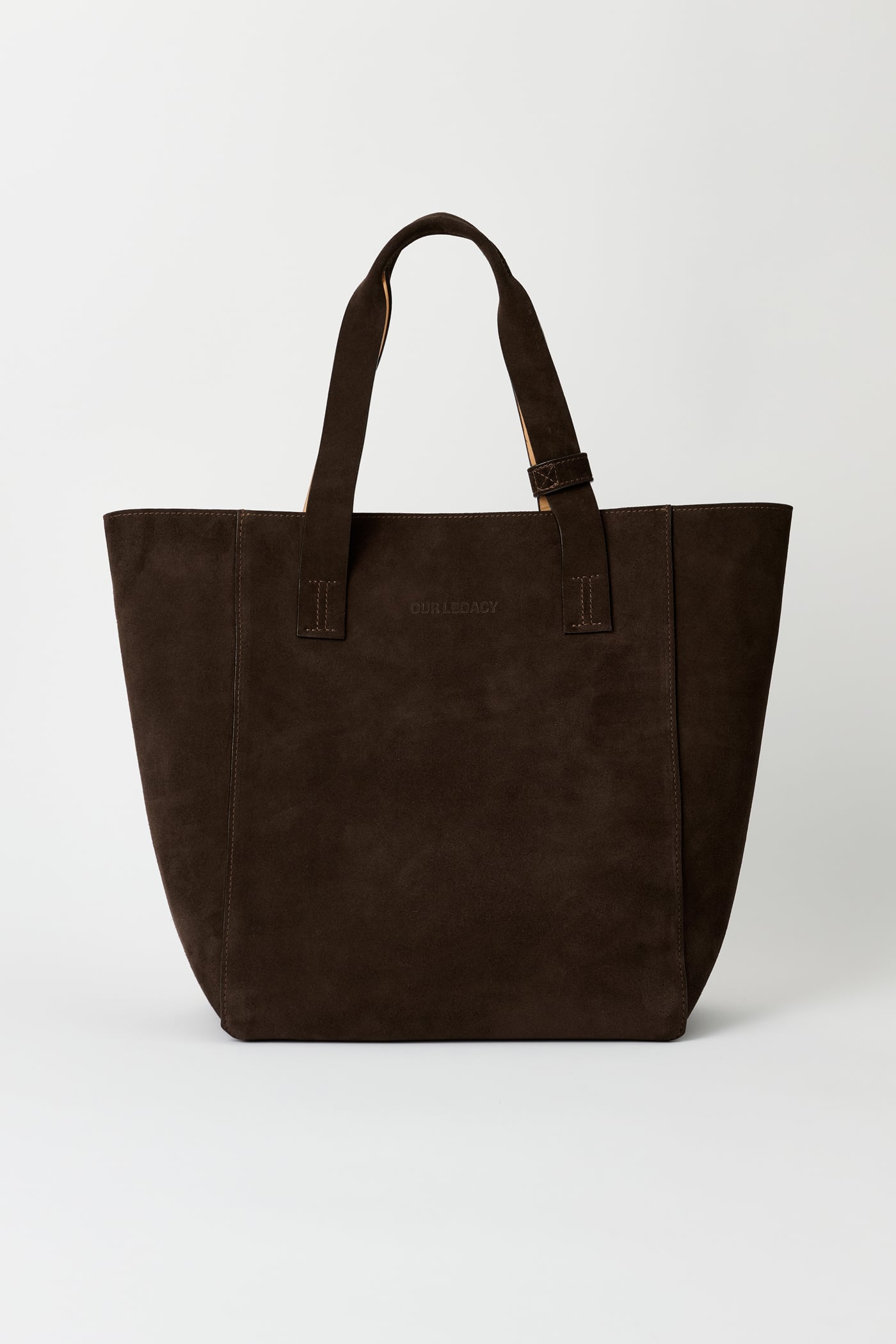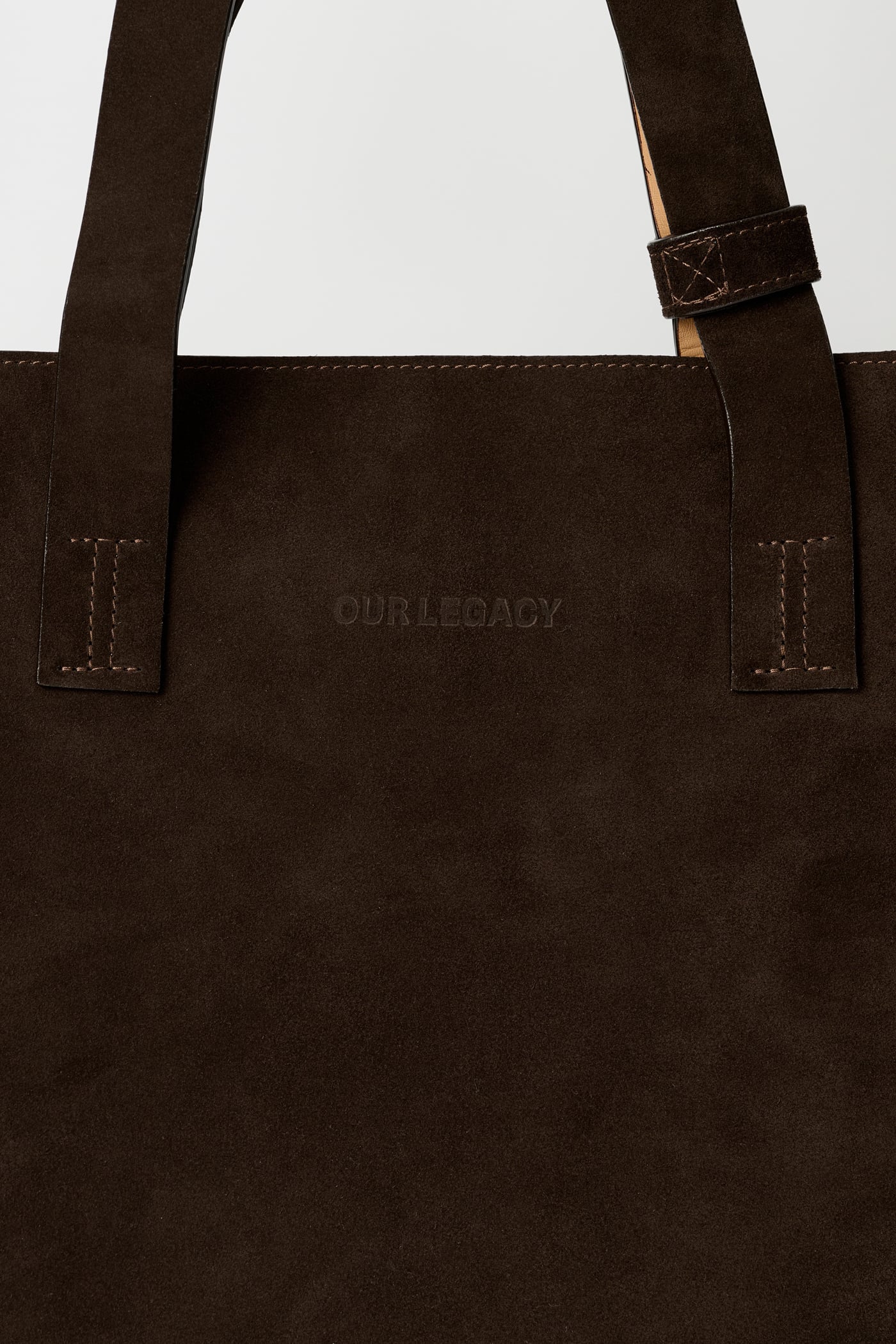 Our Work Tote in Deep Brown Suede. Produced in Italian suede, the Work Tote features a large central compartment, an inner pocket with double snap closure, patched and stitched leather carry handles, a detachable shoulder strap, debossed Yin Yang and Our Legacy logos, and is fully leather lined.
