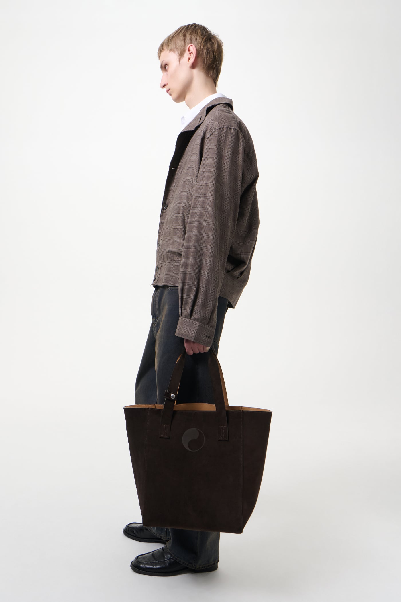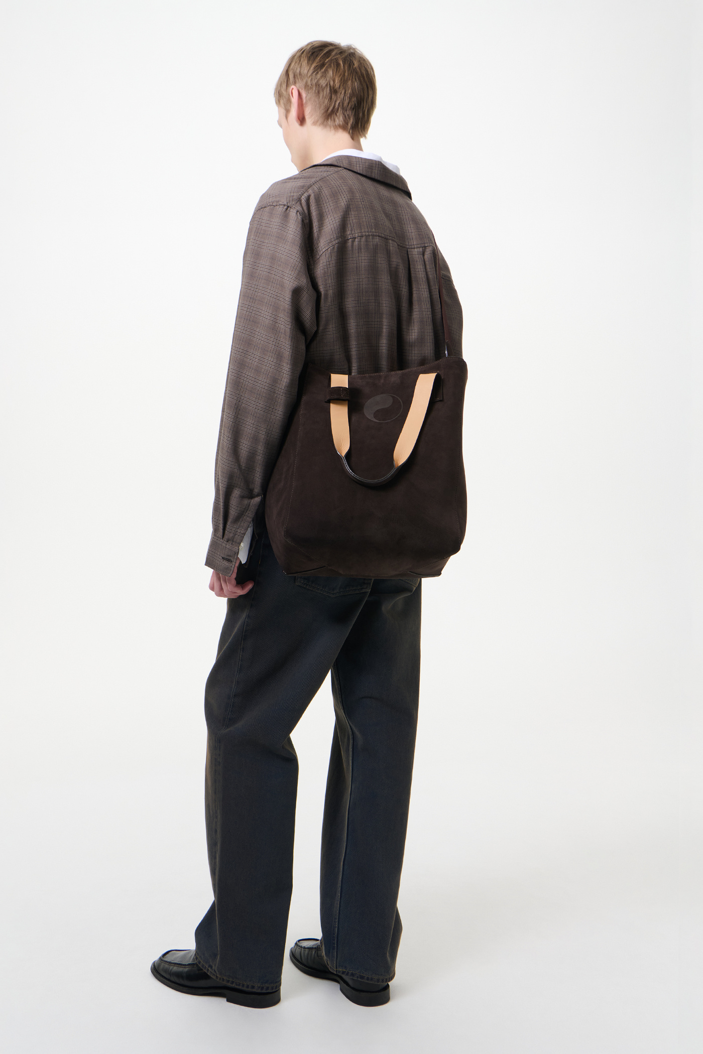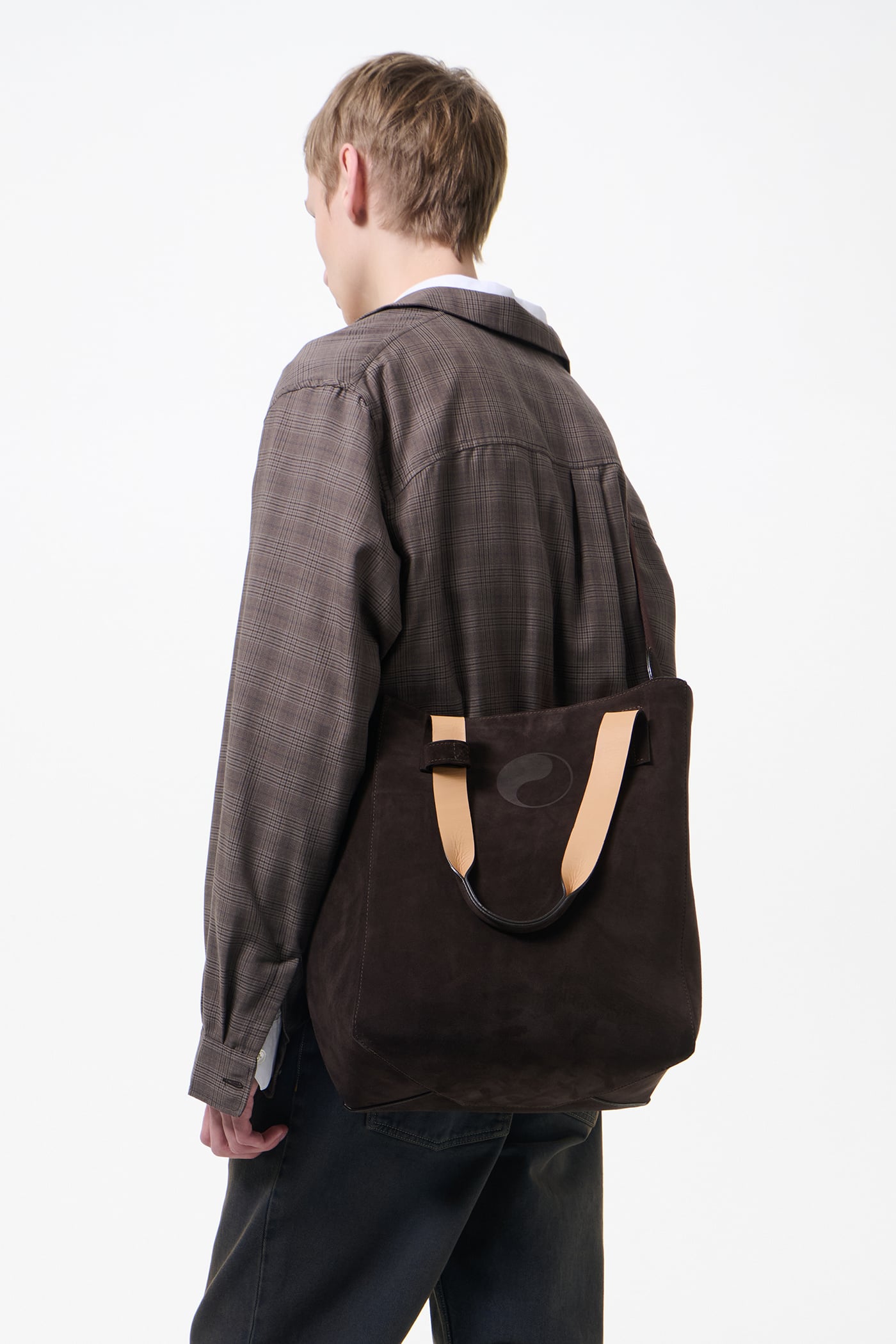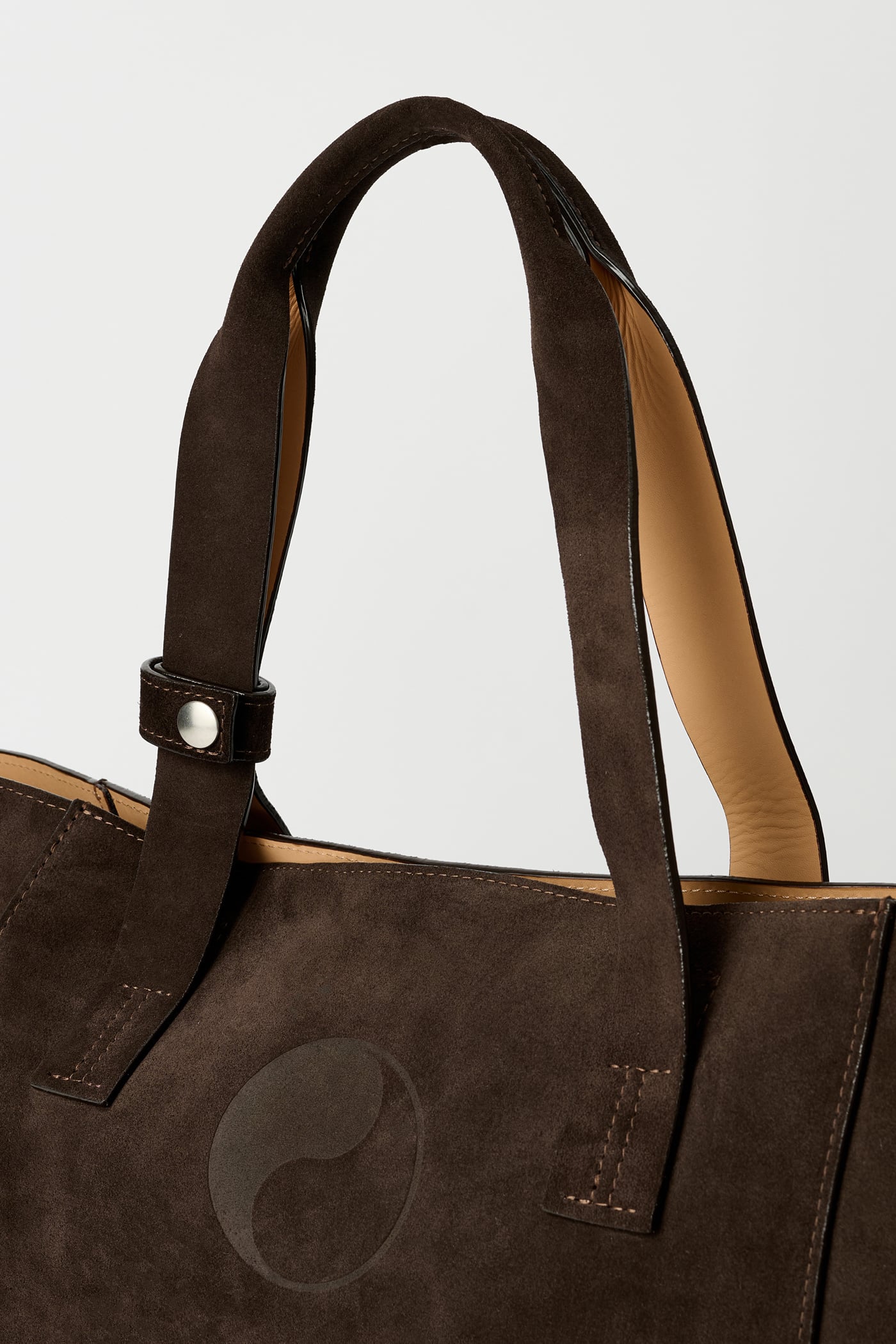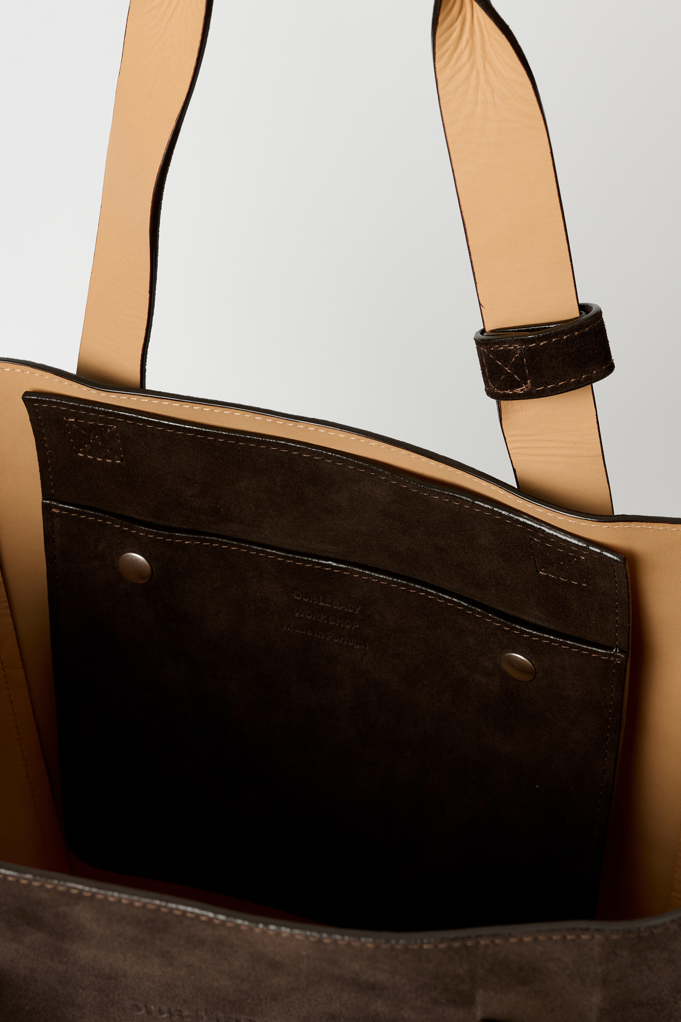 Our Work Tote in Deep Brown Suede. Produced in Italian suede, the Work Tote features a large central compartment, an inner pocket with double snap closure, patched and stitched leather carry handles, a detachable shoulder strap, debossed Yin Yang and Our Legacy logos, and is fully leather lined.