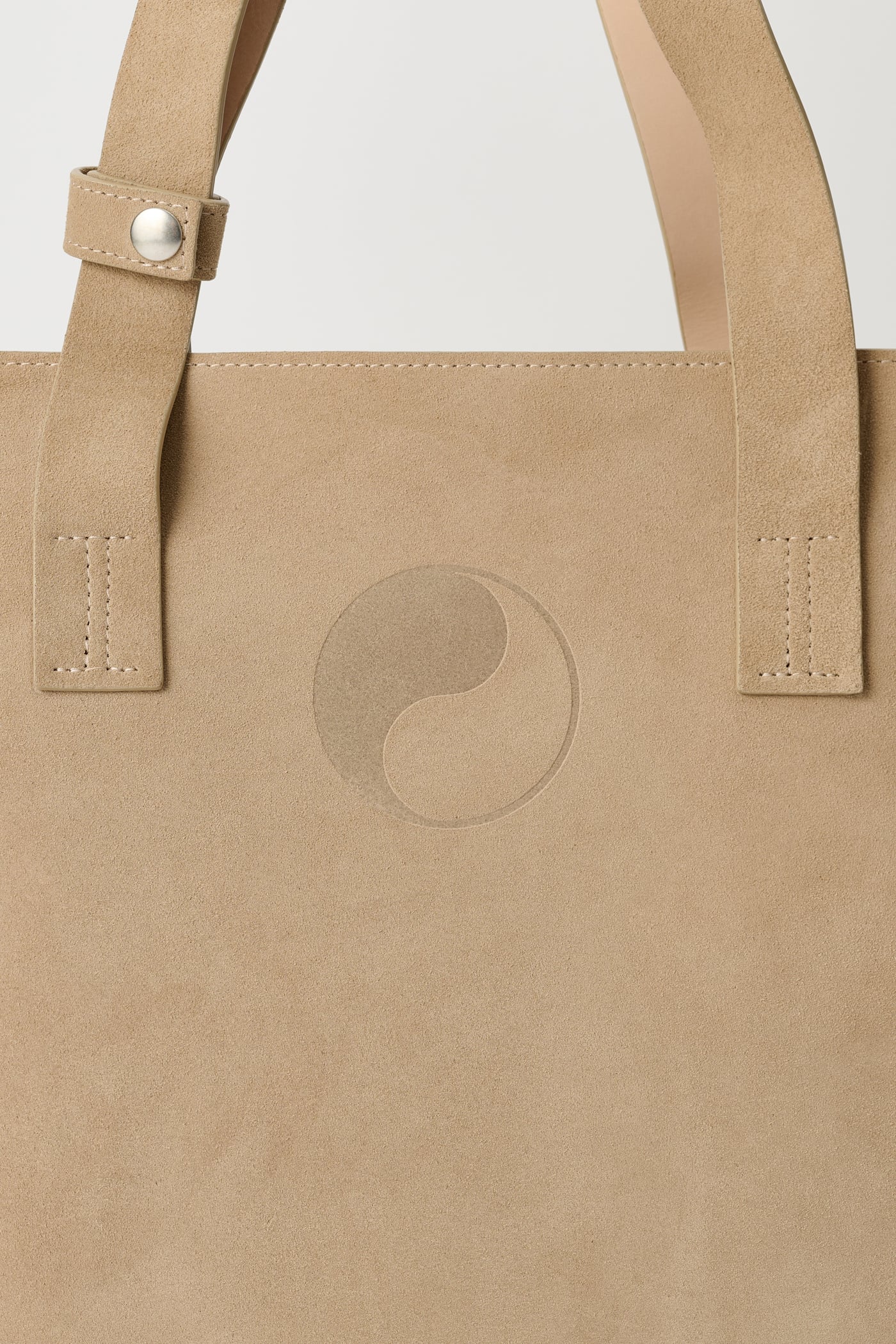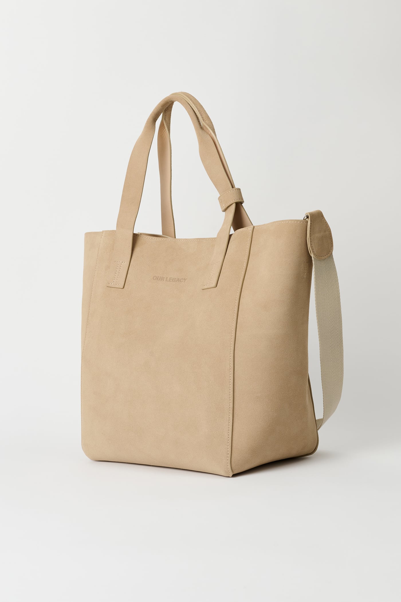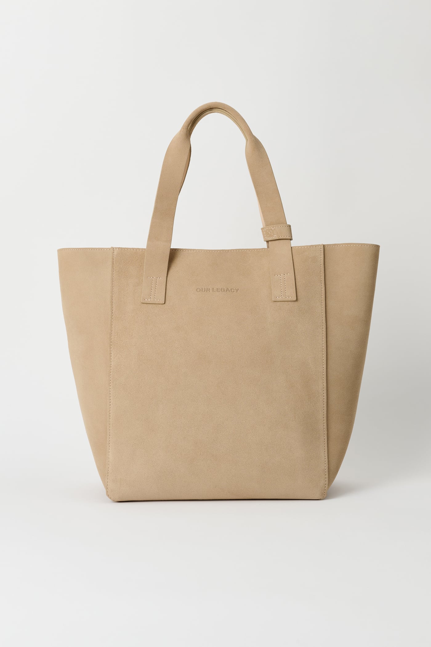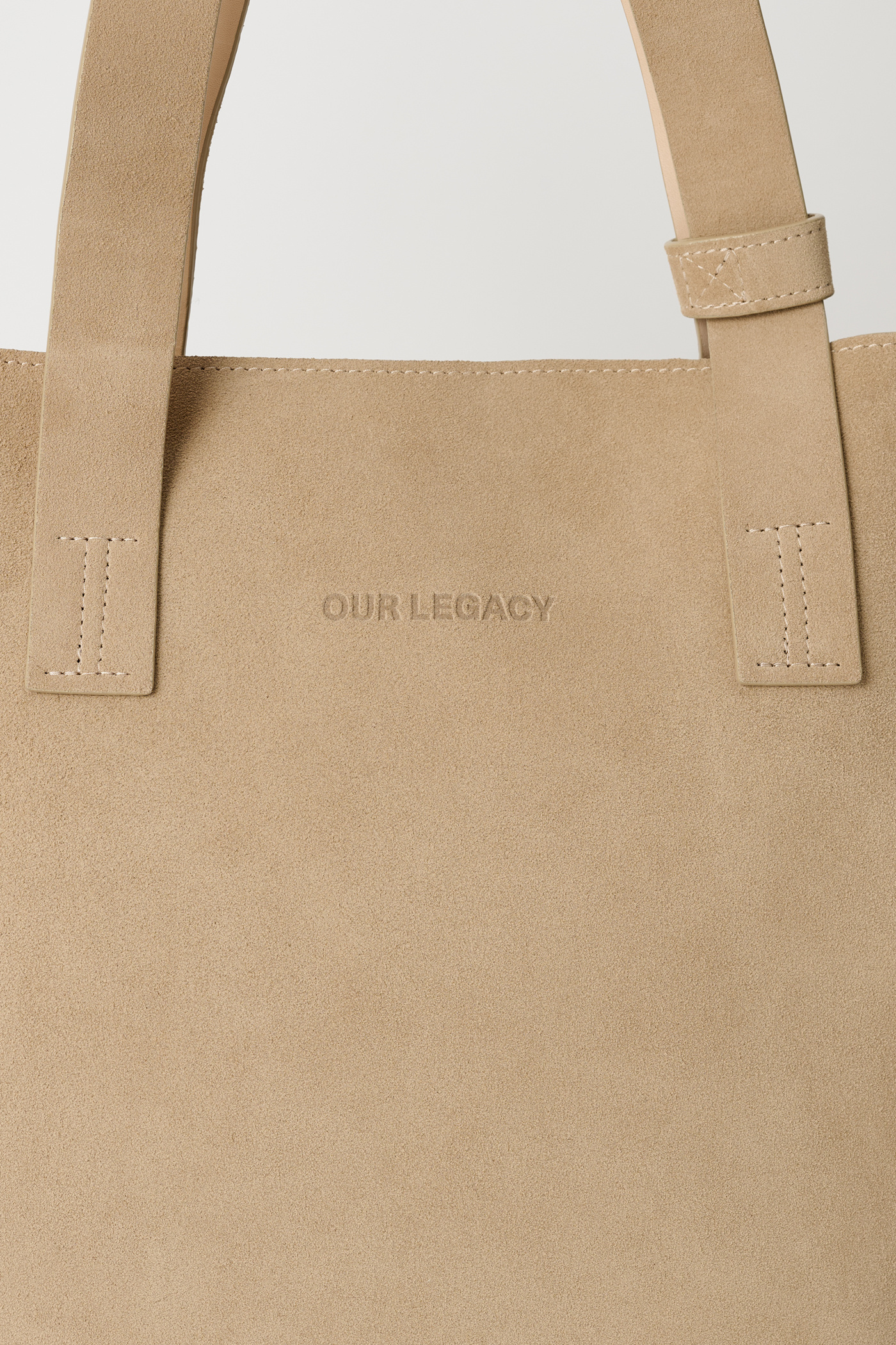Our Work Tote in Sand Suede. Produced in Italian suede leather, the Work Tote features a large central compartment, an inner pocket with double snap closure, patched and stitched leather carry handles, a detachable shoulder strap, debossed Yin Yang and Our Legacy logos, and is fully leather lined.