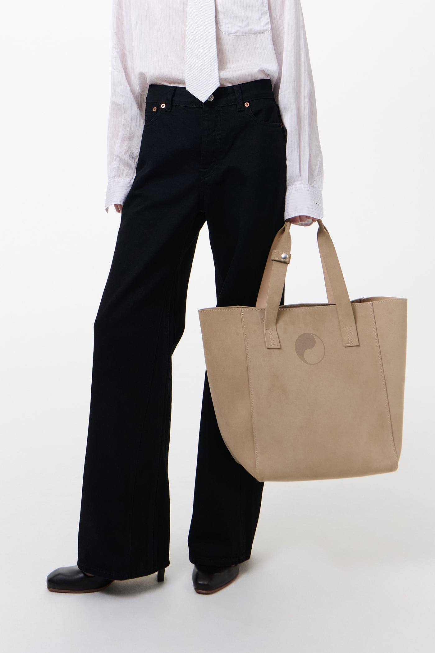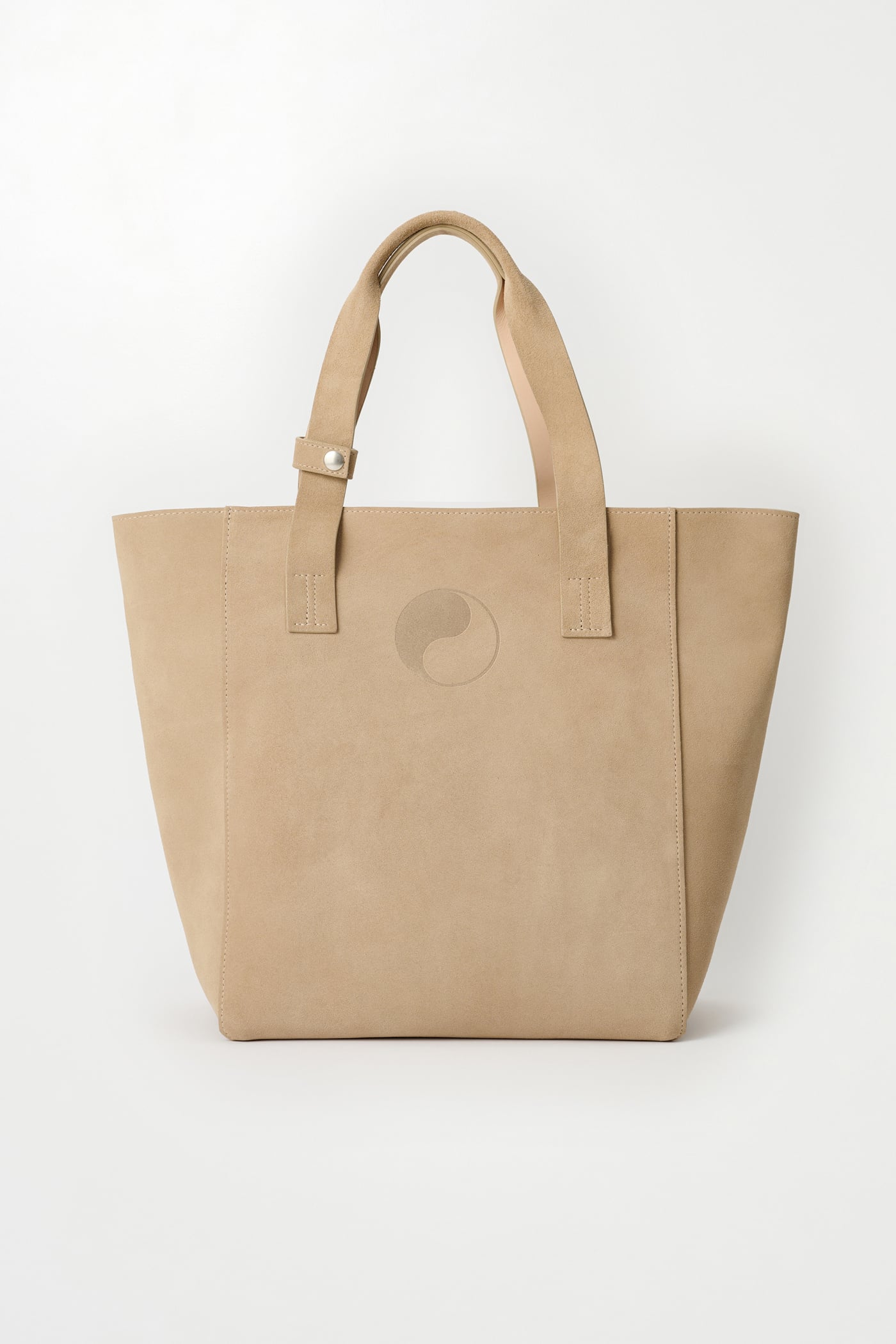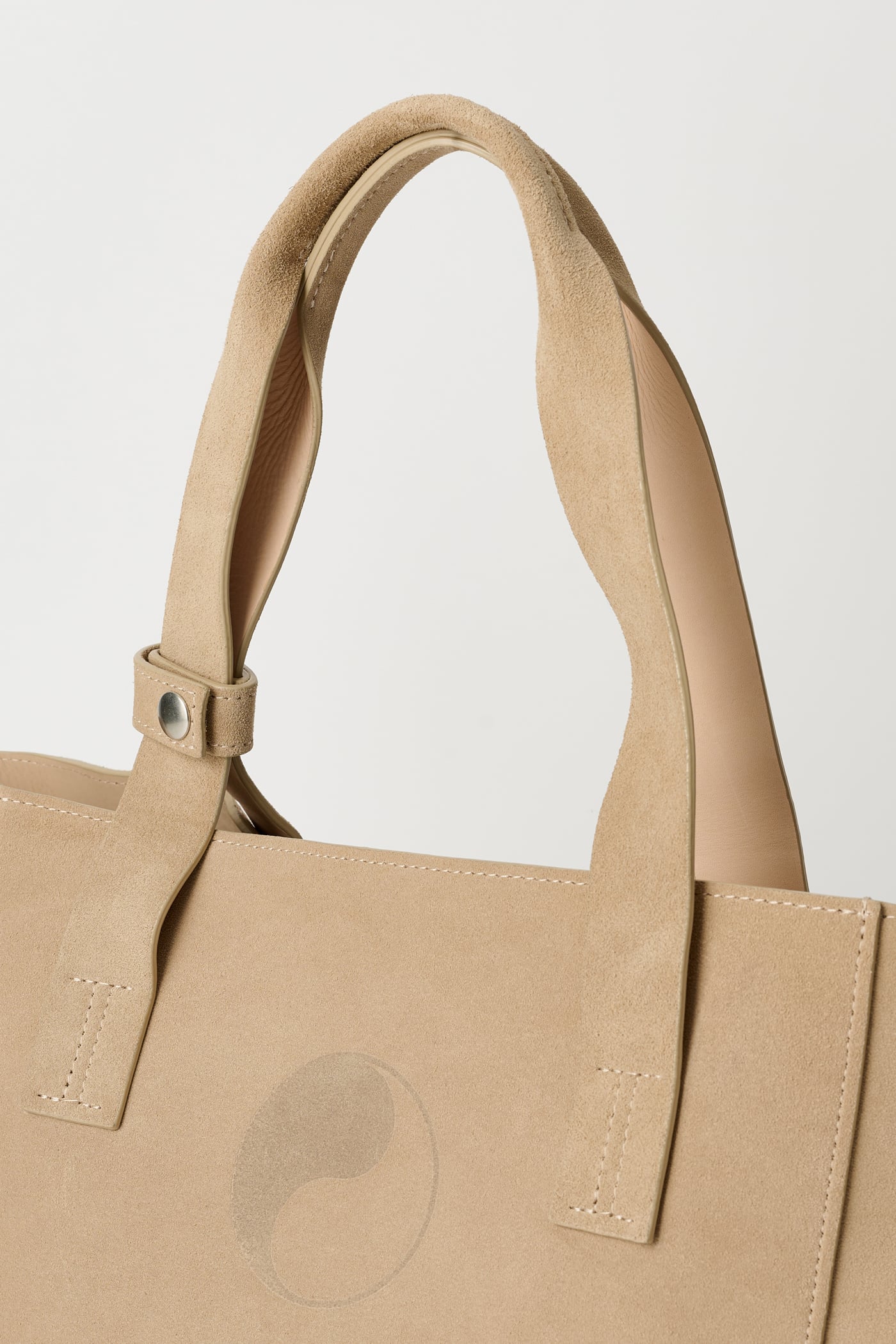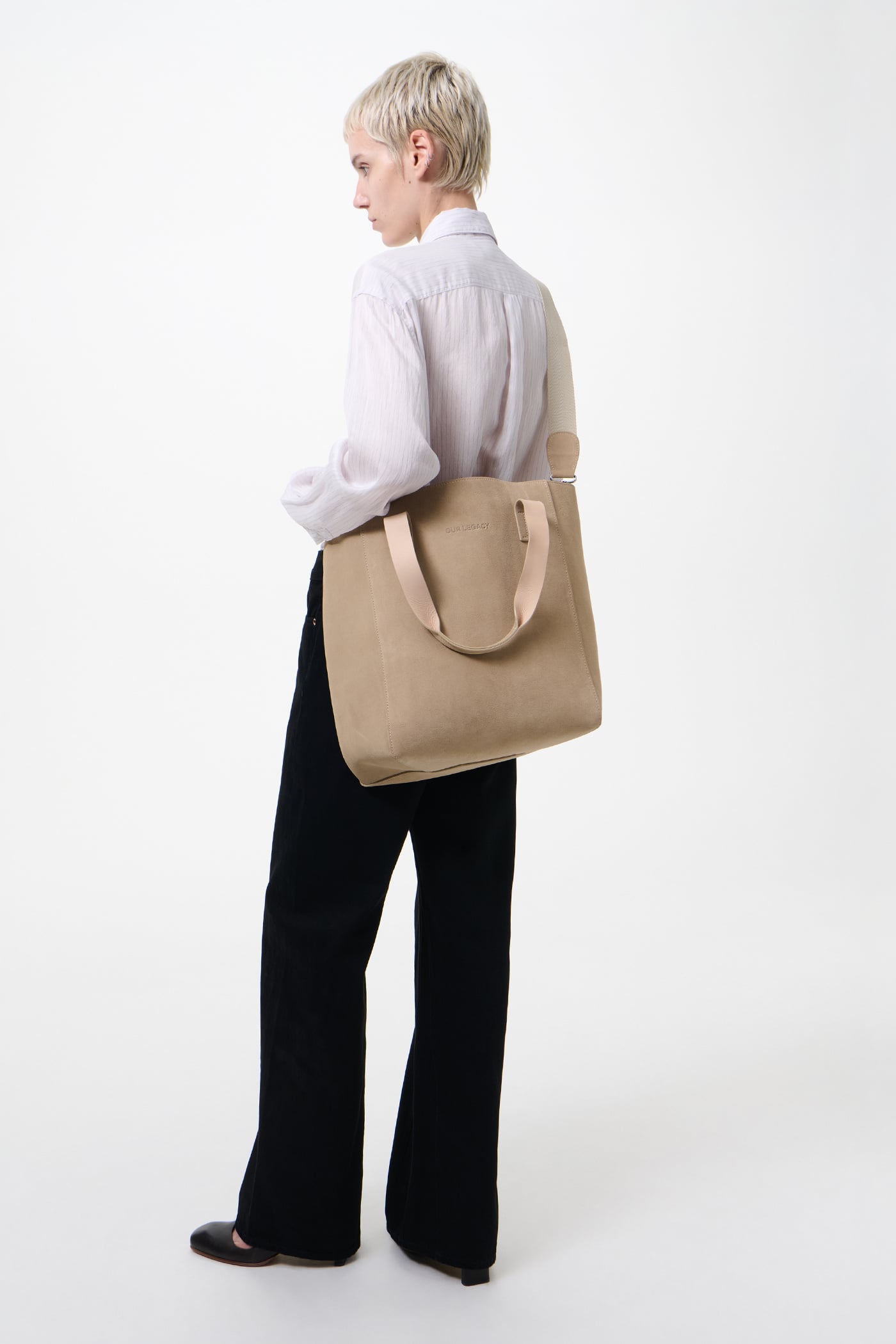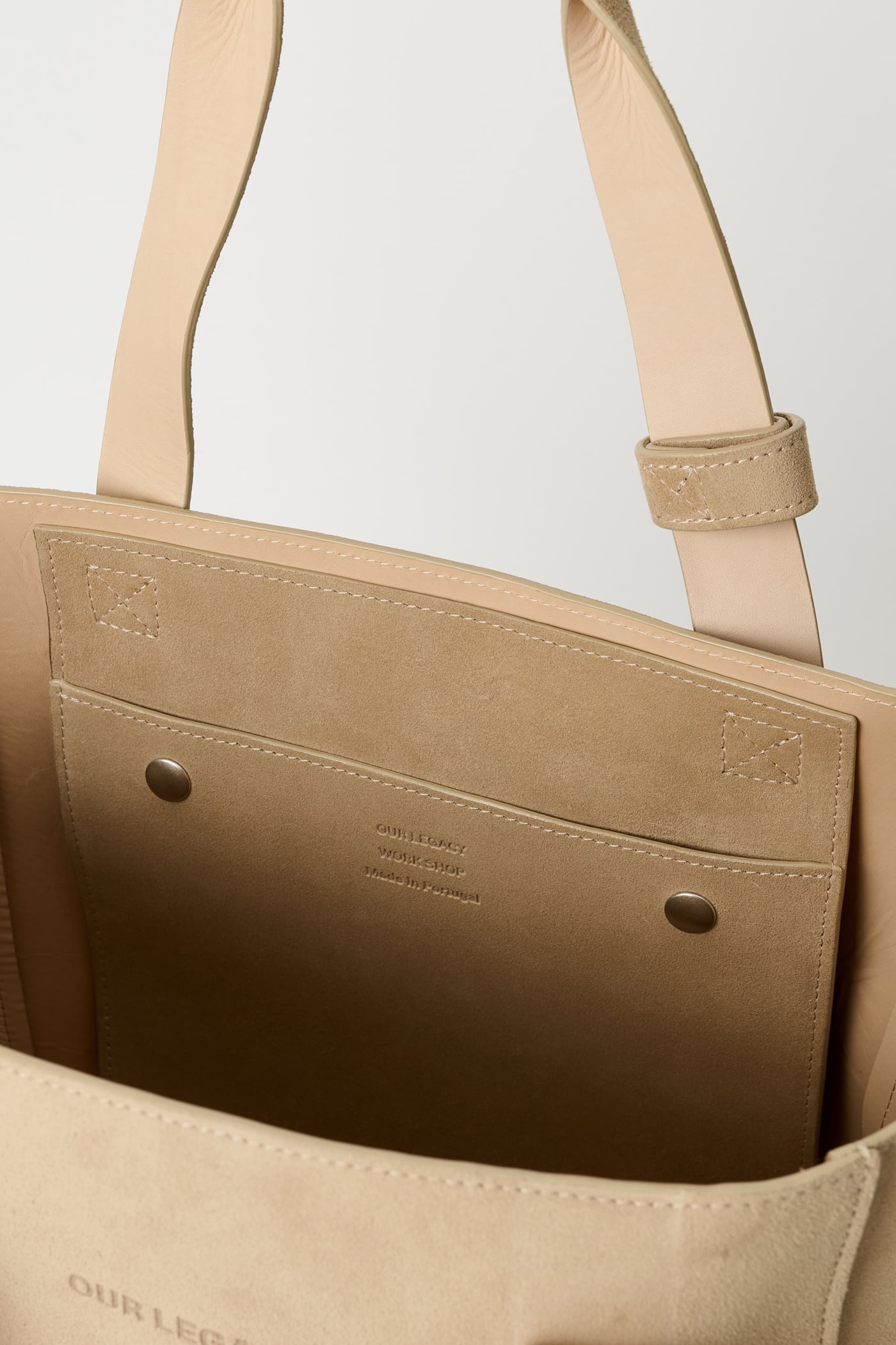 Our Work Tote in Sand Suede. Produced in Italian suede leather, the Work Tote features a large central compartment, an inner pocket with double snap closure, patched and stitched leather carry handles, a detachable shoulder strap, debossed Yin Yang and Our Legacy logos, and is fully leather lined.
