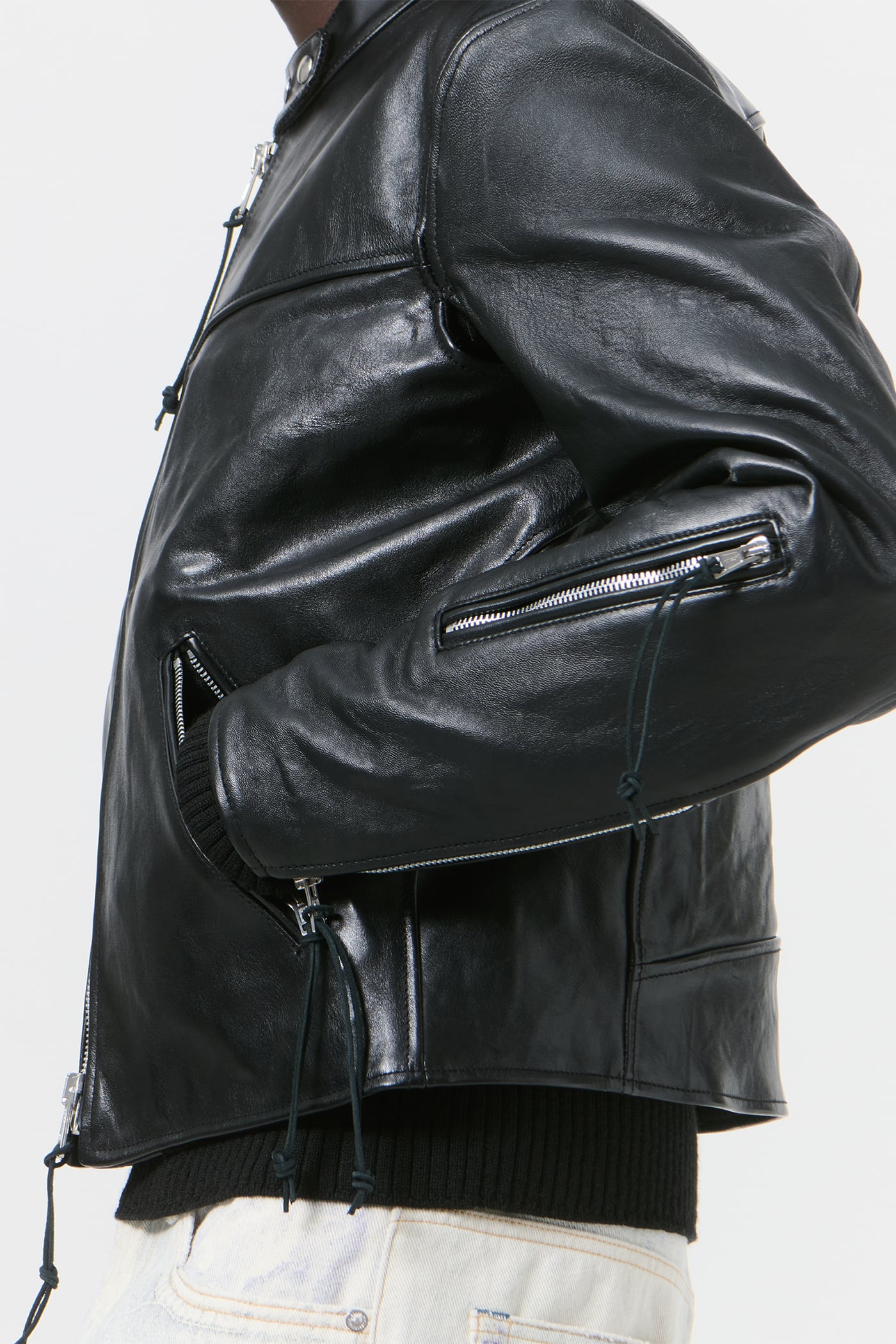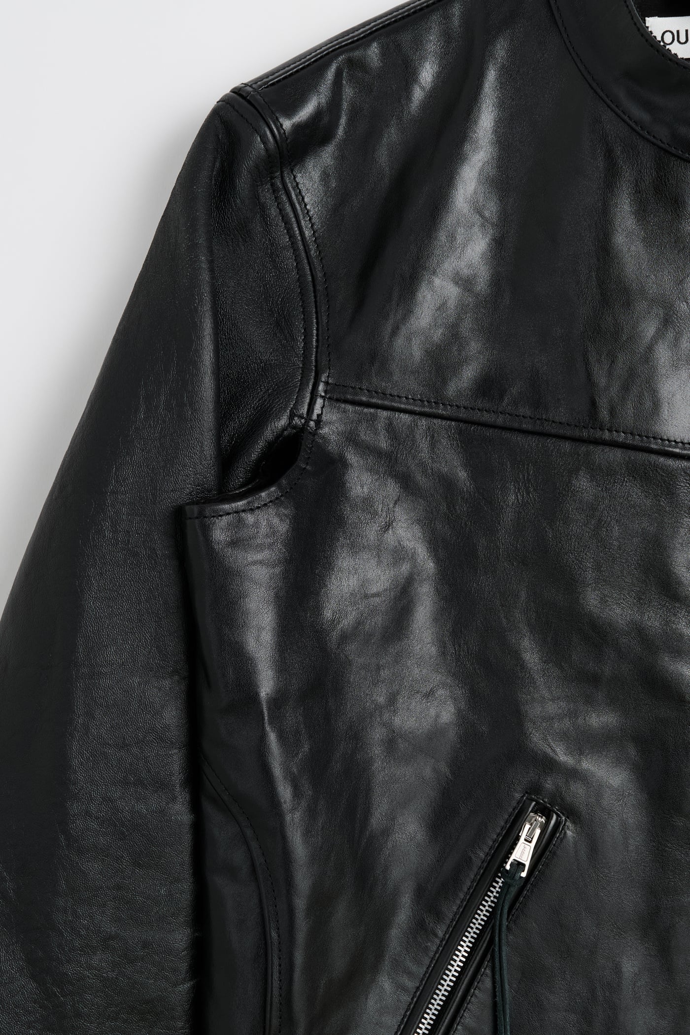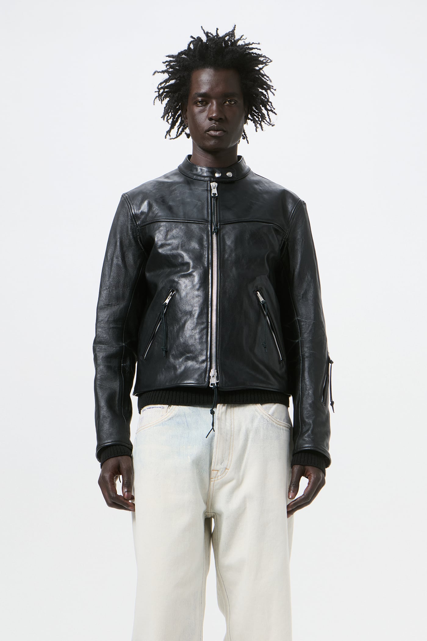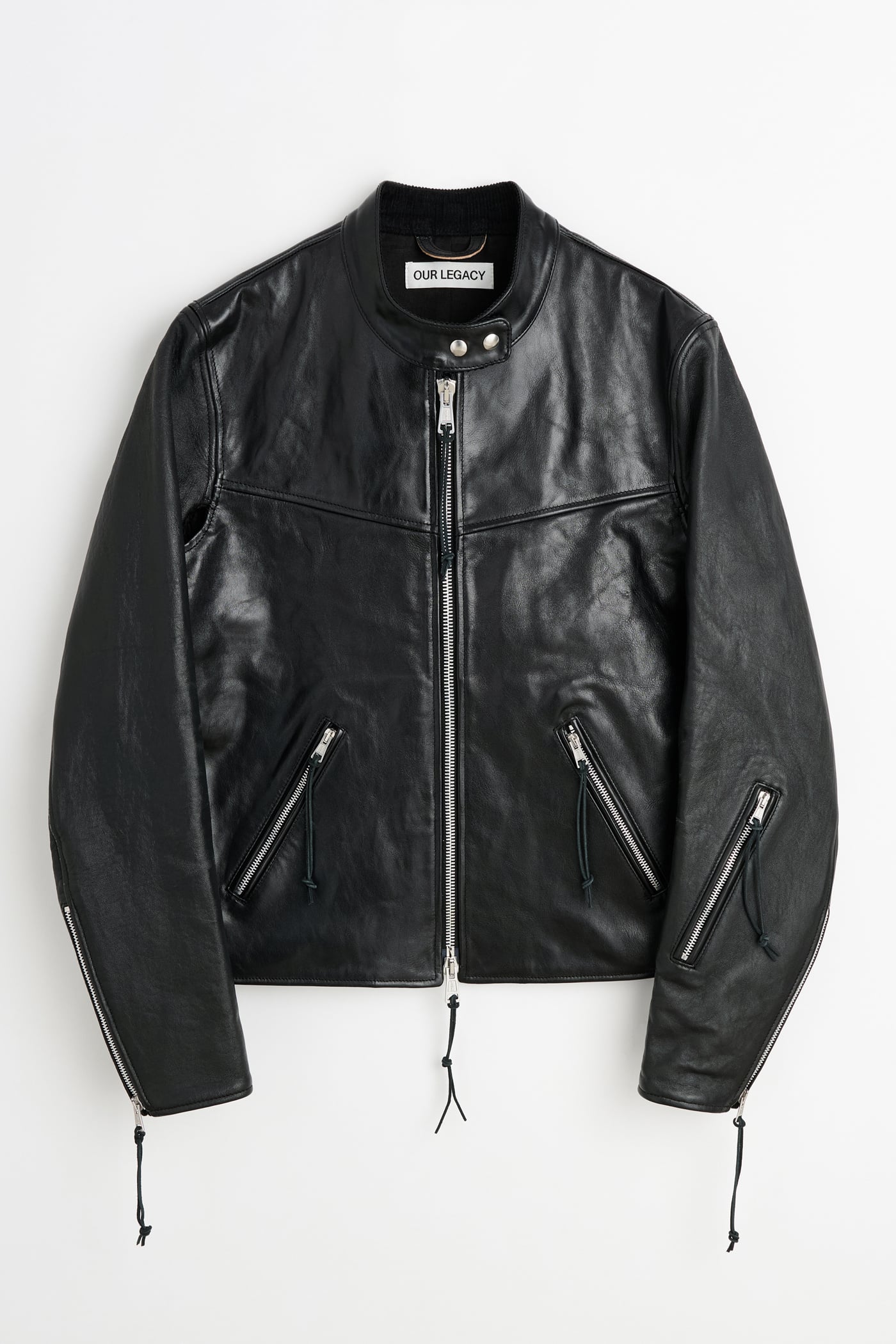 Our Yurei Jacket in Whisker Black Buffed Lambskin. Produced in Italian vegetable-tanned full grain lamb and cow leather with a buffed finish, the Yurei Jacket has a shaped fit with biker-shaped sleeves that separate from the armhole at chest level to emphasize the silhouette. It features a stand-up collar with snap button closure, a zip guard along the center front, double jet pockets with zip closures, leather cord zip pullers, an undercollar in cord and a metal Our Legacy rivet.