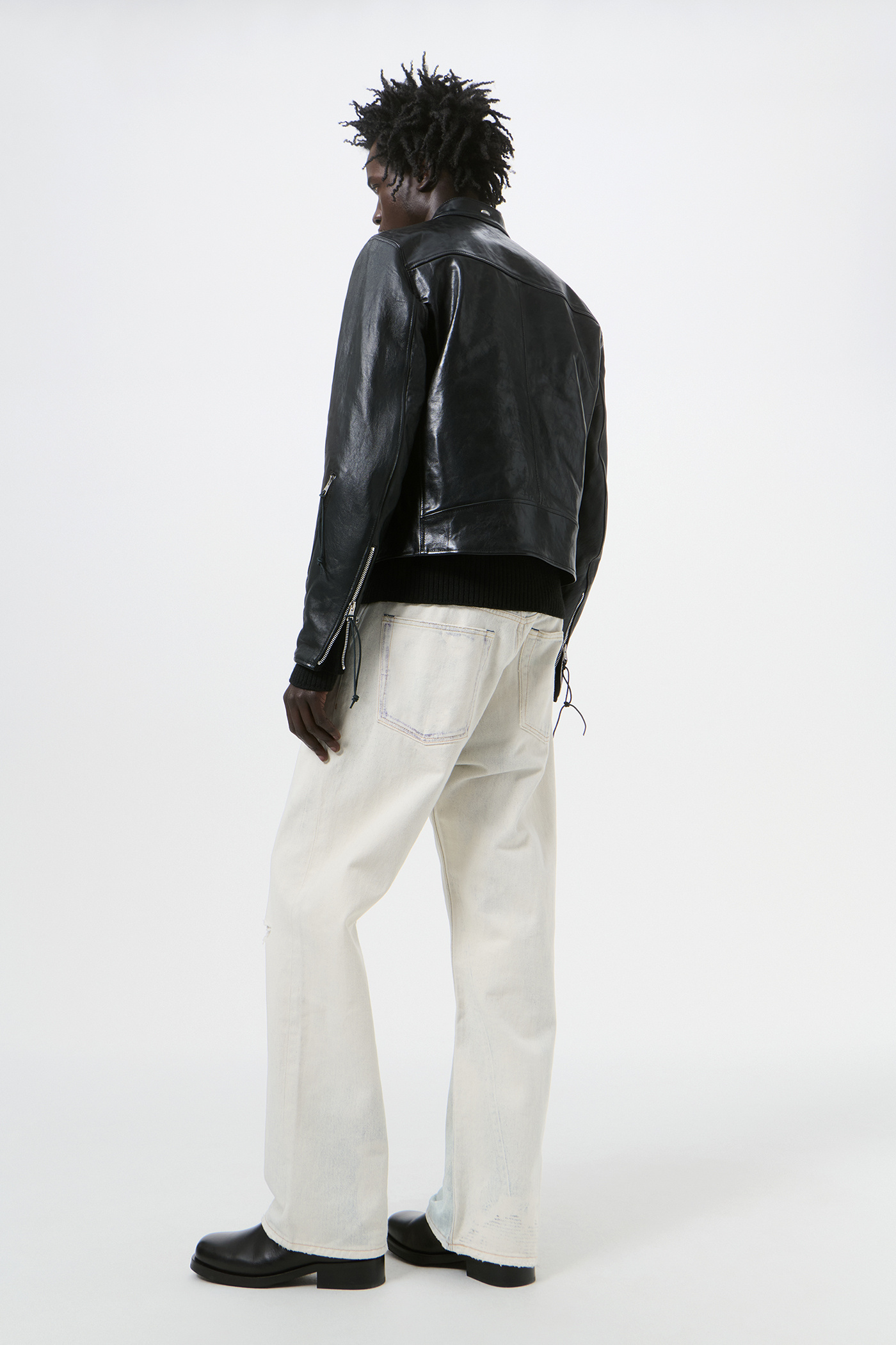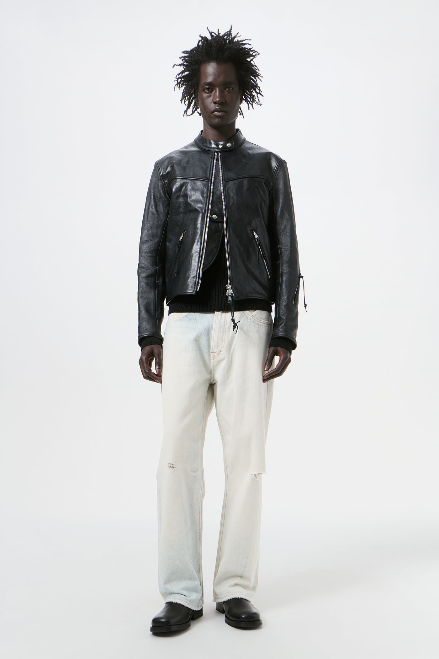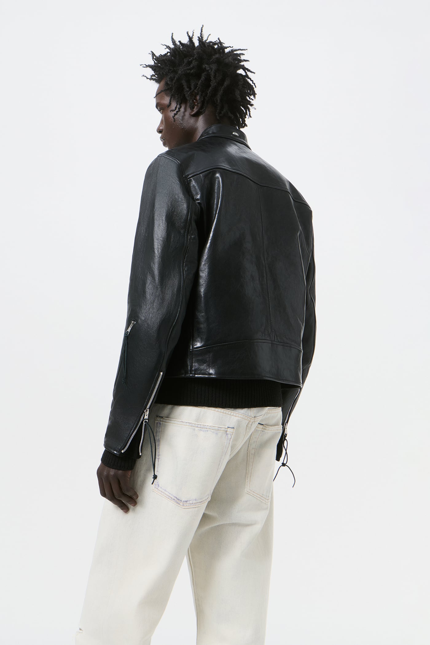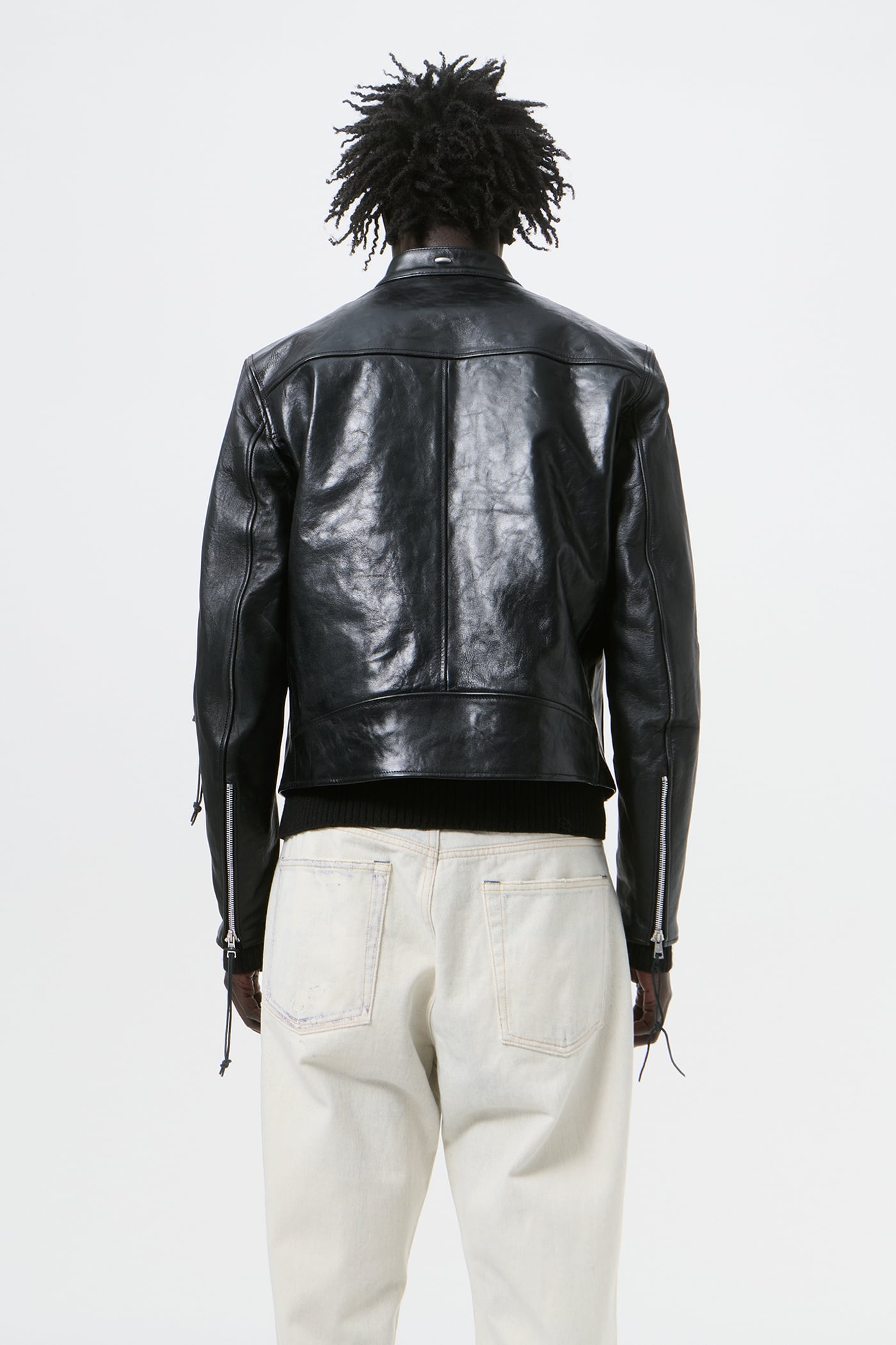 Our Yurei Jacket in Whisker Black Buffed Lambskin. Produced in Italian vegetable-tanned full grain lamb and cow leather with a buffed finish, the Yurei Jacket has a shaped fit with biker-shaped sleeves that separate from the armhole at chest level to emphasize the silhouette. It features a stand-up collar with snap button closure, a zip guard along the center front, double jet pockets with zip closures, leather cord zip pullers, an undercollar in cord and a metal Our Legacy rivet.