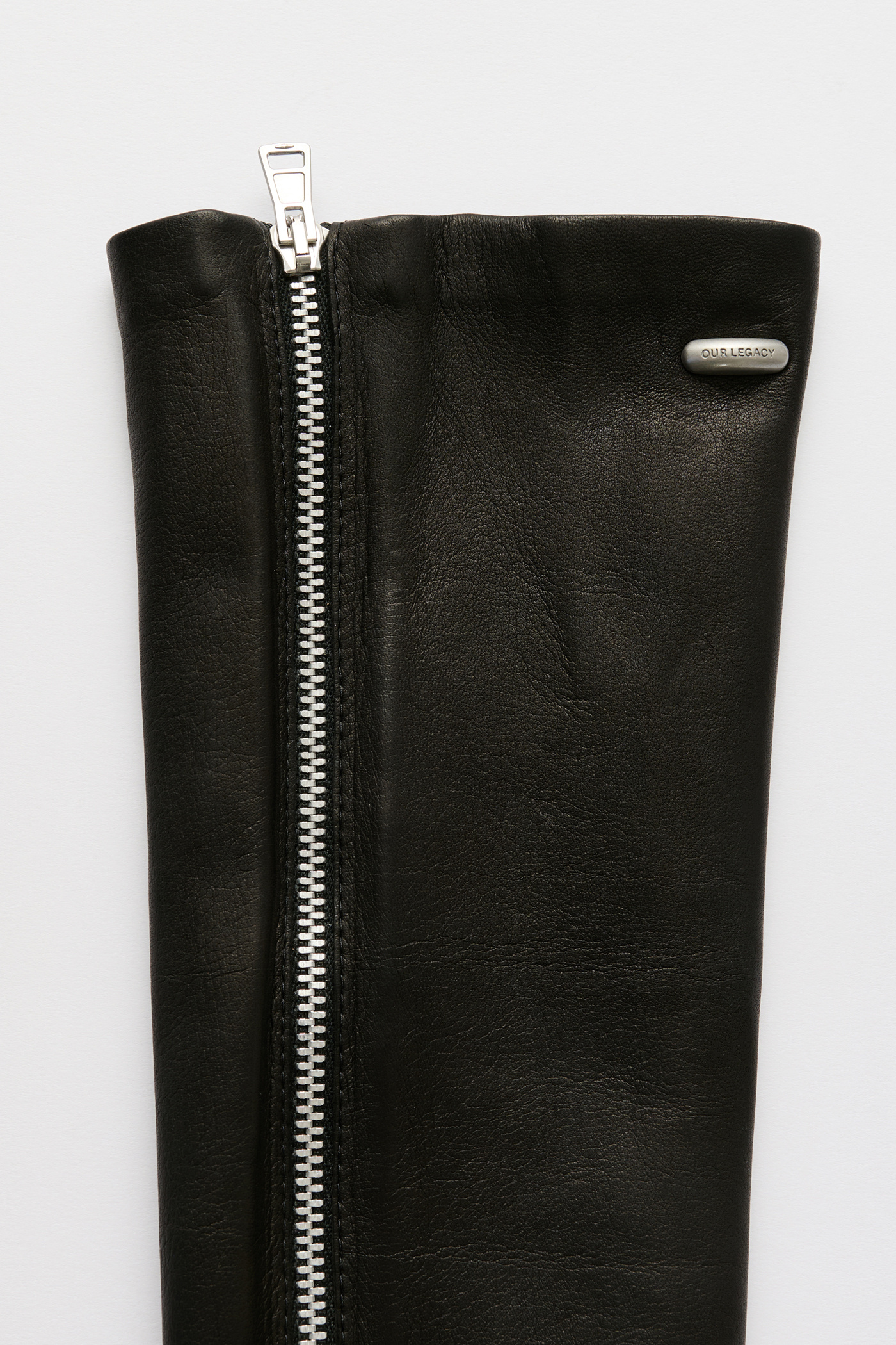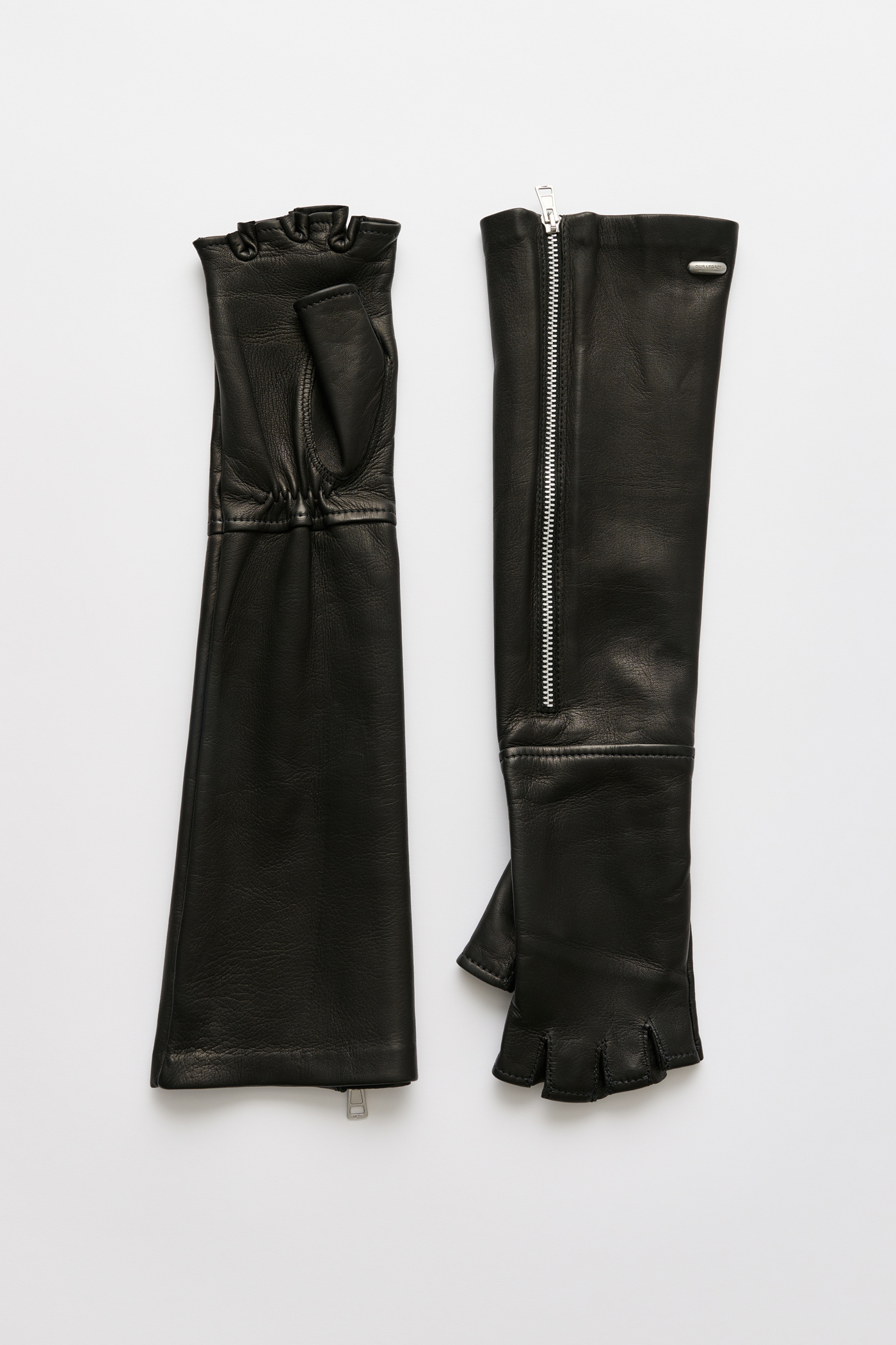 Our Zipped Dining Glove in Black Nappa. Produced in Italian nappa lamb leather with a wool lining, the glove is based on our 'Her Glove' silhouette. It features a elbow length sleeve that is adjustable in width via a zipped vent with a gusset and is finished with a metal Our Legacy rivet.